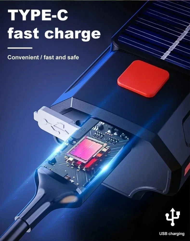 Solar Power Bike Headlamp with Horn USB Charging LED Bicycle Light 250LM Waterproof Bike Flashlight Bicycle Accessories Features: 1.Dual-Beam Illumination: Equipped with both high-beam and wide-angle lights, this bike headlight ensures long-distance visibility and a broad field of illumination for safer riding in all conditions. 2.Hybrid Charging Options: Featuring Type-C USB and solar charging capabilities, this bicycle headlamp offers versatile and convenient recharging options, ensuring you're never left in the dark. 3.Strap-On Installation: The LED bicycle light's band-style fitting system allows for quick and easy mounting, making it user-friendly for cyclists of all skill levels to attach and remove as needed. 4.Light & Horn Combo: This MTB road bike front lamp and horn setup saves handlebar space and reduces the overall weight on your bicycle, streamlining your ride and keeping essential functions within easy reach. 5.Weatherproof Durability: With its excellent sealing properties, this bike handlebar flashlight stands up to rainy conditions, giving you the confidence to ride in wet weather without compromising your light's performance. Specification: Origin: Mainland China Body Material: ABS Color: Black, Red, Blue Body Size (Excluding Base) : Approx. 94mm (3.70in)*40mm (1.57in)*38mm (1.50in) Net Weight: About 83g Lamp Bead: 2*LED Headlight Gear: High-Light - Low-Light - Flashing Lamp Brightness: 250LM Speaker Decibel: 120bd Battery Capacity: 1200mAh (Delivery Includes Battery) Charging Mode: Type-C USB Charging Note: Due to the different monitor and light effect, the actual color of the item might be slightly different from the color showed on the pictures. Thank you! Please allow 1-2cm measuring deviation due to manual measurement.