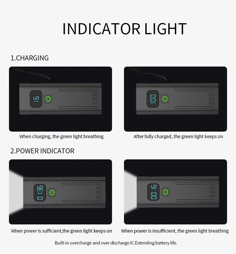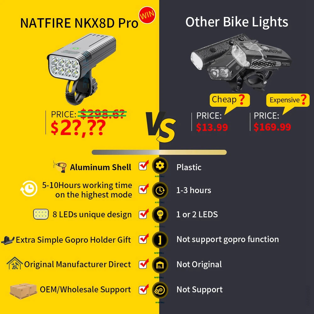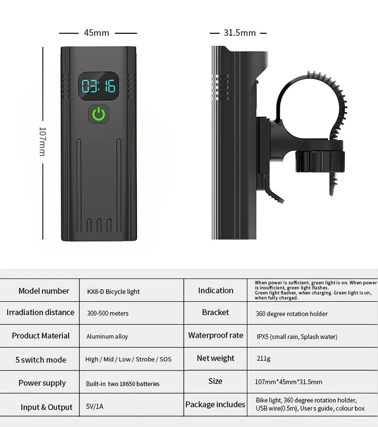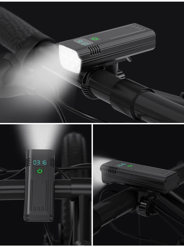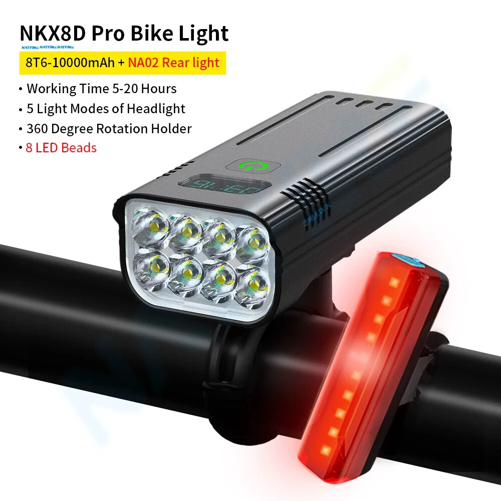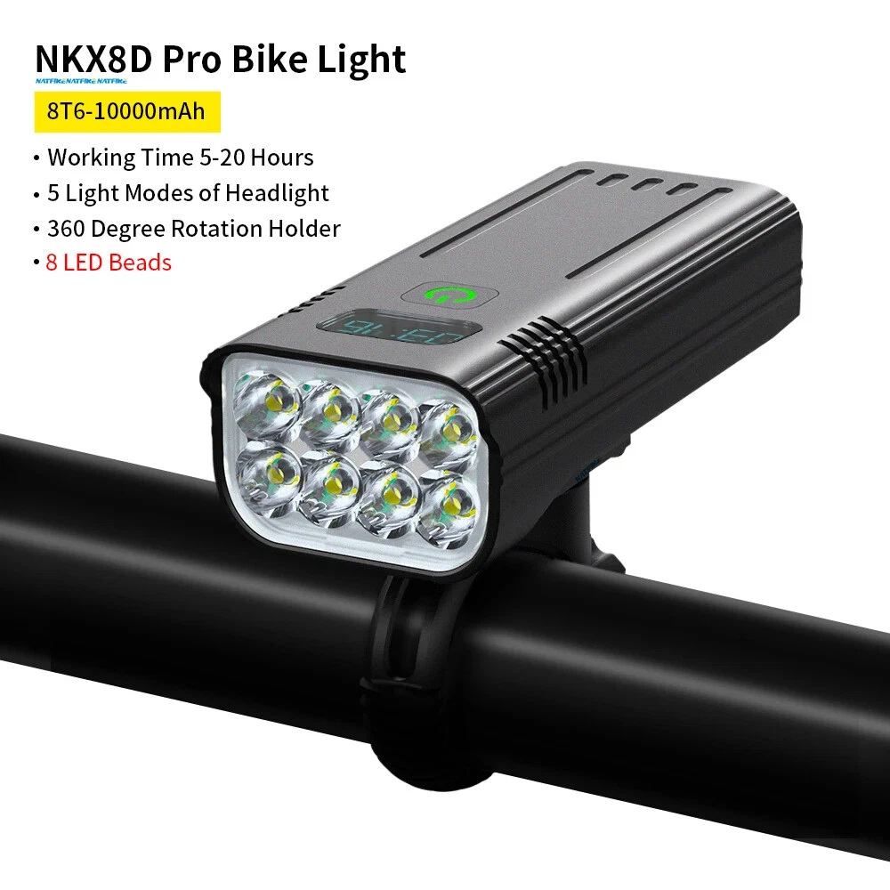 10000mAh 5000LM MTB Bicycle Front Light Bicycle 8*LED Front Bike Light Headlight Bike Accessories USB Rechargeable 【SUPER BRIGHT BIKE LIGHT TO KEEP YOUR SAFE】 Adopt of extra bright LED bead for Natfire bike lights set, provide 1000-5000 lumen and up to 300+ feet beam length ,You will be shocked and amazed at how bright it is! Five light modes- High, Medium, Low, strobe and sos light modes. so you can see clearly no matter on a urban road or on a dark lonely country road, excellent to keep you safe at night. 【Battery Power Display & 360° Rotation】 The Bicycle Front Light is designed with battery power display function, showing the actual time of remaining battery, which can help you to master the usage and charging time more conveniently. Moreover, the natfire mount bracket for the headlight is 360° rotatable, allowing you to adjust to the suitable angle according to actual situation during cycling. 【USB RECHARGEABLE】 Save your time to replace batteries every week. Never waste money on batteries anymore. Natfire bike light and optional red rear light come with a CHARGING CABLE that charges from your computer, power bank or any device with a USB port. 10000mAh large capacity and Built-in intelligence IC can prevents overcharge or over discharge and extend battery life. This bike headlight has a Runtime of 7+ hours on the highest setting and Runtime of 15+ hours on the lowest setting. (Depends on the battery you choose, larger battery capacity, longer runtime) 【WE THINKING MORE FOR YOU】 No any tools needed making it easy to install. Easily mounted and secured with the adjustable mount. it's very easy to take off from bike for recharge and prevent thieves for stealing, portable design for rechargeable bicycle headlights.Water resistant rated to IPX5 - Protected against splashing water from any angle. Product Parameters Model: Bicycle Light NKX8D Pro - Digital Display Version Material: Aluminum shell Mode: 5 Light Modes Working voltage: 3.7V Waterproof: IPX5 Range: About 100-300M Battery:10000 mAh Surface craft: Abrasion resistant anodizing Tips: If you do not use it for a long time, please charge it every three months. Do not shine into the eyes. Keep away from flammable and explosive materials. Waterproof grade is IPX5. Do not immerse the bicycle light in water. Place the bicycle lights correctly. Keep out of reach of children to avoid accidents.