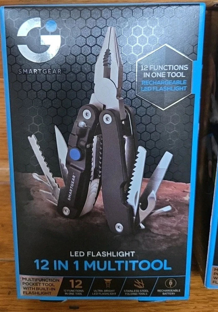 The SMARTGEAR Rechargeable Flashlight Multi-tool (Model: STG-6336-KB) is a versatile stainless steel tool featuring 12 functions in one compact design. It includes a stainless steel blade, rechargeable flashlight, and multiple tools in a single piece. This multi-tool, weighing 0.5 lbs, is brand new in its original packaging.
