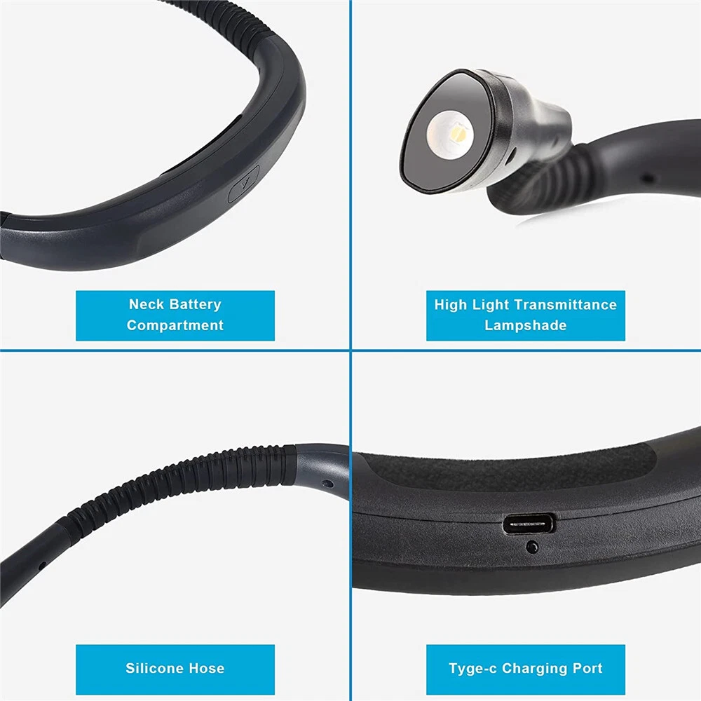 USB Rechargeable LED Neck Light Book Light for Reading in Bed Crafting Camping USB Rechargeable LED Neck Light Book Light for Reading in Bed Crafting Camping [9 Lighting Modes] 3 color temperature and 3 adjustable brightness levels, each head has an independent switch, you can choose a comfortable environment for reading, knitting, camping or repairing, etc. according to your needs. [USB Rechargeable] USB Type-C rechargeable, built-in 1000mAh high-capacity lithium battery, a full charge takes about 2.5 hours, high brightness can last 4-8 hours, low brightness can last 40-80 hours. [360° Flexible and Durable Arms] Made of high-quality rubber silicone, the neck light has durable and flexible arms, easy to choose the best angle to meet your various needs. [Intimate Design] Special narrow beam angle (90°) design. Won't disturb your sleeping partner when you want to read alone. [Compact and Portable] Weighing only 4.9 ounces, the bendable neck light doesn't require much space and fits easily into carry-on luggage, making it very convenient to carry around. Neck Reading Light This LED neck reading light has 3 color temperatures and 9 brightness levels, with a flexible arm so you can easily adjust to the proper angle and brightness. Helping you free your hands! Rechargeable 1000mAh built-in battery. Up to 80 hours available and no more frequently hunt for plug. The multifunctional neck light can be used for camping, reading, writing, knitting, repairing, and night running. Convenience to your life, light up your life! 3 Light Modes and 9 Levels Adjustable 9 brightness levels. Each mode has three gears that provide brightness variation from 10% to 100% bringing different brightness levels to meet different uses and scenarios. Rechargeable and Long-Lasting Rechargeable built-in 1000mAh huge capacity battery to provide brighter & longer light for you. After a full charge, it will last 6-80 hours. USB Type-C charging instead of common micro USB. It is reversible, so you will no longer have to flip the connector around multiple times looking for the correct orientation. With a universal Type-C interface, so you don't need to prepare an additional charger for the reading light. Package Included: 1 x Neck usb light 1 x Type-c usb cable 1 x Manual Listing and template services provided by inkFrog