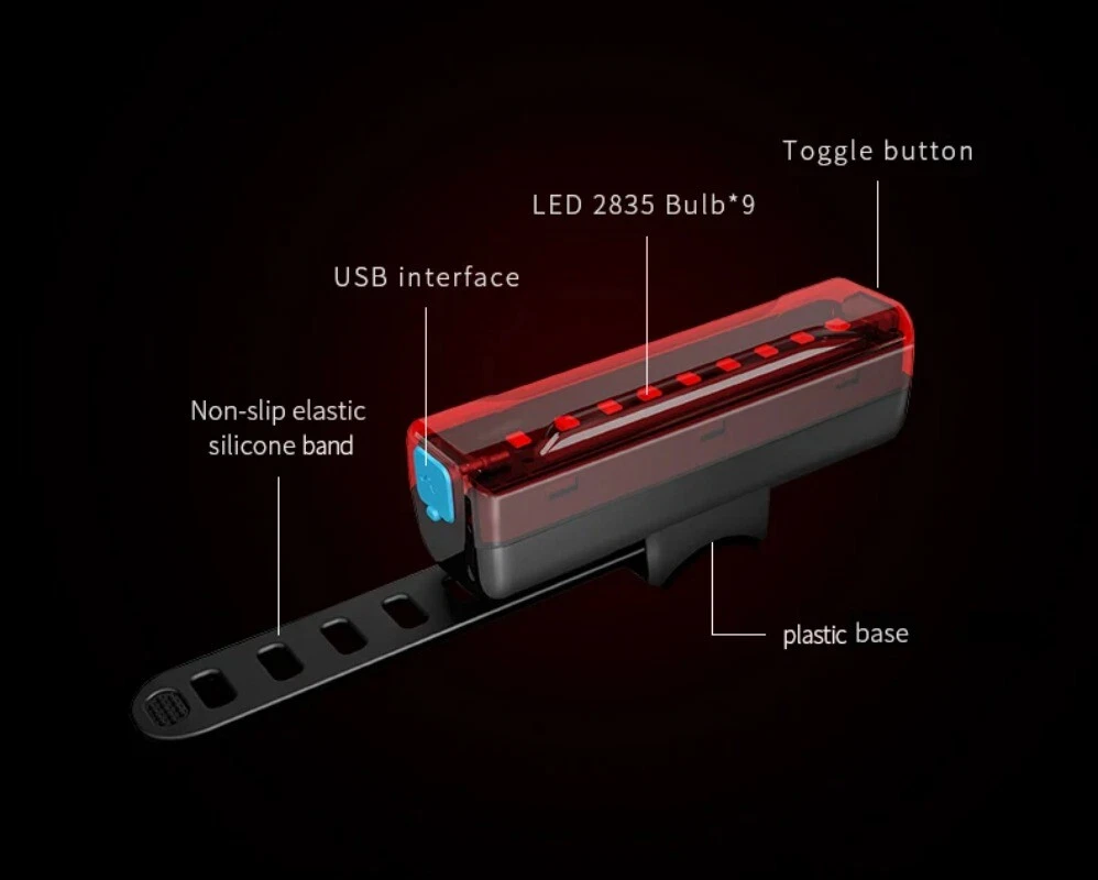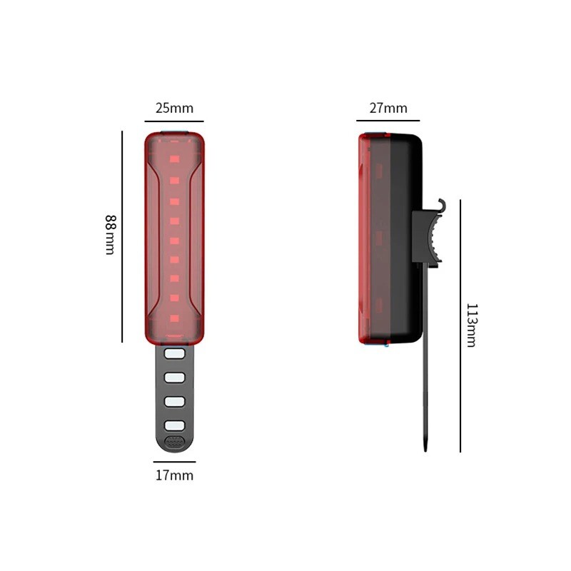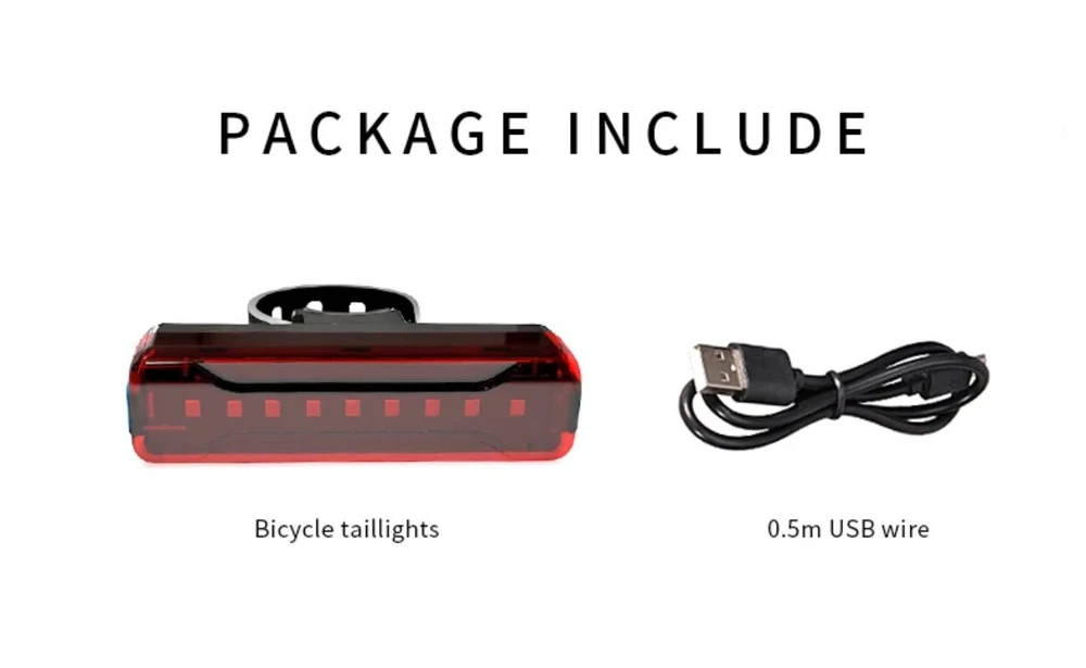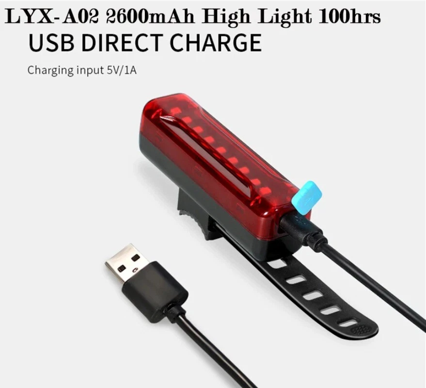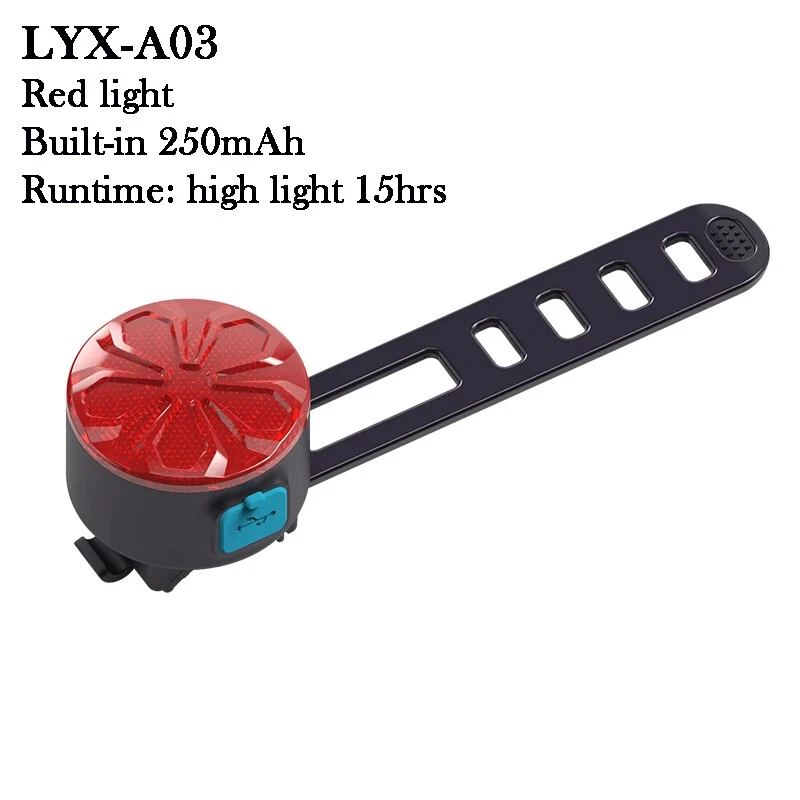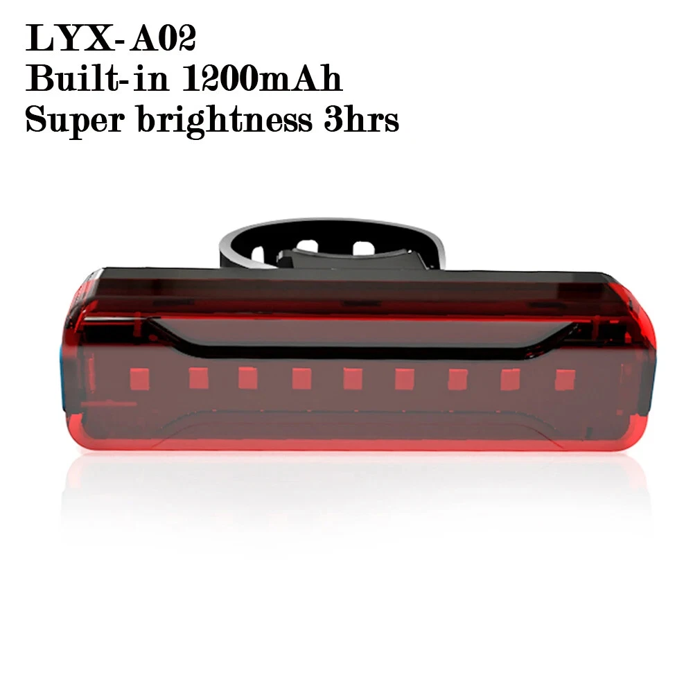 High Light 50hrs Bike Taillight USB Rechargeable Bicycle Tail Lamp 18650 2600mAh Red Cycle Rear Light Night Riding Accessories LYX-A02 is a very long working time usb tail light for bike, you no need to charge it often. USB Bicycle tail lamp specification parameters: Product model: LYX-A02 Bike Rear lamp Bulb type: 9pcs 2835 red LED beads Luminous color: Red Lamp bead wavelength: 620nm Shell color: black background and red cover Product material: PC plastic Fixation method: silicone bandage Exposure range: 240 degrees Beam angle: 120 degrees Power supply: built-in 1*18650 Battery capacity: 1200mAh / 2600mAh optional Charging input: 5V/1A (do not use 9V charger, it may damage the equipment) Working voltage: 3.7V Charging time: 2.5hrs (1200mAh) / 5hrs (2600mAH) Discharge time: 25hours (1200mAh) / 50hours (2600mAH) Discharge time: super bright 3hours (1200mAh) / 6hours (2600mAH) Switch type: push switch Dimming mode: highlight, running lamp 1, flash, running lamp 2, breath, (long press 2 seconds to turn off) Product specification: length 88mm, width 27mm, thickness 25mm, strap length 113mm Charging and discharging protection: built in IC for overcharging and discharging to prolong battery life Packing method: OPP bag / color box Waterproof grade: ipx5 (rain proof, splash proof) Net weight: 68g (1200mAh) / 77g (2600mAH) Gross weight of plastic bag: 82G (1200mAh) / 91g (2600mAH) Gross weight of color box: 95g (1200mAh) / 104g (2600mAH) Dimension of outer box: length 365 * width 278 * height 275mm (100 sets of box gauge) Weight of outer box: 10.6kg (100 sets) Product accessories: tail lamp, 0.5m USB cable, OPP bag / color box. Advantages of LYX-A03 tail lamp for bike: Is a USB rechargeable tail lamp, built-in polymer battery, 6pcs 2835 lamp beads, ipx5 waterproof, delicate and compact, light and durable, 12 work modes options. Warm tips: 1. A02 working time can choose high light 50hrs/high light 100hrs/super bright 3hrs/super bright 6hrs. You can choose the brightness you want according to high light or super bright; 2. Fixed holder, only support installation horizontally; 3. Because of the long working time need large-capacity batteries, A02 taillight is a little heavier, but the installation is solid and you can use it with confidence. Any ideas, welcome to feedback for us. Thank you.