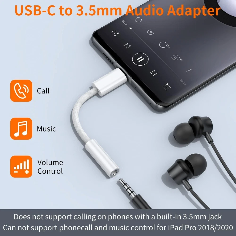 【Multi-function Dongle】: This USB C to aux adapter enable you to listen musics and answer phone call with your headphone as well as supports wire control function, such as microphone volume control, pause and play functions, playing games, plug and play, very easy to use. 【Hi-Fi DAC Chip】: The USB C to 3.5mm audio adapter features a Smart DAC chip. It is low power consumption, excellent and stable decoding performance, and maximum support for 16Bit/48Khz audio sampling rate. The DAC chip can also convert digital audio signals to analog audio signals,providing you with the excellent audio experience. 【Robust & Durable】: High quality ABS shell + Nylon-braided wire materials ensure 20000+ times bending and prevent damage caused by tangling and scratching.Shielded enamel wire can still ensure stable signal transmission with daily use. 【Wide Compatibility】: This Type-C to 3.5mm headphone cable is compatible with most Type-C phones : iPhone 16/16 Pro/16 Plus/16 Pro Max, iPhone 15/15 Pro/15 Plus/15 Pro Max, Samsung Galaxy S24 S24+ S24 Ultra, S23 S23+ S23 Ultra, S22 S22+ S22 Ultra, S21 S21+ S21 Ultra, S20 Z Flip S20+ S20 Ultra , S10 S9 S8 Plus, Note 20 ultra 10 10+ 9 8, iPad pro, iPad mini 6, iPad Air 4, Mac book, Google pixel 4 3 2 XL, One plus 6T 7 7Pro and more. 【Plug-and-Play】: Ultra-Portable - No drive needed.Built-in Powerful DAC Hi-Res Chip,Shield current interference and eliminate music noise. Super noise reduction technology creates flawless music transmission and crystal sound quality. Product Description Compatible List iPhone 15 / 15 Plus / 15 Pro / 15 Pro Max / 16 / 16 Plus / 16 Pro / 16 Pro Max Samsung Galaxy S24 / S24+ / S24 Ultra / S23 / S23+ / S23 Ultra / S22 / S22+ / S22 Ultra / Note 10 / Note 20 / S21 / S21+ / S21 Ultra / S20 / S20 + / S20 Ultra OnePlus 6T / OnePlus 7 / 7 T / 7 Pro iPad pro / iPad mini 6 / iPad Air 4 Macbook Pro / Macbook Air Google Pixel 4XL / 3 / 3 XL / 2 / 2 XL Xiaomi8 / 6, mix 1 / 2 Huawei Mate 20 Pro / 30 / 30Pro / P20 / P20 pro Relief Strain Design With the relief strain design, this adapter can stand 12000+ bending tests, which makes this adpter much more durable. Small and portable The Length of USB C to 3.5MM adapter is only 11CM. So you can put it in a backpack or pocket. Plug and Play No need to install software, drive, or complex connection mode, plug and play.