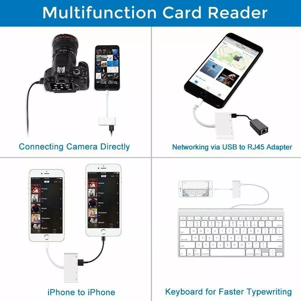 USB to Card Reader Adapter USB Camera Micro SD Memory Slot for iPhone iPad iPod Description: Through the 4 in 1 Audio Camera Connection Kit ,its incredibly easy to download photos from your digital camera to your iPad .It gives you two ways to import photos and videos.One is ti use USB cable ,the other is to read form SD/Micro SD card directly. The Connection Kit supports standard photo formats,such as JPEG and RAW etc. Besides,it supports PC keyboard input as well as imports photos form USB flash disk to iPhone/iPad/iPod Touch. Moreover,it allows you to charge iPhone/iPad/iPod Touch.via a micro USB cable. Specification: Operating Voltage:3.3V Operating current:<100mA Interface:L/SD Card/TF Card/USB Receptacle W/R Speed:USB2.0 Speed(14MB/S-16MB/S) Compatibility:Compatible with iOS 9.1 iOS 10 iOS 11 or later Please note: 1. The 4 in 1 Camera Connection Kit has 4 ports.However,USB port,SD port and Micro SD port can't be used at the same time.The port can be used together with any of above 3 ports.For example,you can charge iPhone/iPad/iPod Touch and put keyboard type at the same time. 2. If USB flash disk/Micro SD card/SD card directly use with this kit,you must create "DCIM" folder and named the pictures like for example you want to import pictures from your USB flash disk,you need to creat a file in your usb flash disk and named it "DCIM",then you need to copy your pictures to this folder and named them as after that you can plug in the adapter and import pictures to your phone. 3. This item can only transfer pictures and video from SD card to iphone/ipad. It is one-way transmission and can't transfer data from mobile phone to SD card. Package Include(Retail Packaging): 1 x 4 in 1 to Camera card reader 1 x User Manual Feedback: 1) Your Feedback is really important to us,please take a few seconds to leave great feedback if you are satisfied with our product or service, thank you so much! 2) We always offer the lowest price for best goods and service to you. 3) Please contact us before leaving neutral(3 stars) or negative(1-2 stars) feedback.We will try our best to solve the problem and leave you a happy shopping mood here. Thank you!