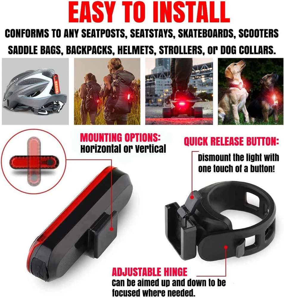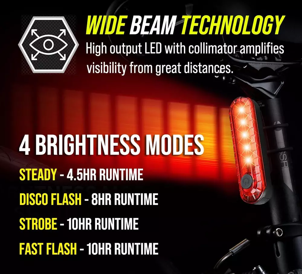 Ultra-Bright LED Bike Tail Lights for Maximum Visibility: The BLITZU Cyborg 120T red LED bike tail lights provide exceptional brightness, ensuring high visibility during night cycling, commuting, and mountain biking. Perfect for road bike riders, MTB cyclists, and anyone who rides in low-light or dark conditions. USB-C Rechargeable & Long Battery Life: Enjoy the convenience of USB-C rechargeable bike tail lights that charge quickly and provide long-lasting performance. Save money and reduce waste with these eco-friendly rechargeable bike lights, offering up to 10 hours of bright illumination on a single charge. Waterproof & Weather-Resistant for All Conditions: These waterproof bike rear lights are designed to withstand rain, snow, and fog, ensuring reliable performance in any weather. Perfect for rainy rides or foggy conditions, keeping you visible and safe on wet roads and bike trails. Versatile Mounting for Bikes, Helmets, and More: These LED bike tail lights are easy to install on your bike frame, helmet, or backpack, making them ideal for adult cyclists, kids, and families. Versatile and adjustable, they fit most MTB, road bikes, and commuter bikes. Secure & Versatile Mounting: The durable, flexible mount easily attaches to a variety of surfaces, including seatposts, seatstays, helmets, saddle bags, backpacks, skateboards, scooters, strollers, wheelchairs, and even dog collars. The adjustable hinge allows you to tilt the light up or down, providing targeted illumination exactly where it's needed. Essential Safety Accessories for Cyclists: The BLITZU 2025 bike tail light 2-pack is an essential safety accessory set for all cyclists. Whether you're cycling in the city or on the trails, these high-visibility bike reflectors make a perfect gift for cyclists of all ages, ensuring a safer, more visible ride for both adults and kids. Product Description The video showcases the product in use. The video guides you through product setup. The video compares multiple products. The video shows the product being unpacked. Expertise you can trust Features USB-C Rechargeable Ultra Sleek Design 4 Lighting Modes Long Lasting Battery Enhanced safety during the day Each package comes with 2 lights Universal Mounting System Check Out More from BLITZU Add to Cart Add to Cart Add to Cart Add to Cart Add to Cart Add to Cart Customer Reviews 4.2 out of 5 stars 464 4.2 out of 5 stars 8,249 4.5 out of 5 stars 19,438 4.5 out of 5 stars 3,555 4.5 out of 5 stars 2,279 4.4 out of 5 stars 2,984 Price $19.95 $ 19 . 95 $18.79 $ 18 . 79 $18.95 $ 18 . 95 $19.97 $ 19 . 97 $22.79 $ 22 . 79 $17.79 $ 17 . 79 Battery Life 2hr to 8hr 2hr 30min to 6hr 2hr 55min to 6hr 10mins 3hr 5min to 6hr 15mins 3hr 10min to 6hr 20mins 100+ Hours Number of Modes 6 6 5 5 5 3 USB Rechargeable ✔ ✔ ✔ ✔ ✔ ✔ Day and Night Modes ✔ ✔ ✔ ✔ ✔ ✔ Water Resistance ✔ ✔ ✔ ✔ ✔ ✔
