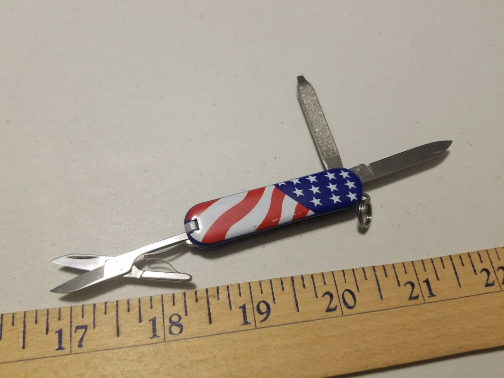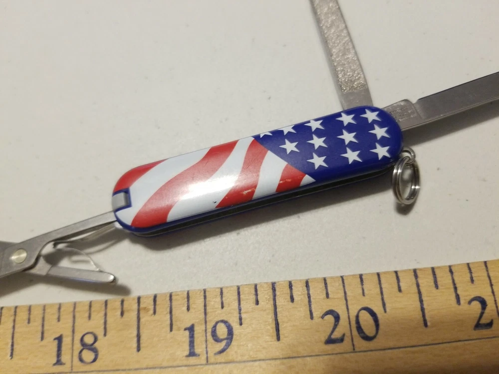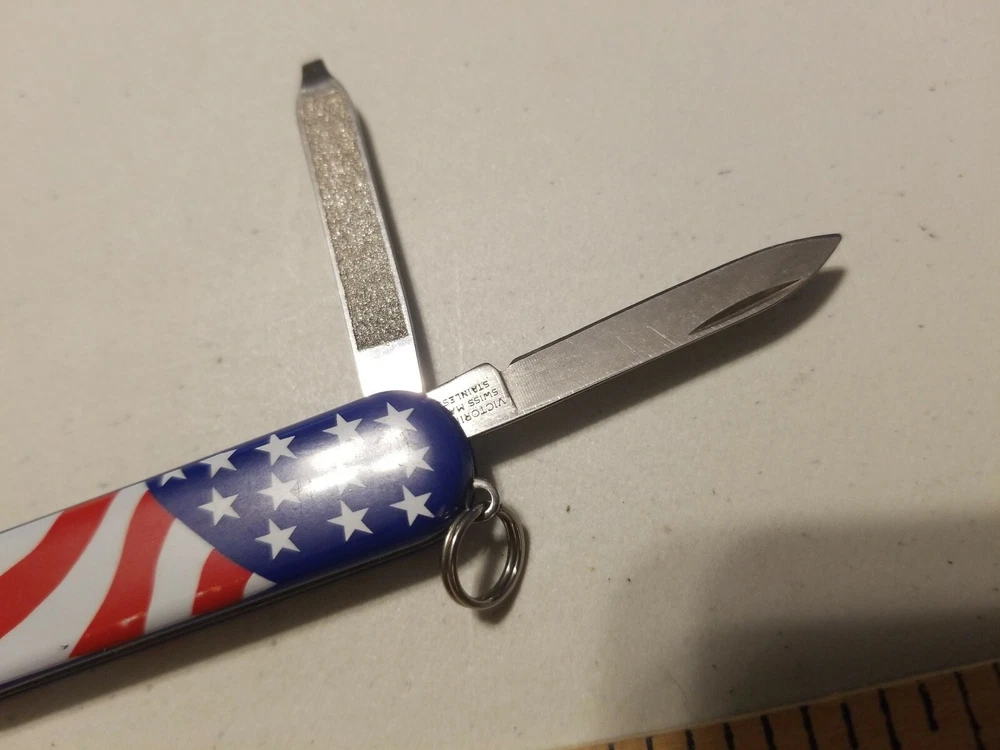 Swiss Army Victorinox Multifunction USA Flag Handle Pocket Knife Officer Suisse. Condition is Used. Shipped with USPS First Class Package.