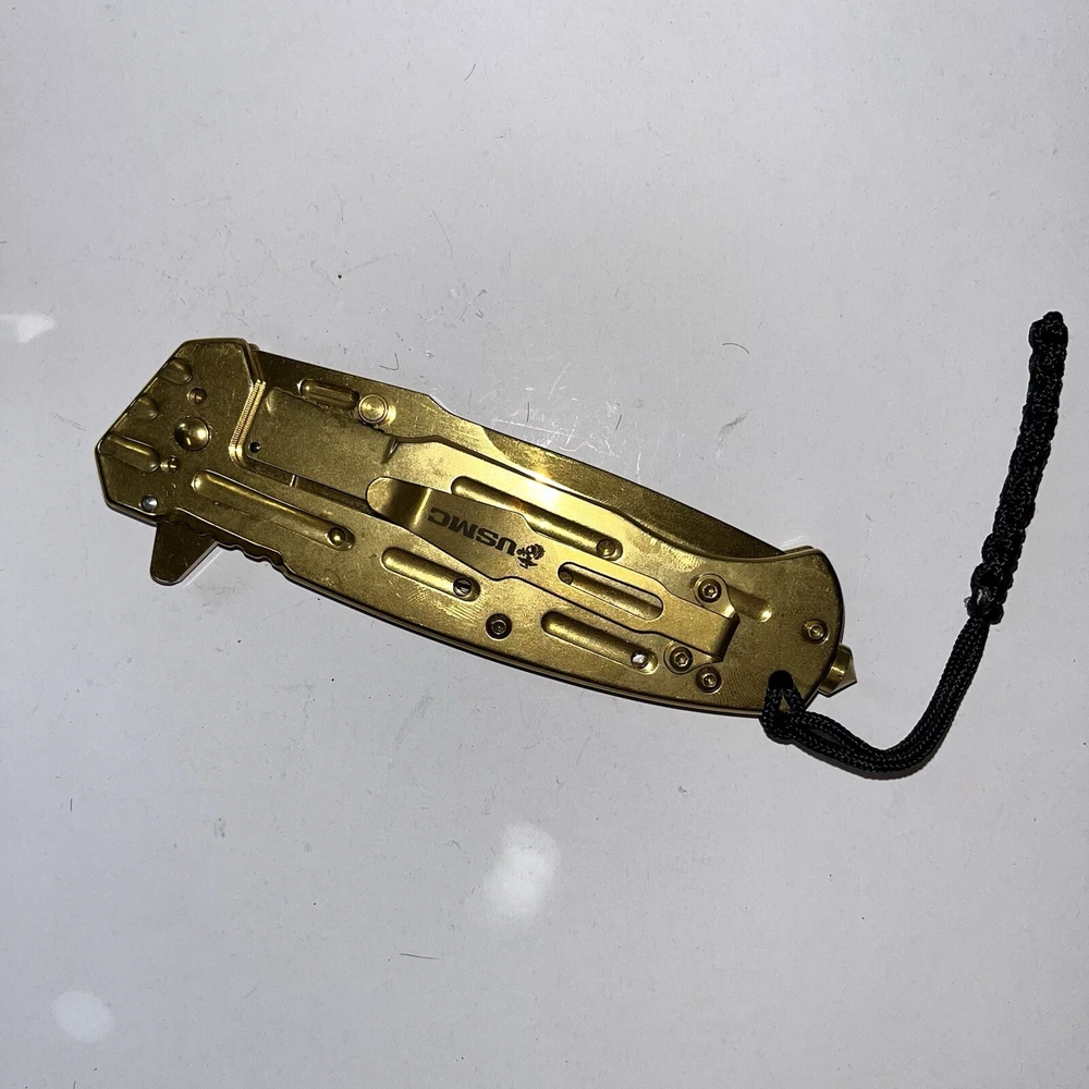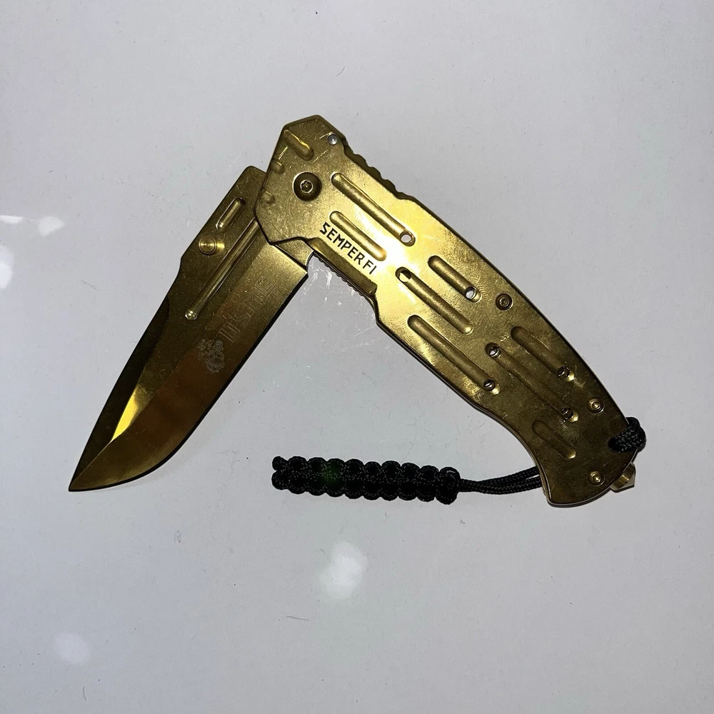 Experience the legacy of the United States Marine Corps with this officially licensed tactical folding knife. Crafted with precision and designed for performance, this striking gold knife is a testament to the strength, courage, and unwavering dedication of the Marines. Built for Mission Readiness This isn't just a knife; it's a tactical tool engineered for demanding situations. The 9-inch overall length provides ample reach and control, while the lightning-fast ball bearing assisted opening mechanism ensures rapid deployment when seconds count. The ergonomic carbon steel grip with a grid pattern provides a secure and comfortable hold, even in the most challenging conditions. Essential Features for Tactical Use: Officially Licensed USMC: Authentic product with a striking gold finish, honoring the legacy of the Marines. Rapid Deployment: 9" overall length with a fast and smooth ball bearing assisted opening mechanism for quick access. Enhanced Grip: Ergonomic carbon steel grid grip for a secure and comfortable hold in any situation. Durable Construction: Built for tough use with a reliable liner lock to ensure blade safety. Convenient Carry: Includes a hard nylon belt case for secure transport and easy access. Extra Features: Alan key for tightening screws, reversible pocket clip, and a pocket lanyard for added utility. Perfect for: USMC Enthusiasts: A must-have for any Marine Corps fan or collector. Military Personnel: A reliable and tactical tool for active-duty and retired military personnel. Everyday Carry (EDC): A versatile tool for everyday tasks and emergency situations. Tactical Gear Collectors: A valuable addition to any tactical gear collection. Outdoor Enthusiasts: Ideal for camping, hiking, hunting, and other outdoor activities. Customer Satisfaction Guaranteed We strive for 100% customer satisfaction. If you experience any issues with your purchase, please contact us directly before leaving any feedback or opening any claims. We will work diligently to resolve any problems promptly and efficiently. Order Your USMC Tactical Gold Knife Today Experience the power and prestige of the United States Marine Corps with this exceptional tactical folding knife. Order yours today and join the ranks of those who demand the best.
