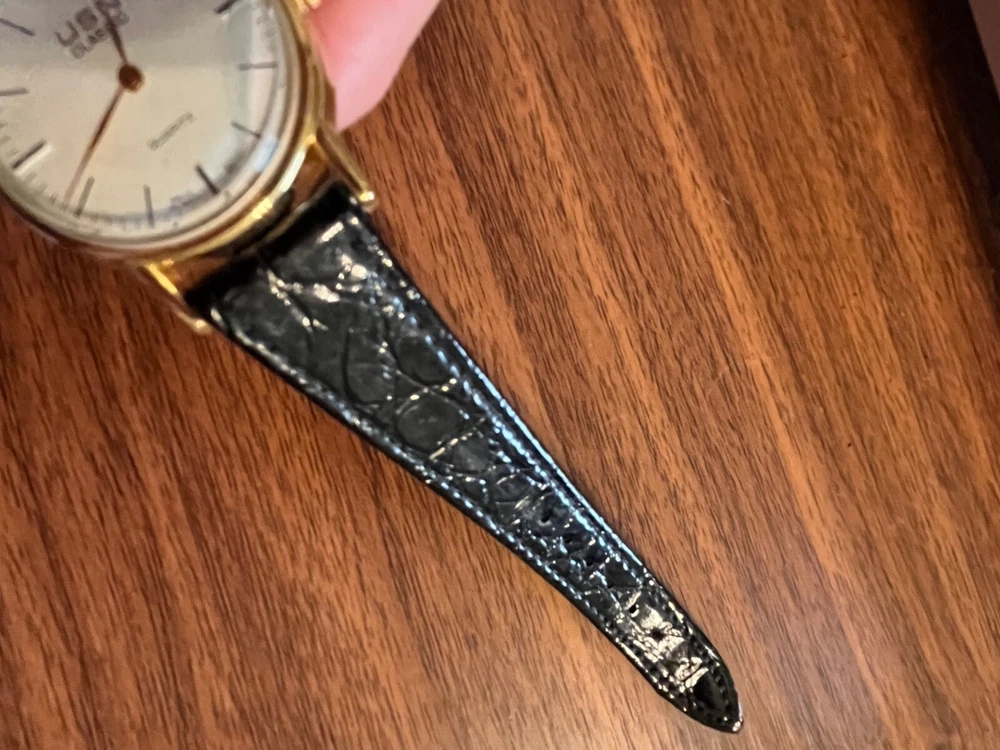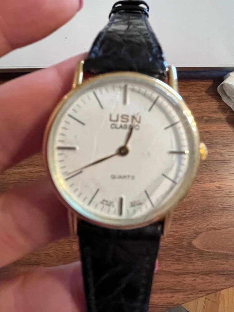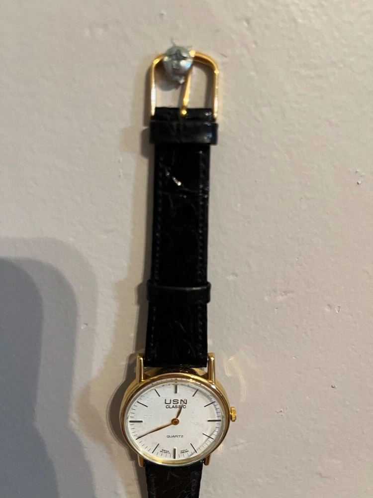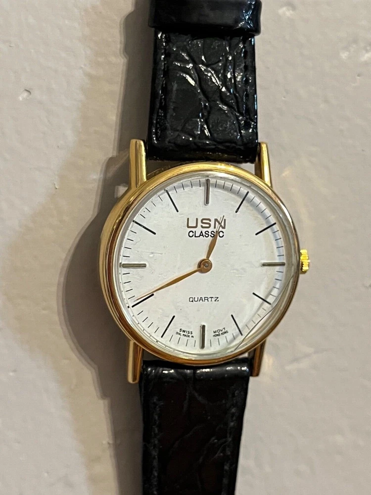 USN Classic Wristwatch Unisex Black Leather Band Quartz Swiss Made Gold Hands Great Pre-Owned Condition (see pics for details) Features: • Style Profile: Everyday, Work Wear, Office, Business, Casual, Lightweight, Black, Gold, Leather Band, Battery, Vintage, Travel, Vacation, Weekend Wear, Feminine Detail, Masculine, Statement Making Look, Trendy, Timeless, Ease • Flaws: No Holes, stains, or tears - still has the plastic cover over watch face • Please see photos for measurements (in inches) • Smoke Free Home • Washing Instructions: Spot Treat Size: Standard Super Fast Shipping: Ships out the same day or next business day!