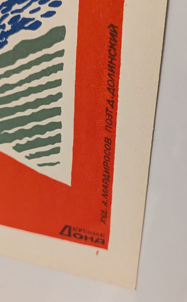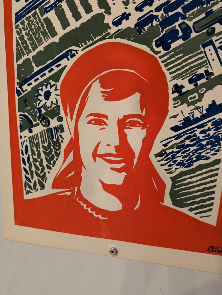 Welcome to Antique Poster Shop The poster is one of the most lively and, at the same time, the most complex areas in graphic design, in art. The Soviet poster is a truly unique phenomenon, and in different years the authors of famous posters were outstanding Soviet artists, leading people of their time. The best artists of their time worked on propaganda posters, famous poets wrote slogans - thus, unique graphic schools were formed. Nowhere in the world did they teach the poster purposefully and systematically, as it was in the USSR. Rare Soviet posters today have to be searched for in different countries of the world. It's a paradox, but what was created in only a few copies and is known only to collectors is sometimes easier to find than what was produced in thousands of copies. Of the millions of campaign posters that have adorned the streets, classrooms, classrooms and hospital corridors for many decades, only a few have survived. Posters of the Soviet era are not only original works of graphic art, antiques and antique graphics, original retro gifts and interior items, but also truly historical documents. ___________________________________________________________________________ The poster is created using the technique of multi-color silk-screen printing, stencil type. An extremely rare type of poster creation since each copy is made by hand. The stencil is also made by hand. Such posters are produced in extremely small print runs _________________________________________________________________________________________________________ SLOGAN : Glory to the Soviet woman farmer ! Type of printing : Silk-screen printing Publishing house : creative association "Agitplakat Dona" Year of creation : 1968 SIZE – 22 / 14 INCHES OR 56 /36 CENTIMETERS THE PAINTER IS : Shutenko Rodion 1921 Biography Soviet and Russian graphic artist, poster artist, caricaturist. Member of the Union of Artists of the USSR. Worked as a caricaturist in the satirical magazine "Krokodil" and in the creative association "Agitplakat Dona". Participant in the Great Patriotic War. Rodion Stepanovich served in the artillery regiment of the 315th rifle division. Commanding a howitzer battery, Rodion Shutenko fought the Nazis at Stalingrad, liberated Crimea. The division's soldiers not only fought for Stalingrad, but also liberated Shakhty and Novoshakhtinsk, fought on the Mius. Moreover: five brothers of Rodion Stepanovich fought on the front lines. And they all returned home alive! Now he paints pictures about the Great Patriotic War, including this decisive battle. A former artilleryman, the 97-year-old artist and poet considers his work about Stalingrad to be a valuable work - after all, on the burnt sheet there are signatures of Rostov residents who took part in the defense of Stalingrad. Many of them are no longer alive. Senior Lieutenant Rodion Shutenko returned to his home in his native village of Oblivskaya after being discharged into the reserve in 1946. And the following year he entered the Rostov Art School named after M. B. Grekov. Since childhood, I was sure: I will become an artist - or nobody! And since my last name is "joking", I was initially drawn to the genre of caricature. While still studying at the "Grekovka", I began to establish contacts with the incredibly popular humorous magazine "Crocodile" in the Soviet years, - said Rodion Stepanovich. At first, the Rostov resident sent themes for caricatures to the editorial office of "Crocodile". They responded kindly to him: "You lack humor," or "You failed to develop the plot." But the persistence of the young cartoonist gradually prevailed. Shutenko's themes began to be accepted for publication, although they were drawn by more experienced, full-time artists of "Krokodil." During the summer holidays, Rodion came to Moscow, rented a corner for the night somewhere not far from the editorial office, and came there every day as if to work. In the end, Rodion Shutenko became a freelance author of "Krokodil." They already paid for his travel from Rostov, and provided a hotel in Moscow. Once a week, so-called "dark" meetings were held, to which all the artists collaborating with "Krokodil" were invited, R. S. Shutenko continues his story. The freelancers brought their sketches and drafts, drawn anywhere, on pieces of paper or cardboard. The main thing was to explain their idea and show its vision on paper. If the theme was accepted, it was ordered from one of the staff artists of "Krokodil". These were famous masters of caricature, each with his own established style and style. "International" themes of Shutenko were most often sent to the creative team of Kukryniksy, other themes of the young artist usually went to another famous "Krokodil" - Yuli Abramovich Ganf, or a native of the Don Nakhichevan Leon Georgievich Gench. After graduating from the "Grekov" school, Rodion Shutenko received a teacher's diploma and was sent to work as a drawing teacher at a school for hearing-impaired children on Suvorov Street. But in 1962, the artist changed his teaching activity to professional activity as an artist. Even working as a teacher, I continued to draw, participated in exhibitions of the Union of Artists and did not break off contact with the magazine "Krokodil", where I went during the summer holidays. He achieved some success, and one day the young cartoonist was invited to his studio by Anatoly Mosin, an artist for the literary magazine Don and head of the graphics section at the Rostov branch of the Union of Artists of Russia. At 16 Turgenevskaya Street, Rostov graphic artists Viktor Dorokhov, Arsen Mardirosov and the Kondratyev brothers, who had also been invited by Mosin, were already sitting there. “Mosin announced to us his plan to create a creative association in Rostov called “Agitplakat Dona”. Such an association had recently been created in the capital. And the prototype was the famous “Windows of Satire ROSTA”, where Vladimir Mayakovsky pu
