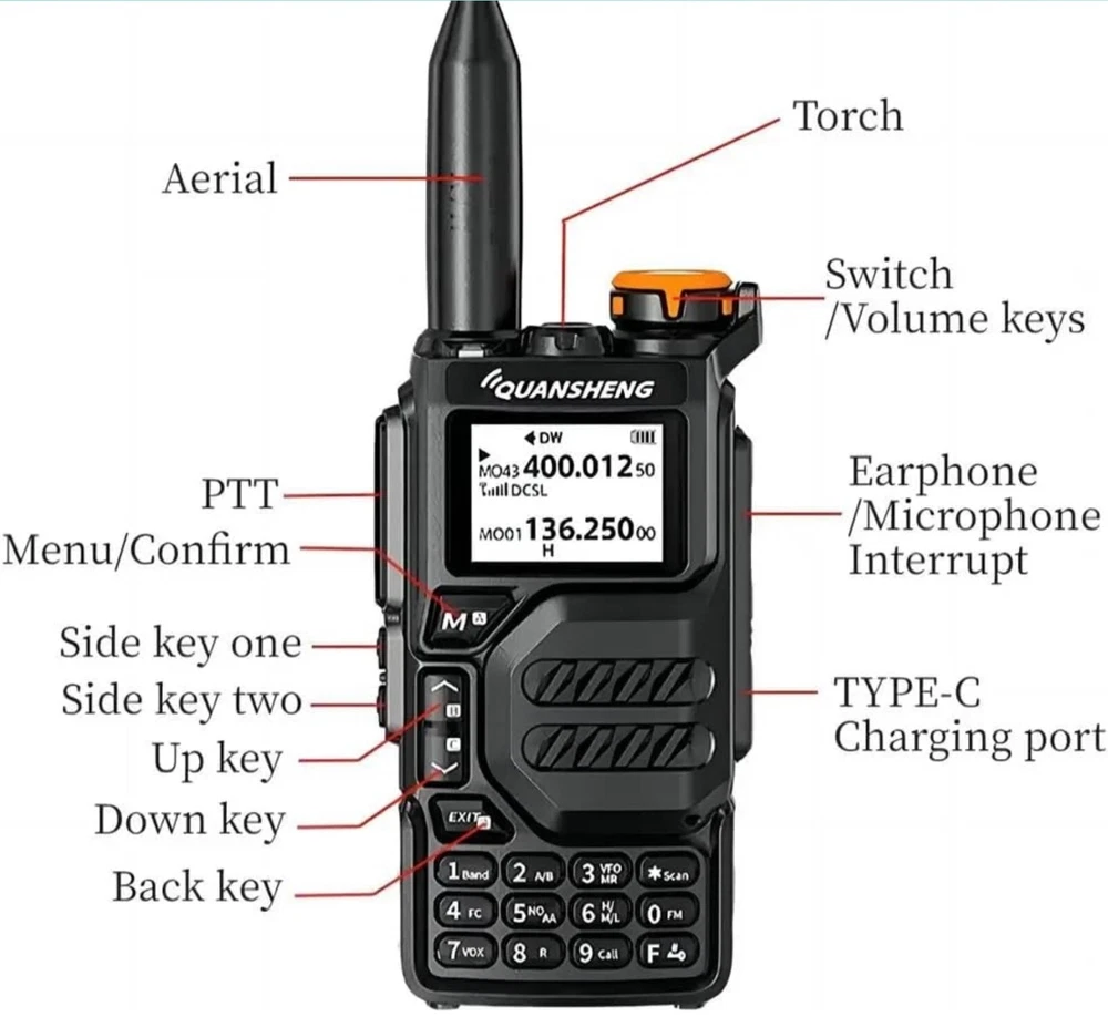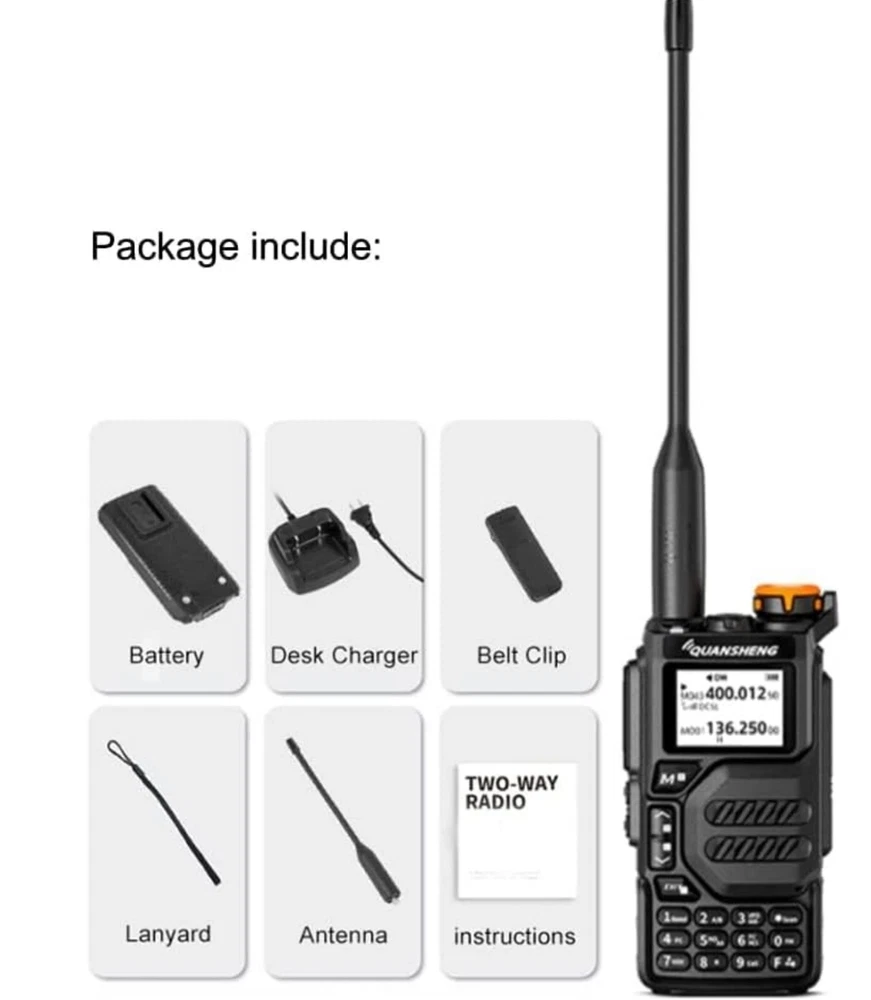 Get reliable communication on your outdoor adventures with the UV K5 Quansheng Walkie Talkie Portable UVK5 Two Way Radio. With a wireless range of 1-10km, this black UHF/VHF radio is perfect for calling systems and features channel monitoring, waterproof design, CTCSS, and DCS. The radio is powered by 5W and has 200 channels to choose from. Whether you're hiking in the mountains or exploring the great outdoors, this walkie talkie is the perfect companion for seamless communication. The UV K5 Quansheng Walkie Talkie Portable UVK5 Two Way Radio is a reliable and durable option for all your communication needs. Fast Shipping from Tennessee! NOAA Weather Alert VHF UHF dual band -10 Channels America NOAA weather forecast / -Built-in high light Torch / -200 Memory Channels -Wireless Frequency copy from other radios,Wireless Radio Replication from othe Quansheng UV-K5 Radios The radio comes with a 1600mAh rechargeable Li-ion battery pack and can be charged via TYPE C and desktop cradle. Package: 1× UV-K5 Radio Body 1× 7.2V 1600mah Li-ion Battery Pack 1× SMA-Female Dual Band Antenna 1× Belt Clip 1× ENG Manual 1× Desktop Charger ( 110V ~ 240V ) 1× Handstrap Note: 1.Use original factory charger for charging, and the Type-C charging port of the body is only used for emergency charging. 2.To protects the environment, please recycle the battery pack. 3. Do not remove the battery when use Type-C charging. 4. Never attempt to remove the casing from the battery pack.
