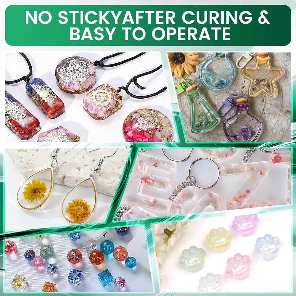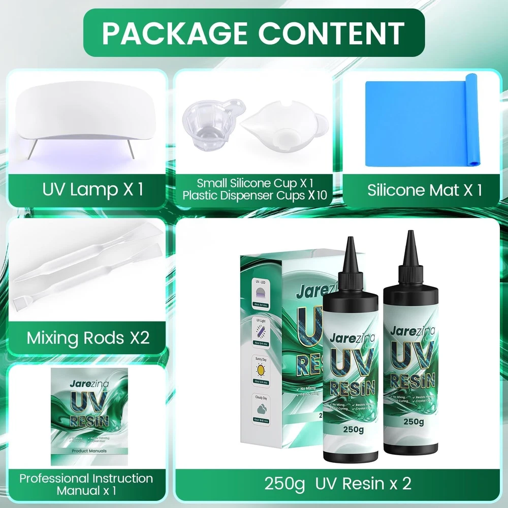 This resin kit is absolutely amazing! It cures so fast under the light, and the results are crystal clear with no yellowing. Perfect for jewelry and crafts, super easy to use even for beginners. Love the included mat and light too!