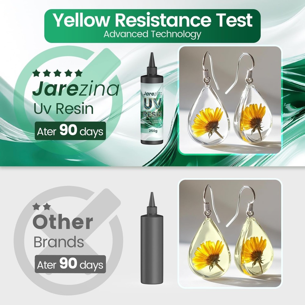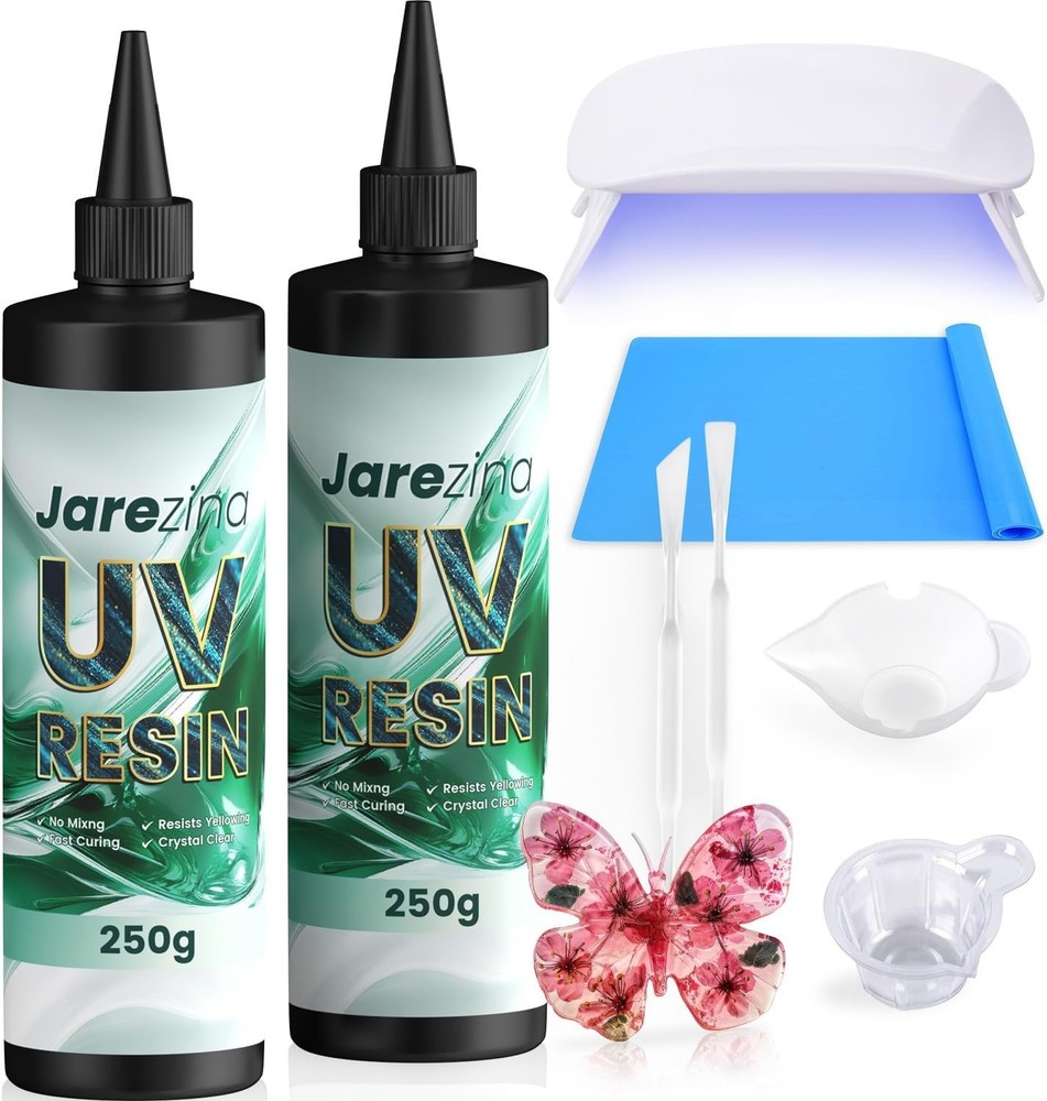 UV Resin with Light,Upgraded 250g Crystal Clear,Low Odor,Fast Cure& Hard Type UV Resin Kit,Silicone Mat,UV Light, for Crafts, Jewelry Making, Casting Fast Curing & Easy to Use:The UV resin cures quickly under UV light or sunlight, with no mixing required. It hardens in just minutes, making it ideal for both beginners and experienced crafters. Crystal Clear & Anti-yellowing:UV resin is infused with antioxidants, enhancing its transparency and yellow-resistance. With a refractive index more than 1.5 times higher than other UV resins, it ensures a crystal-clear finish. It applies smoothly without leaving traces, making it perfect for light-transmitting materials. Versatile for Various Projects:The UV resin is perfect for making jewelry, keychains, home décor, and resin art. It can be mixed with mica powders, glitters, and colorants for vibrant and personalized finishes UV Resin Starter Kit with Light:Everything you need to get started with UV resin is included in this kit. It comes with a UV lamp, 2 mixing rods, a silicone mat, a color mixing cup, and a professional instruction manual. Packaged in a beautiful gift box, it's the perfect gift for anyone who loves jewelry making. Brand Promise:offers high-quality products for creative individuals, ensuring consistency and reliability in every batch. We provide a 12-month free return or exchange policy. If you're not satisfied, , and our support team will assist you within 24 hours.