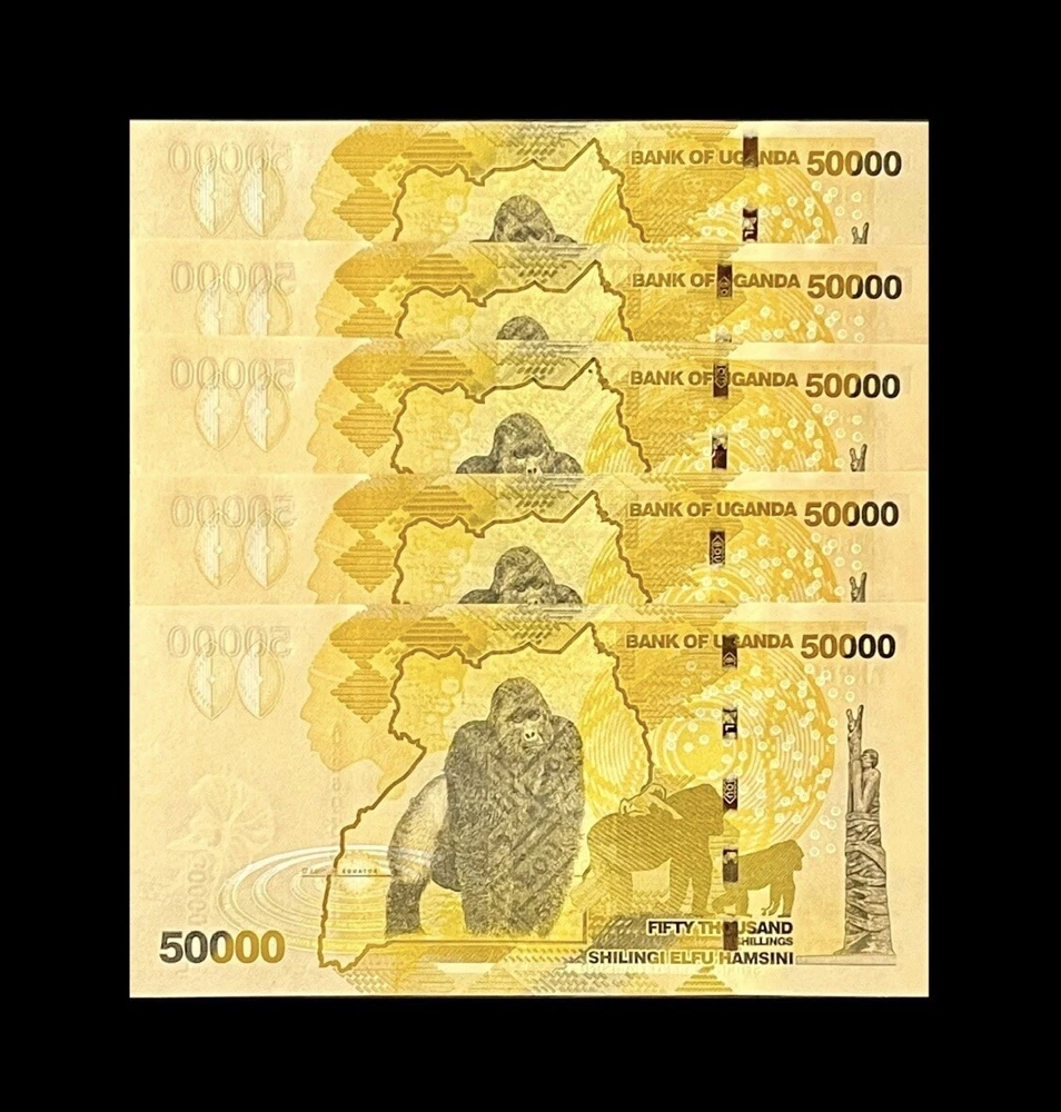 Ugandan Shillings: 5 pcs x 50000 UNC Banknotes (250K UGX) - Includes CoA Specifications: Type: Banknotes Year: 2021 Country: Uganda Continent: Africa Condition: Uncirculated (UNC) Denomination: 50,000 Quantity: 5 pc Sum: 250K UGX Condition: Gem UNC Features: Certificate of Authenticity Included, Consecutive Serial #s. Description: This listing is for five (5) uncirculated Uganda banknotes printed in 2021 with a face value of 50,000 Shillings each, totaling a quarter-million UGX. The notes buyers will receive will have consecutive serial numbers. *Certificate of Authenticity Included Shipping Information: Usually ships within one business day from Louisiana, USA. - USPS First-Class Mail - USPS Priority Mail - USPS Priority Mail Express - USPS First-Class Mail International - USPS Priority Mail International