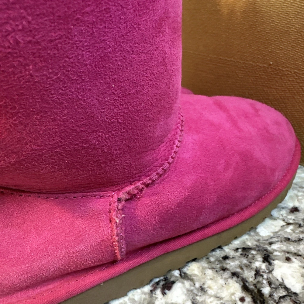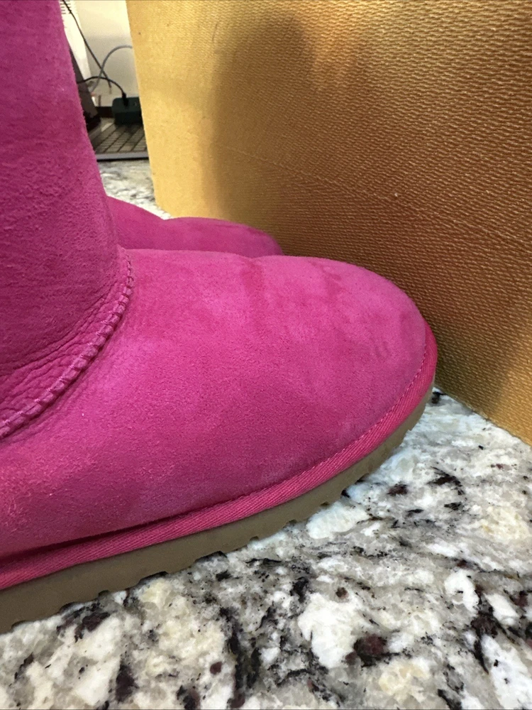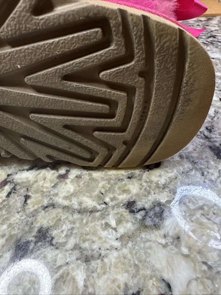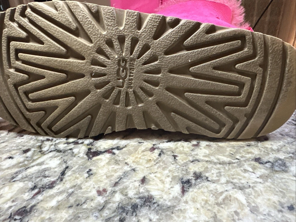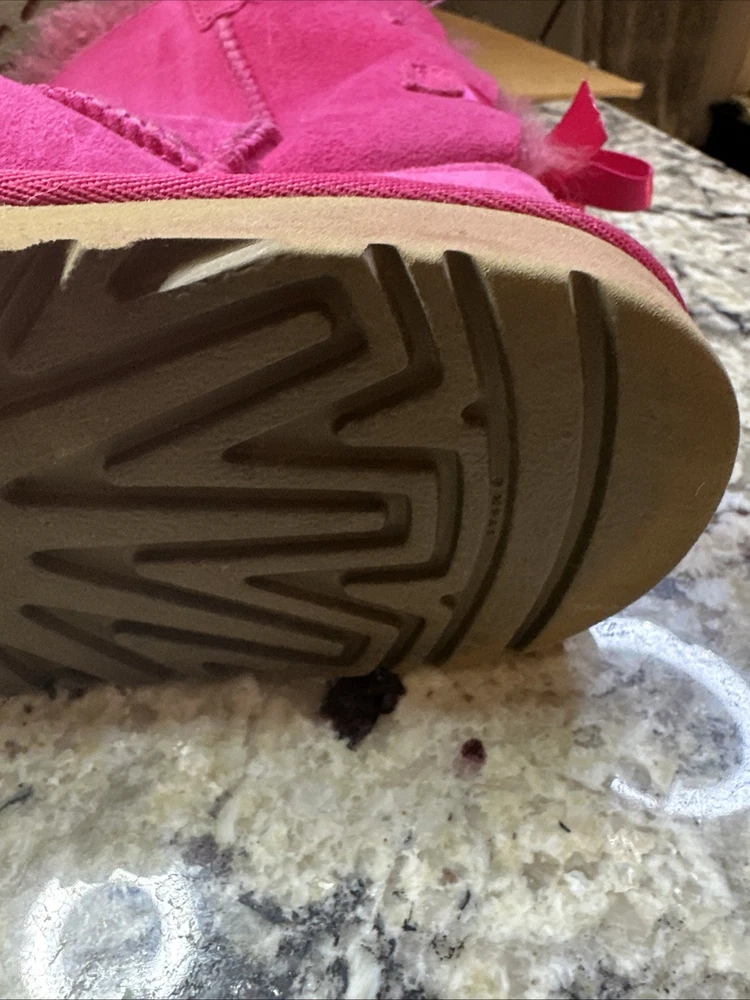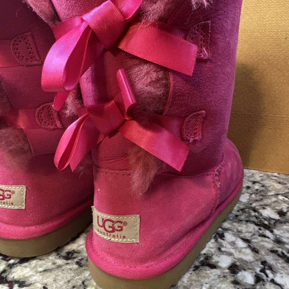 The Ugg Australia Bailey Bow Boot in Cerise (Hot Pink), Size 6 is a stylish and cozy option for young girls. This slip-on boot features a low heel, fur trim, and a cute bow accent, making it perfect for casual occasions during the winter season. Made with a shearling style design, sheepskin lining, and a rubber outsole, these boots offer both comfort and durability. The pink color adds a fun pop to any outfit, while the mid-top shaft style provides ankle coverage and support. Perfect for colder weather and adding a touch of glam to any look.