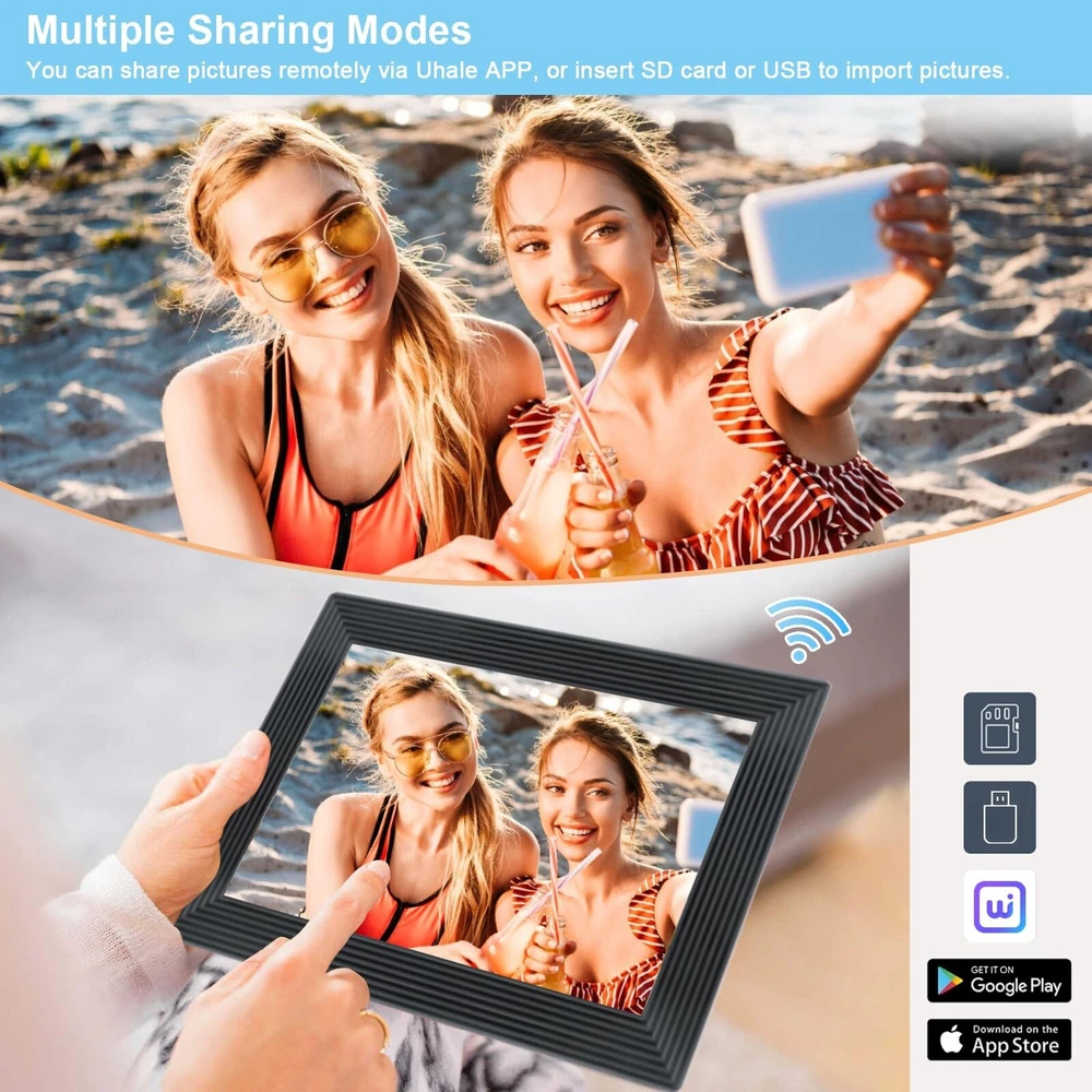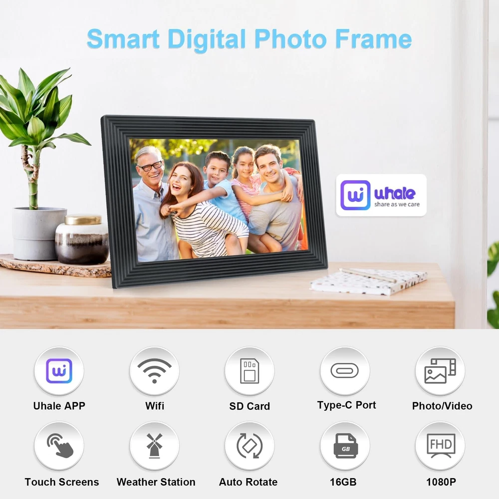 Uhale Digital Picture Frame Wifi - 10.1 Inch Digital Photo Frame, Electronic Photo Frame SD Card Slot Desktop IPS Touch Screen HD Display Auto-Rotate Slideshow Share Videos Photos Send Wishes Remotely Product Details Size: Uhale-1 Pack Brand: yamemo MPN: 1010Y-1 UPC: Does not apply EAN: Does not apply Brand: yamemo Color: black Resolution: 1080p Compatible Devices: Smartphone Screen Size: 10.1 Inches Product Dimensions: 10.4 x 7.2 x 0.99 inches Item Weight: 1.1 pounds Item model number: 1010Y-1 Date First Available: September 19, 2024 Manufacturer: yamemo Country of Origin: China IPS HD Touch ScreenThis 10.1-inch digital photo frame is equipped with a FHD touch LCD screen. You can enjoy High-Definition pictures and videos from all angles. Uhale electronic photo frame supports JPG/ JPEG/ BMP/ PNG image format and MP4 video format. Large Storage&Multiple Upload MethodsThis digital frame offers you a huge storage capacity with built-in 16GB memory (around 30,000 photos of 300KB/pc). It also supports the micro SD card and USB drive connectivity to enable you to read the files and export, and back up the received photos and videos for better album management. Supports a max 64GB micro SD card (Not Included). WiFi Digital Photo FrameConnect the digital frame to home WiFi, and then download the free Uhale App on your phone (download from Android or iOS), easily send photos or a video(use app max 15 seconds, or use a micro SD card to upload unlimited video duration) to the frame. And also your families and friends can privately and safely share wonderful moments with you from anywhere and anytime. Multifunctional Custom SettingsSmart picture frame Come with a detachable holder as a frame stand. Multifunctional custom settings, such as play order, image zooming, hide/publish images, display caption, adjustable brightness, sleep mode, etc. The User-friendly interface design makes it easy to use for all ages. Perfect GiftShare your precious and wonderful moments of life on the electronic photo frame from anywhere where you are, let family and loved ones enjoy your wonderful moments and feel that you are just staying together. Yamemo Digital Frame is an ideal present for birthday, wedding, graduation ceremony, family gathering occasions.Meanwhile, it is a good decoration in your bedroom or living room, even in the office, as a perfect tool to advertise products in a bar or store.