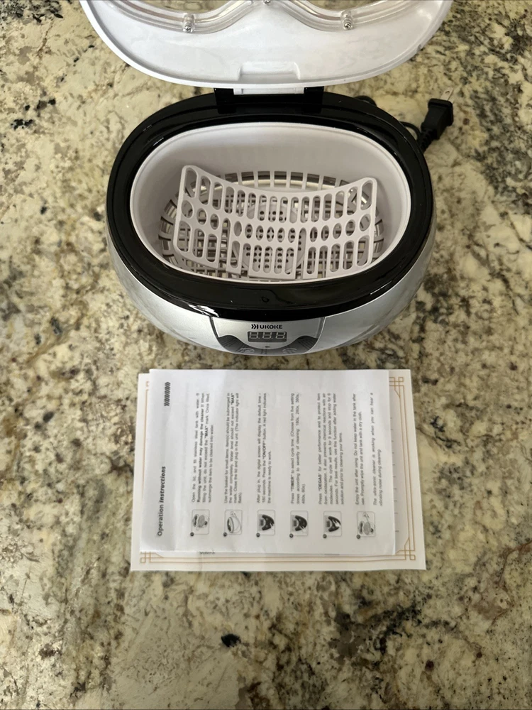 UKOKE 3800S Professional Ultrasonic Jewelry Cleaner Machine, 0.6L Portable Household Timer Device for Eyeglasses, Dentures, Watches, Rings | Silver, Fast Deep Cleaning for Small Accessories Product Details Color: Silver Design: Ultrasonic Cleaner Brand: Ukoke MPN: 3800S UPC: 856121007080 EAN: 0856121007080 Color: Silver Brand: Ukoke Material: Stainless Steel, Plastic Product Dimensions: 6.73"D x 9.51"W x 4.72"H Item Weight: 2 Pounds MULTI-PURPOSE ULTRASONIC CLEANER Perfect for cleaning jewelry, eyeglasses, dentures, watches, coins, lab instruments, and more. Ideal for optical shops, jewelry stores, repair centers, dental clinics, laboratories, and home use. Cleans in minutes using only tap water! POWERFUL & SAFE CLEANING Generates 42,000 Hz of ultrasonic sound waves for a deep yet gentle clean, removing dirt and grime without damaging valuables. Refreshes items to look brand new!POWERFUL & SAFE CLEANING Generates 42,000 Hz of ultrasonic sound waves for a deep yet gentle clean, removing dirt and grime without damaging valuables. Refreshes items to look brand new! ADVANCED DEGASSING FUNCTION The exclusive Degas Mode removes trapped air bubbles from water, improving ultrasonic cleaning efficiency while preventing oxidation and chemical reactions that traditional cleaners cant avoid. TEASY TO USE WITH TOUCH CONTROLS Features a modern digital touch control panel for precise cleaning. Choose from 5 preset cycles (90, 180, 280, 380, & 480 seconds) based on your cleaning needs. Stable & durable compared to traditional push buttons. LARGE 600ML (20 OZ) CAPACITY The stainless steel tank (5.4 L x 3.6 W x 2.1 H) accommodates a variety of items, ensuring a professional-grade clean at home. RECOMMENDED CLEANING TIP Add a few drops of liquid dish soap for even better results! Safe for metals, glass, ceramics, and more. Not suitable for pearls, coral, emeralds, jade, or microfiber items. 1-YEAR REPLACEMENT WARRANTY Buy with confidence! Backed by a 1-year free replacement policy for any quality issues. 24/7 CUSTOMER SUPPORT Have questions? Our dedicated customer service team is ready to assist within 24 hours!