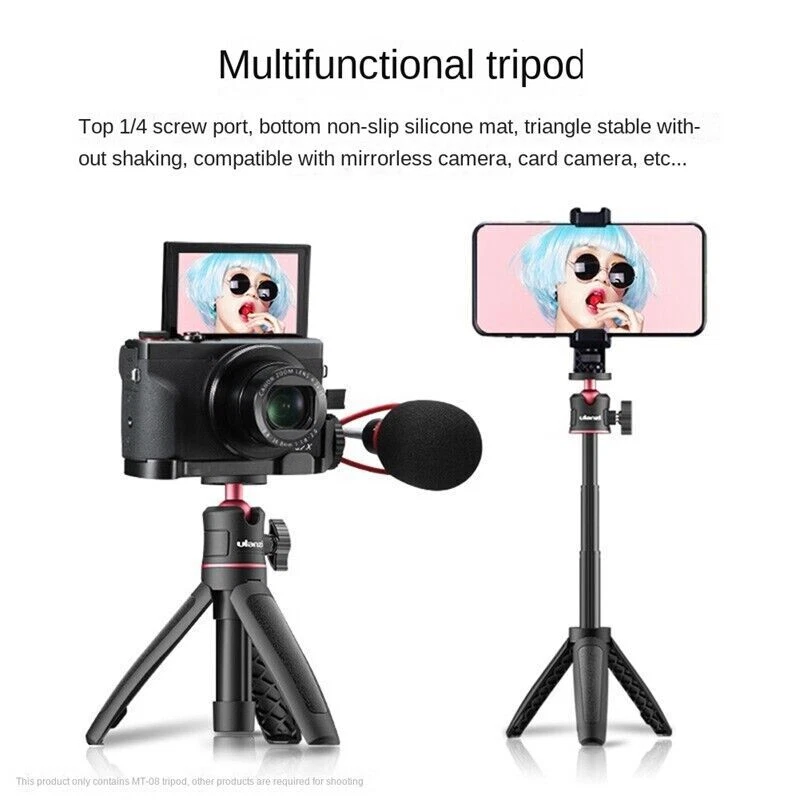 Features: Tripod & Selfie Stick 2-in-1: Can be used as a mini desktop tripod or a handheld extendable selfie stick, perfect for selfie or vlogging. Standard 1/4 Inch Screw Mount: Standard 1/4 inch screw mount is compatible with most mirrorless cameras, as well as most smartphone clips. Flexible Ballhead: Flexible ballhead supports 360° rotating, you can adjust the shooting angle freely, very convenient to use. Extendable Design: 3 sections telescoping stick supports up to 27cm/10.6in maximum usage length, which allows you to get wider shooting range. Easy to Carry Around: Compact and lightweight, only 15cm folding length and 92g net weight, very easy to carry around. Specifications: Brand: Ulanzi Model: MT-08 Colour: Black Material: ABS + Aluminum Folding Length: 15cm Max. Usage Length: 27cm Sections: 3 Item Weight: 92g Package Included: 1x Ulanzi MT-08 Tripod Note: Only the extendable tripod is included.