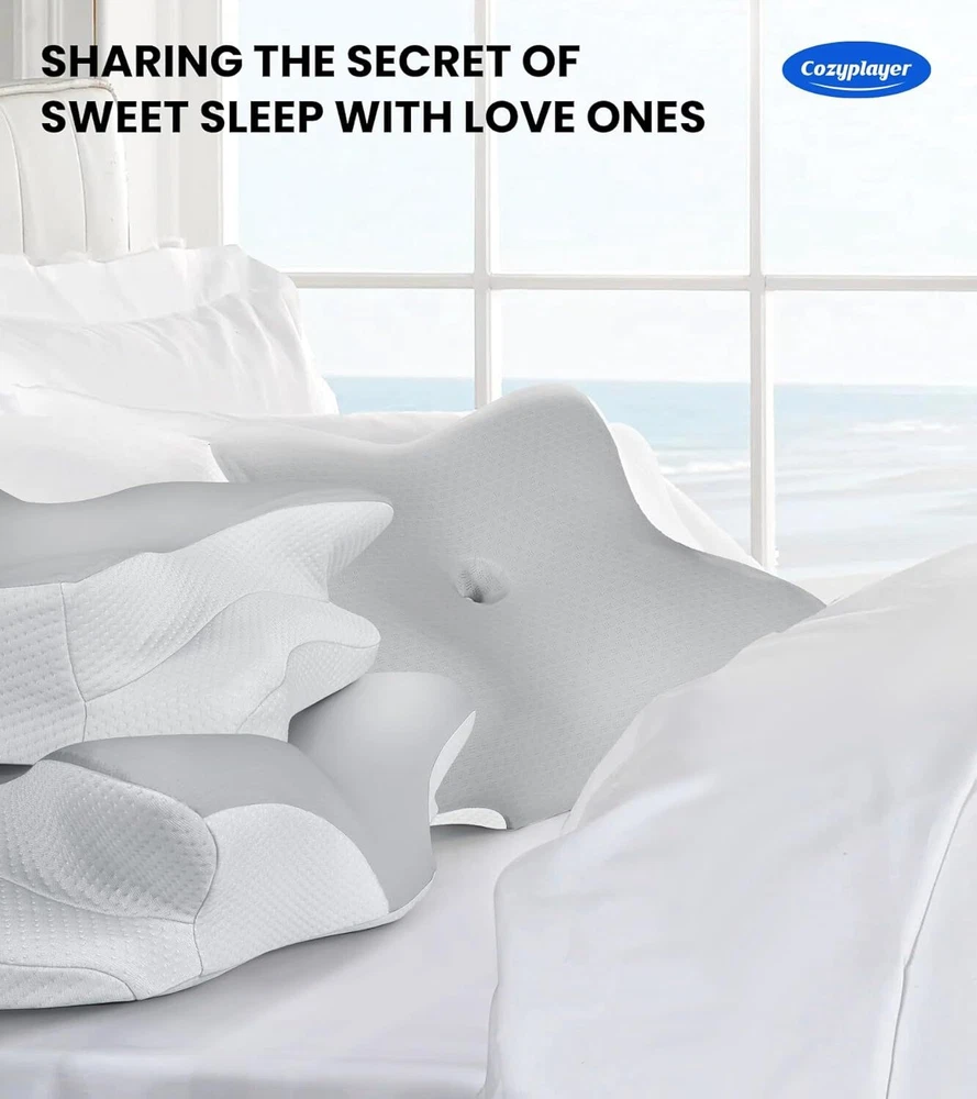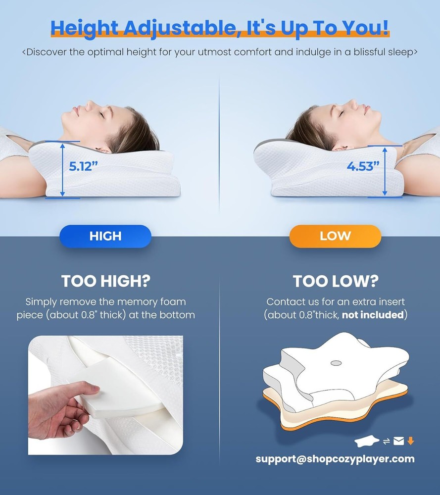 REVOLUTIONIZE YOUR SLEEP WITH THE INNOVATIVE HOLLOW CONCAVE DESIGN - Tired of waking up with neck pain and discomfort? Look no further! By combining the benefits of a traditional bed pillow and a contour pillow, Our ergonomic hollow contour pillow is here to transform your sleep experience. The hollow concave surface, tilted at a 15-degree angle, skillfully cradles your head, while maintaining the natural curve of your neck and aligning your spine flawlessly. Wake up feeling refreshed! EXPERIENCE UNINTERRUPTED, BLISSFUL SLEEP WITH OUR VERSATILE PILLOW - Engineered with meticulous precision, this innovative neck pillow features six unique contour zones specifically designed to embrace the natural curvature of your body. Each contour zone works harmoniously to address targeted pressure points, it provides full support to your neck, shoulders, and arms, effectively alleviating your neck pain and muscle stiffness. No longer will you have to compromise on the quality of your rest. EMBRACE HEALTHY SLEEP WITH PREMIUM MEMORY FOAM & COOLING PILLOWCASE - Unlike 90% of support pillows, Cozyplayer utilizes the Q-Max 0.4 Arc-Chill cooling pillowcase, which instantly reduces skin temperature by 5℃! Additionally, the pillowcase fabric utilizes a highly dense 3D mesh design, offering excellent breathability. Our pillow core is made of 98% breathable memory foam, which is non-toxic, odorless, and certified by OEKO-TEX, CertiPUR-US, and ISPA. Sleep soundly and stay dry all night! CUSTOMIZABLE SLEEP HEIGHT! EXPERIENCE TRUE LIBERATION! According to the latest research, maintaining a 15° golden ratio of ARC neck traction during sleep is pivotal in restoring the body's natural curves and enhancing deep sleep by an astounding 45 minutes! Cozyplayer offers enhanced freedom in this regard, allowing you to achieve greater contouring by rotating the cooling pillow 180 degrees or removing the bottom insert. You'll always find the perfect sleep height on our bed pillow! NO-WORRY AFTER-SALE SUPPORT, YOUR SATISFACTION GUARANTEED! - we are dedicated to delivering top-notch products that enhance your shopping journey. To exemplify our commitment, we proudly offer you a risk-free 100-night trial period for this remarkable contour pillow. Moreover, it doubles as an excellent gift for your parents, friends, long-term usage will greatly improve the quality of sleep. Note: The actual experience of pillows may vary from person to person, contact us if any issues arise! Product Description The video showcases the product in use. The video guides you through product setup. The video compares multiple products. The video shows the product being unpacked. How can l adjust Cozyplayer pillow to obtain a comfortable height? The pillow offers two adjustable heights. It comes with a removable 0.8" thick insert at the bottom, allowing you to lower the pillow's height. If you require additional height, simply let us know, and we can provide an extra insert. How to properly use this pillow? While your body adapts to the correct position, you might experience initial discomfort in the first two weeks. Embrace this adjustment period to truly witness the results. Can I buy this without any concerns? With Cozyplayer's strong product confidence, we offer a 100-night trial and 10-year support to assist you effectively. We're here to lend a hand! What should I do if the product I purchase does not meet my expectations? Please feel free to contact cozyplayer after-sales email, and we will do our utmost to assist you!