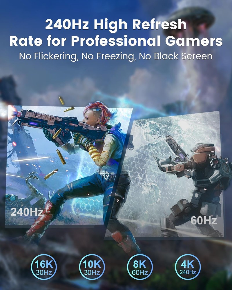 ✔️【Fiber Optic DisplayPort Cable 2.1】This DisplayPort 2.1 is an optical fiber version. Compared with copper cable on the market, fiber optics can transmit over long distances without loss. It is also resistant to electromagnetic interference, so you no longer have to worry about blur, distortion, and delay. Stable, smooth, and high-speed data transmission makes you win the game. It is fully compatible with FreeSync and G-Sync. ✔️【Immersive Gaming Experience】Our DisplayPort to DisplayPort 2.1 cable supports 3D, HDR, HBR20, HDCP 2.2, Dynamic HDR, DSC1.2a, UHBR10, 3D stereo imaging technology, Auto Low Latency Mode(ALLM) and Variable Refresh Rate(VRR), 32-bit/1536kHz audio channel transmission allows you to finely detect the dynamics of enemies, making it the best choice for enthusiast e-sports players. ✔️【Born for Enthusiast eSports Gamers】This DP2.1 cable is a four-core optical fiber with multiple internal shielding and a latch-free design. The 24K gold-plated connector is anti-corrosion and more durable. It has high anti-electromagnetic interference and anti-RF interference capabilities and can withstand more than 35,000 times. Bend tested without affecting cable flexibility and ensuring optimal performance. ✔️【Wide Compatibility】Our display port 2.1 AOC can be used on all devices with DisplayPort interfaces. Plug and play, backward compatible with DisplayPort 2.0/1.4/1.3/1.2/1.2A/1.1/1.0. It also works seamlessly with popular gaming graphics cards like RTX 4090, 7900xtx, 4080ti, 4070ti, 3090, 3080, and more. Connect to HDTVs, monitors, displays, and gaming graphics cards with DisplayPort for crystal-clear audio and HD video. ✔️【Buy with Confidence】We offer a 5-year warranty for this DisplayPort 2.1 cord. If you have any questions, please feel free to contact us and we will provide you with professional technical support.