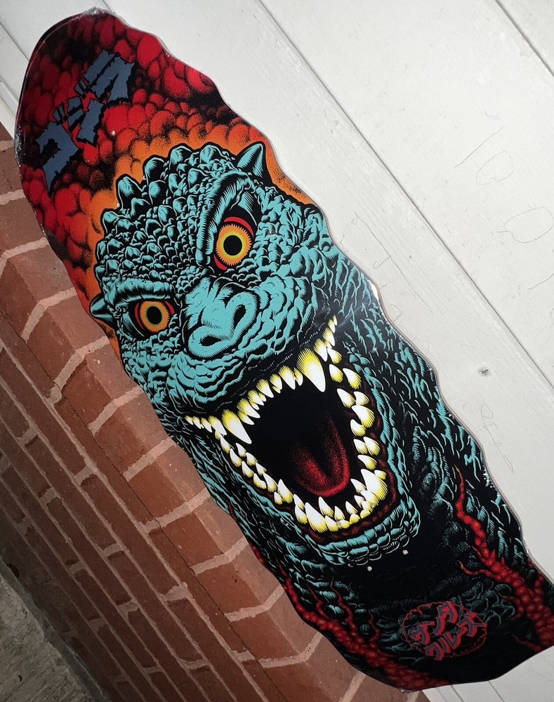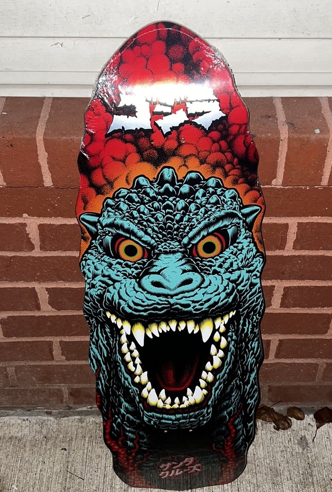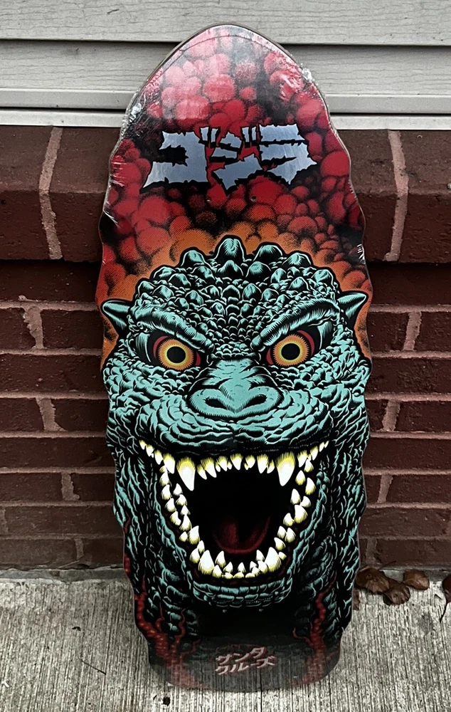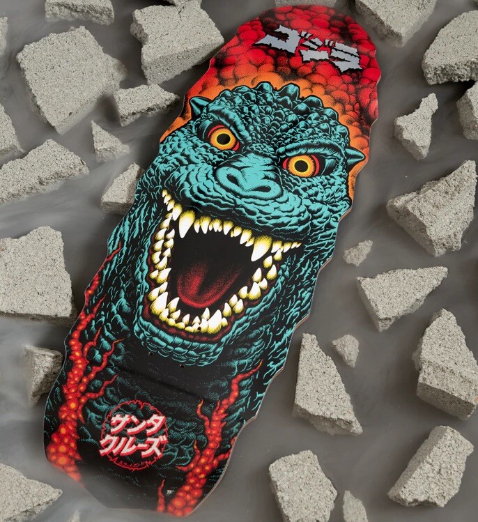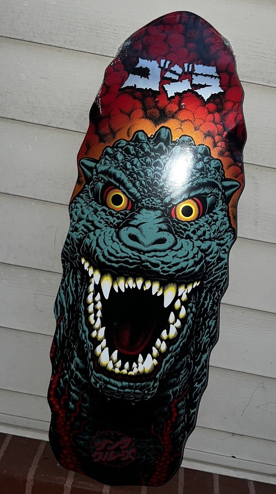 BRAND NEW & SEALED. Currently sold out!! DM FOR ANY QUESTIONS. Unstoppable forces collide when the original King of the Monsters along with its legendary cast of kaiju, joins forces with Santa Cruz Skateboards to release our exclusive, officially licensed Godzilla collection.*Shown with original hand drawn illustration (not included) Santa Cruz Skateboards Godzilla Destroyer deck featuring spot gloss and silver mirror foil graphics, Godzilla vs. Santa Cruz deck top graphics and laser engraved Godzilla logo. Extra thick, custom Godzilla shaped deck for destroying spots. 7 Ply North American Maple, pressed individually using epoxy - making a strong, responsive deck with long lasting pop and consistent concave and kick. Old School concave is a blast from the past. With a comfortable side to side concave and continuous tail kick OS concave gives you easy foot placement on cruisers, shaped, and old school boards with longer tail than nose.