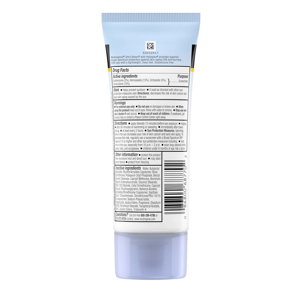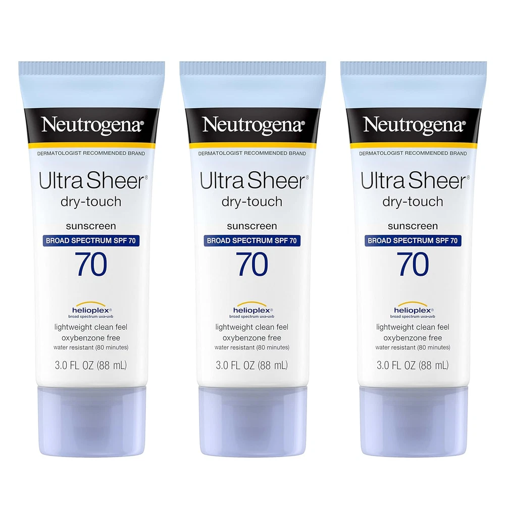 3-fluid ounce travel size bottle of Neutrogena Ultra Sheer Dry-Touch Non-Greasy Sunscreen with SPF 70 for broad spectrum UVA/UVB protection This lightweight and sheer sunscreen is fast-absorbing with Dry-Touch technology for a non-greasy, matte finish that leaves skin feeling clean. The face and body sunscreen is formulated with Helioplex for superior sunburn protection for your skin The Helioplex sunscreen provides superior broad spectrum protection from skin-aging UVA and skin-burning UVB rays. This sunscreen lotion helps prevent sunburn and when used as directed, may help decrease the risk of skin cancer caused by the sun PABA-free and non-comedogenic, this lightweight sunscreen provides powerful face and body sun protection without the heavy finish, making it great for daily sun protection. The convenient travel size sunscreen is perfect for sun protection on the go Non-greasy sunscreen from the #1 dermatologist-recommended suncare brand. This sunscreen is also available in both spray and stick form and can be used at the pool or in the ocean for up to 80 minutes of water-resistance Product Description Neutrogena Ultra Sheer Dry-Touch Sunscreen SPF 70 with Helioplex technology helps prevent damaging UVA rays from penetrating deep under skin's surface. Brand Story By Neutrogena