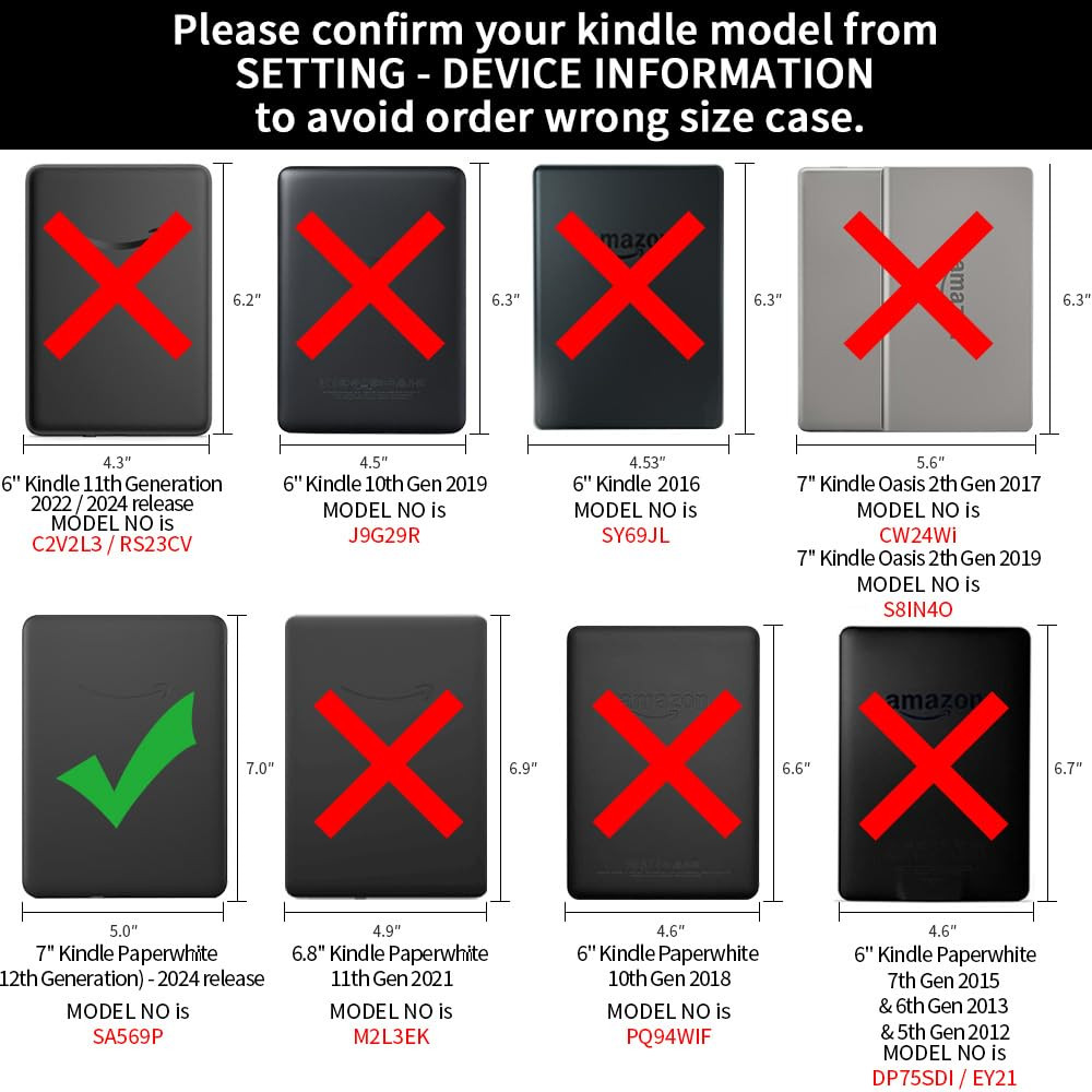 Designed to perfectly fit your 7" Kindle Paperwhite (12th Generation) - 2024 release (MODEL NO. SA569P). Be CAREFUL that this case do NOT fit any other Kindle models! Designed to perfectly fit your 7" Kindle Paperwhite (12th Generation) - 2024 release (MODEL NO. SA569P). Be CAREFUL that this case do NOT fit any other Kindle models! Wake up your Kindle Paperwhite in style: Our product opens and closes just like a book, making it easy and convenient to wake up your Kindle or put it to sleep. Read comfortably for hours: With a thin and lightweight design, our product lets you read comfortably for hours without any strain or discomfort. Keep your Kindle Paperwhite safe and secure: Our product features a magnetic connection that ensures the cover stays securely closed, protecting your Kindle from scratches, bumps, and other damage. Protect your screen and keep it clean: Our product is made from premium fabric with a microfiber interior that not only protects your screen but also keeps it clean and free from dust and fingerprints.