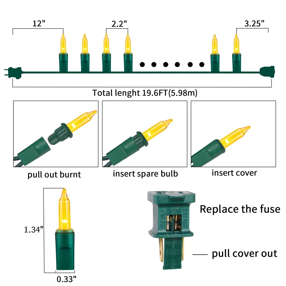 Ultra-Bright Connects End to End Yellow Christmas Mini Lights 100L 19.6Ft UL Listed Incandescent Bulb String Light Set for Indoor Outdoor Holiday Garden Party Christmas Tree Garland Decor Spare Parts Including: 2 x Flasher Bulbs, 2 x Spare Bulbs, 2 x Replacement Fuses, 1 x Instruction, It is a great way to add a little sparkle to your display. 【Ultra-Bright Christmas Mini Lights】:The 100L Christmas Light Set include ultra-bright Incandescent bulbs which are much more bright than normal ones(+50% brightness).It is a great way to add a little sparkle to your display. 【Extra-Long Connects End to End Lights】:With the end connectors,the Christmas mini string lights could be extended up with 5 strings(500Lights total)to a length of 98ft,allow you easily installed without additional tools and decorate your lighting area with the desired length. 【Green Wire Christmas String Lights Decoration】:100L traditional incandescent Christmas light set,19.6Feet Yellow Christmas Mini String Lights,each set include 4 Extra Bulbs & 2 Replacement Fuses.Perfect for indoor and outdoor decoration.Plug in,put it where you want,watch and enjoy this light.The light can be reused for many years. 【Steady On/Twinkle & Safety Use】:The light set can be steady on/Twinkle(Use the Flasher Bulbs included),and easy to fix and replace with spare extra bulbs and fuses when one of the bulbs burn out or break.Thicker green wire with strong insulated copper core, tangle-free to use.High quality UL certified products ensure the safety to you and your family. 【Extremely Wide Use】:The 100L Mini String Lights are versatile.Can be used for indoor and outdoor decoration,great for any scence,for example Christmas,Halloween, home,festivals,parties,club,stage,Holidays,shows,restaurant,hotel,commercial building,shopping center,large venue, wedding,and more.