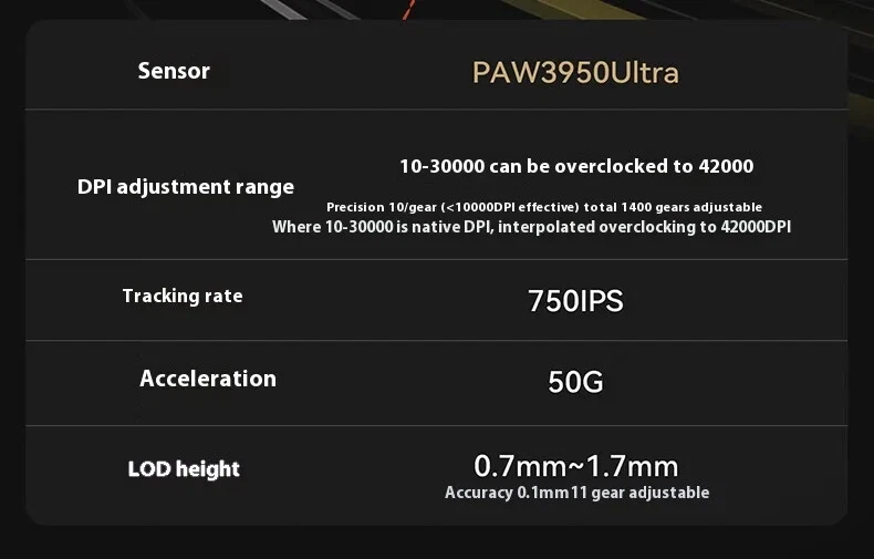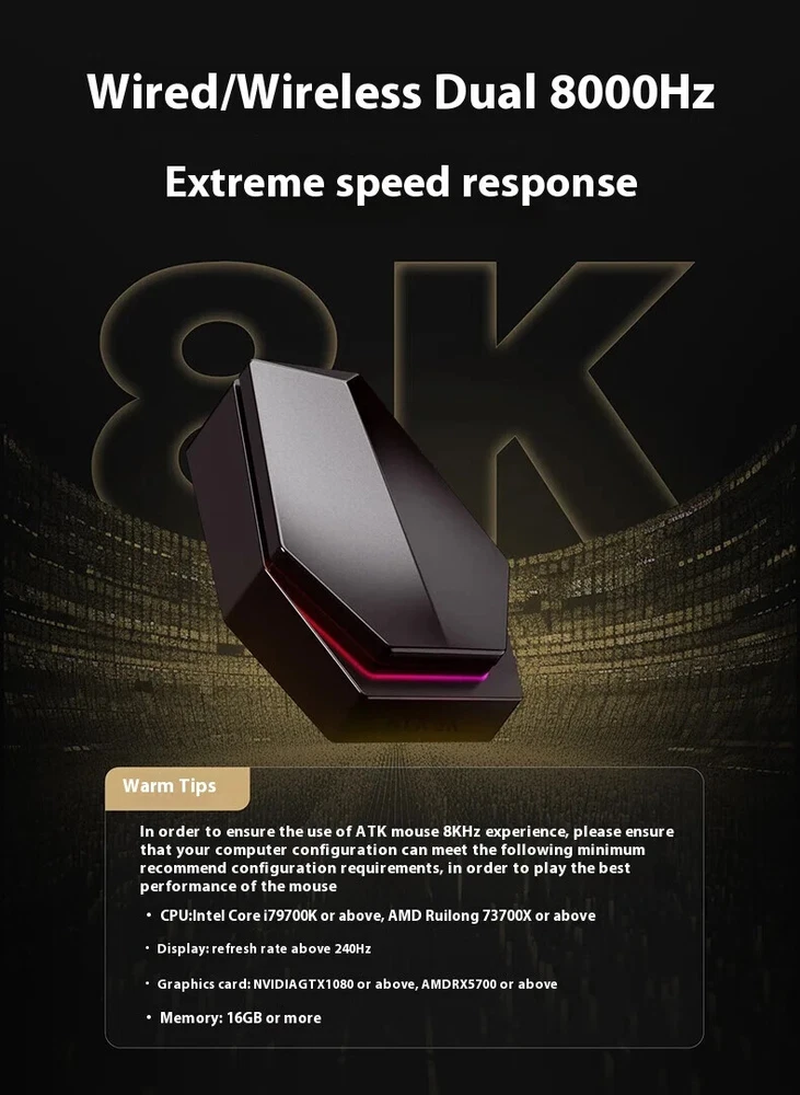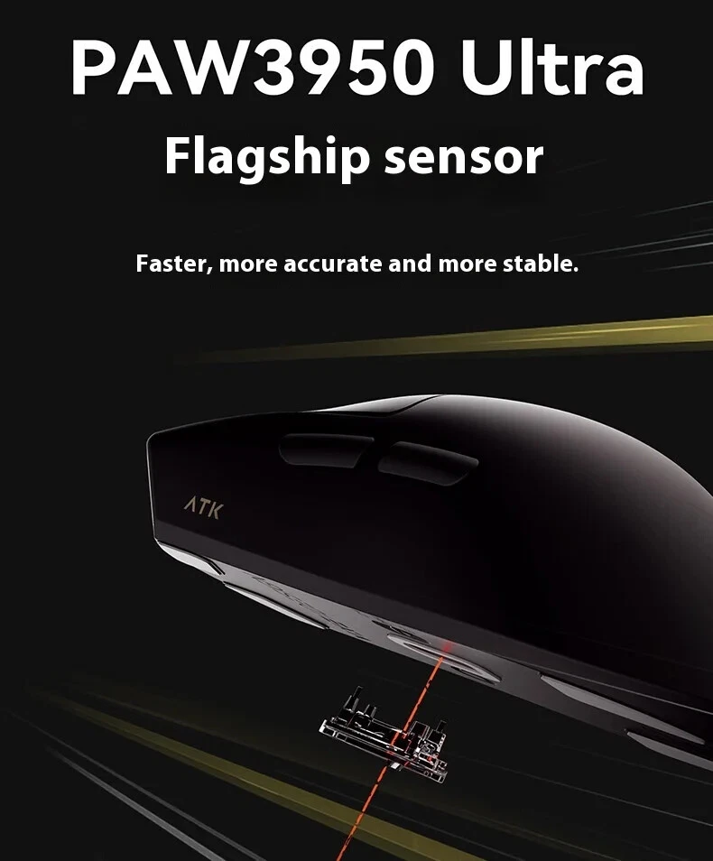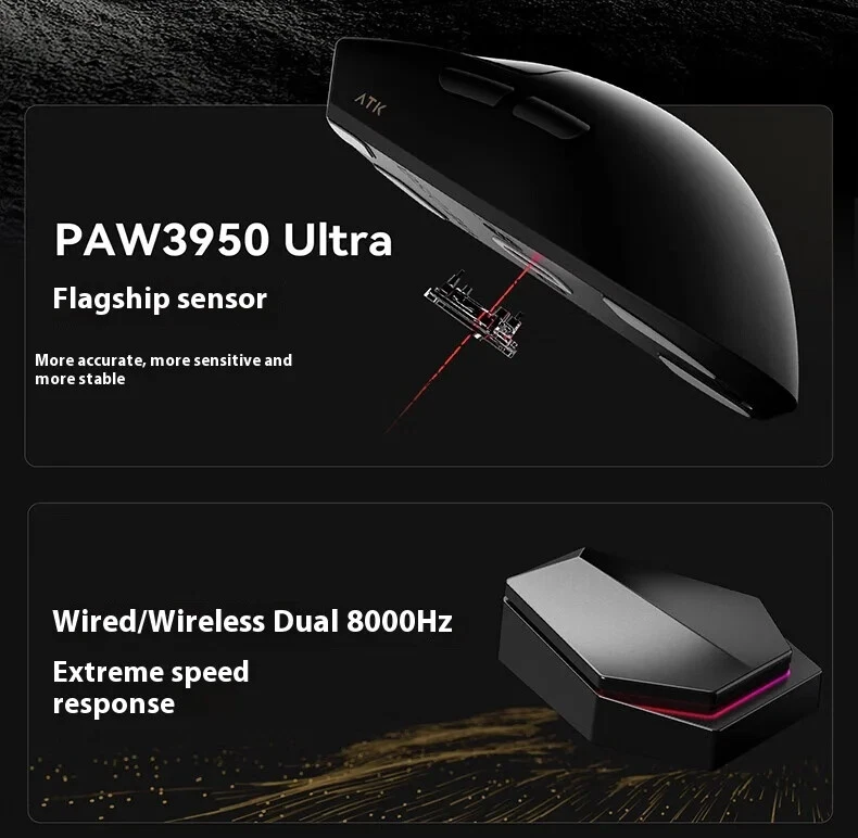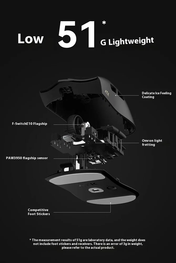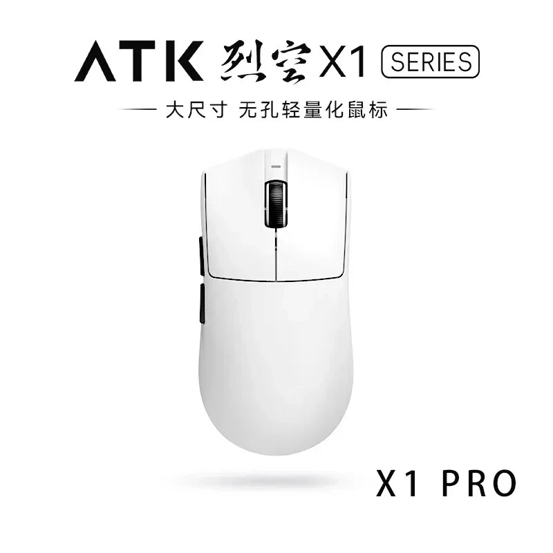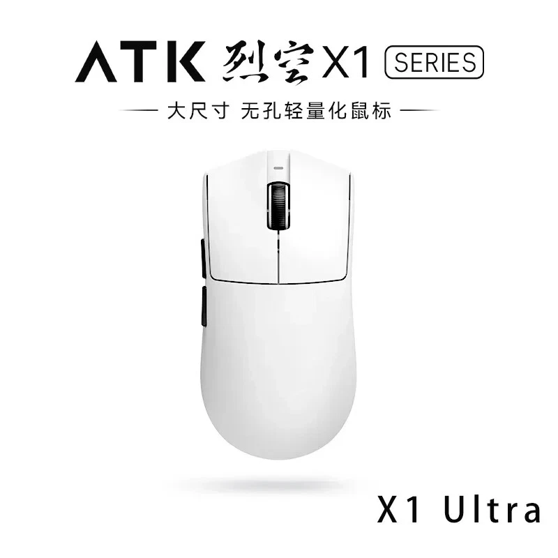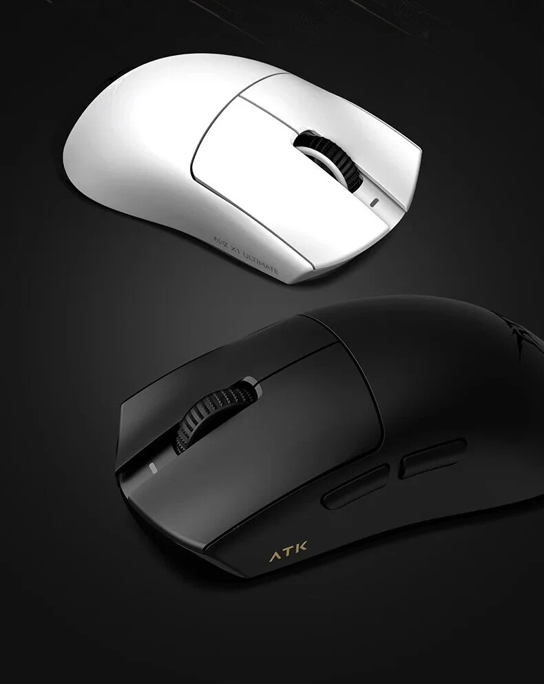 Product name: ATK Ray Sky X1 Ultimate Ultra Lightweight Wireless Mouse Color: Black/White Coating: Ice Sense Coating Sensor: PAW3950Ultra Main control chip: Nordic nRF52840 Transmission technology: Second generation Smart Speed Wireless transmission technology/ATK's professional competitive firmware Return rate: Wired 8K/Wireless 8K Battery: 500mAh Battery life: 150 hours (1000Hz) Product weight: 51g+3g (without foot pads) Main button microswitch: Omron white dot light microswitch-D2FP Side button: Huannuo Scroll wheel: F-Switch E10 flagship Foot pad: Two full-size competitive foot pads are standard Connection method: Wireless 2.4G/Type-C Dongle: Standard 8K dongle