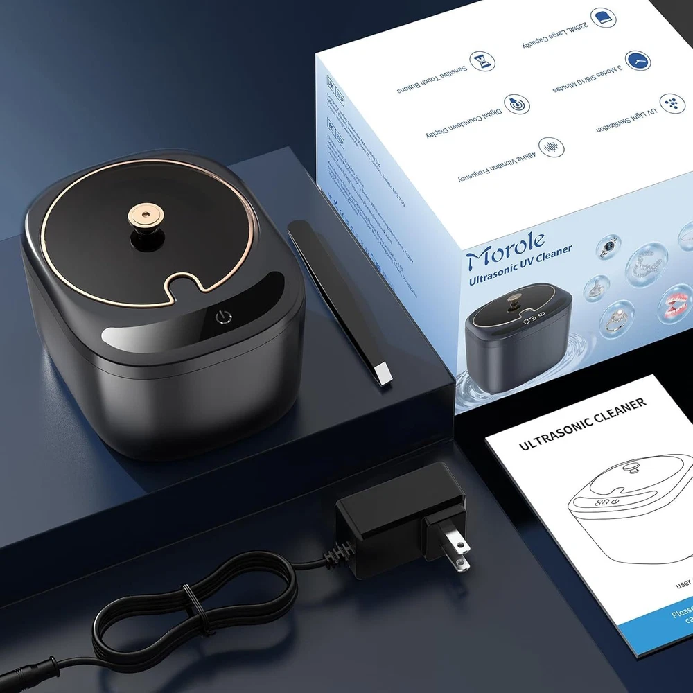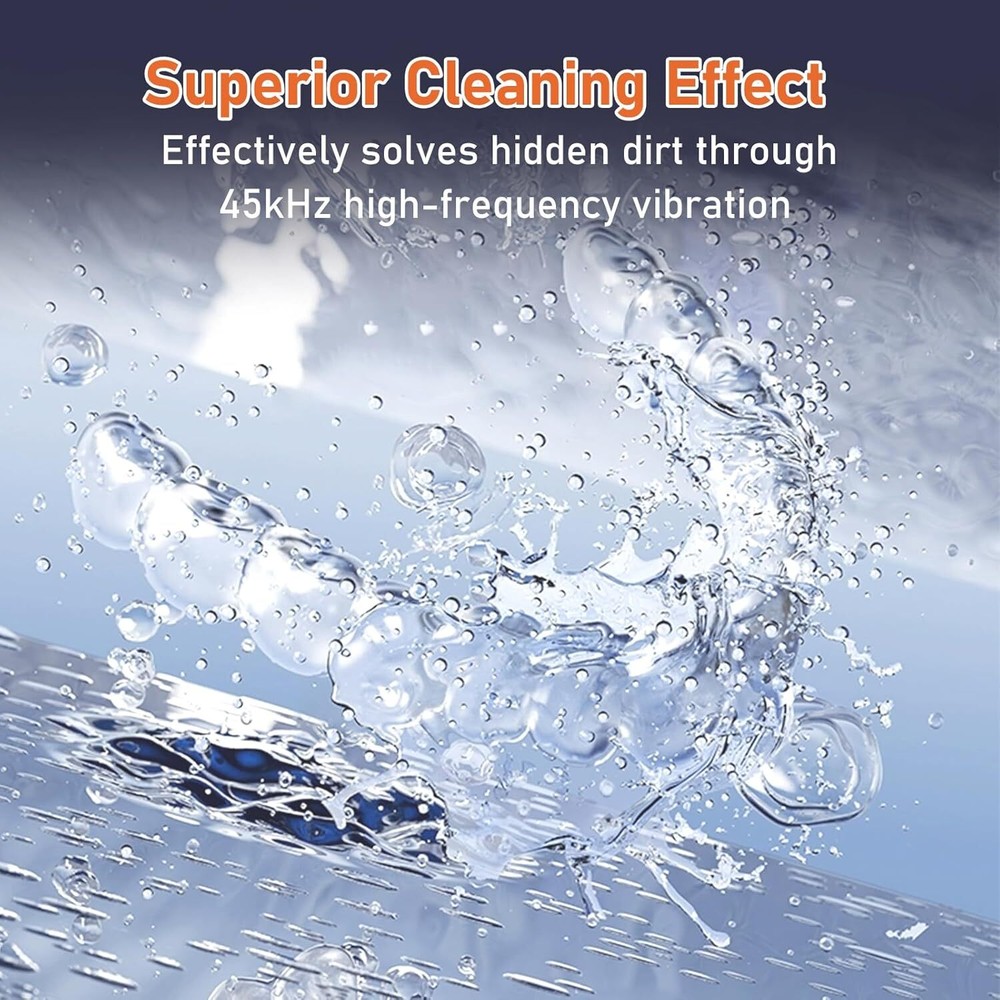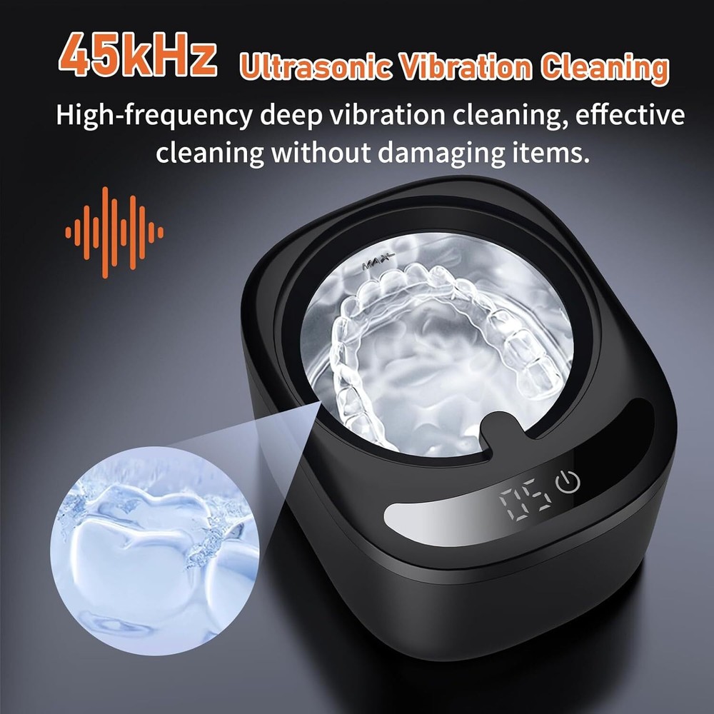 Advanced 45kHz Ultrasonic Cleaning Utilizing 42kHz-45kHz high-frequency waves, this ultrasonic retainer cleaner generates intense cavitation to safely and non-destructively dislodge stubborn stains from dental appliances like Dentures, Aligners, and Nightguards. The 230ml square-shaped tank fits full-size Mouth Guards while reaching hidden crevices in Braces and Jewelry Dual Sterilization UV+Ultrasonic High-intensity UV lamps work synergistically with ultrasonic waves, eliminating 99.9% dirty stuff and odors during cycles. Unlike basic retainer cleaner machines, our dual-action system ensures both physical debris removal and chemical-free disinfection for Dentures and Invisalign trays. Easy to use 3-Mode Operation Tailor cleaning intensity with 5/8/10-minute modes via one-touch control. The top-mounted digital timer displays real-time progress. For deep cleaning dental pods and complex dental appliance structures you can cycle through the 10-minute mode. Cleaning tablets can also be placed on demand. Convenient and Humanized Design The bottom of retainer cleaner machine is equipped with four pieces of non-slip rubber, which is easy to stabilize the tooth guard ultrasonic cleaner, effectively reduce the noise and safer to use. Also equipped with tweezers, convenient for you to put in and take out items. 230ML Capacity & Palm Size 15% larger than standard ultrasonic cleaner for retainers, yet compact for bathroom counters or suitcases. Matte finish resists fingerprints. Perfect for sanitizing multiple items: Braces, Nightguards, or earrings in one session.