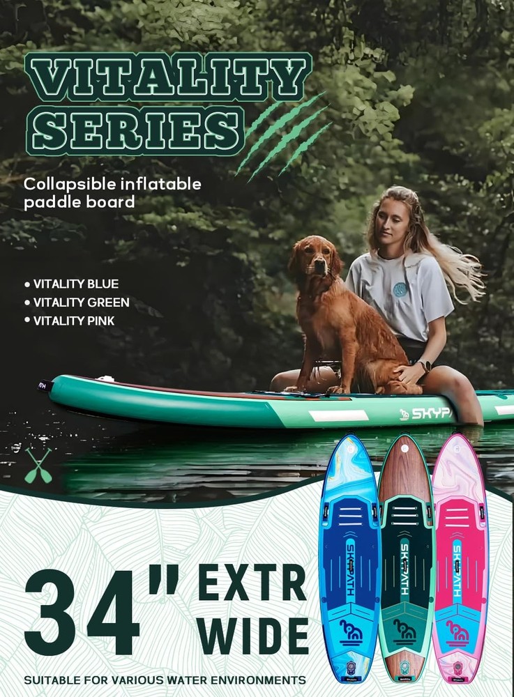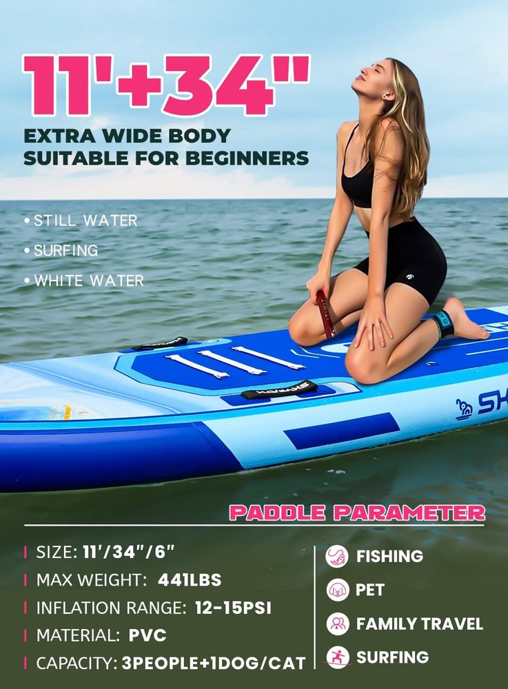 Paddleboarding is such a great sport for anyone with its ease of accessibility, endless diversity and remarkable health benefits. Whether you’re athletic or not, once you’ve learnt the basics, the world really is your oyster on a paddleboard. It has smooth side lines, so you can keep the paddle closer to the board.It has great glide, control and stability, in a wide range conditions. This makes you feel more comfortable and stable while you also track better and glide faster. The wide tail lets you step back and make fast and fun turns with full control. All boards feature additional D-rings to attach a kayak seat and foot strap mount or for shoulder strap set up.Lightweight leash, double action Tiki pump and backpack are included with every board. You don’t need to worry about rocks, trees, or other hard surfaces with the woven dropstitch military grade PVC outer skin. Generous size, 32-34'' width, three removable fins, suitable for any experience level, from beginner to expert and anything in between. The strong friction generated by Extra large, brushed EVA traction pad allows you to stand on the paddle board very stably.