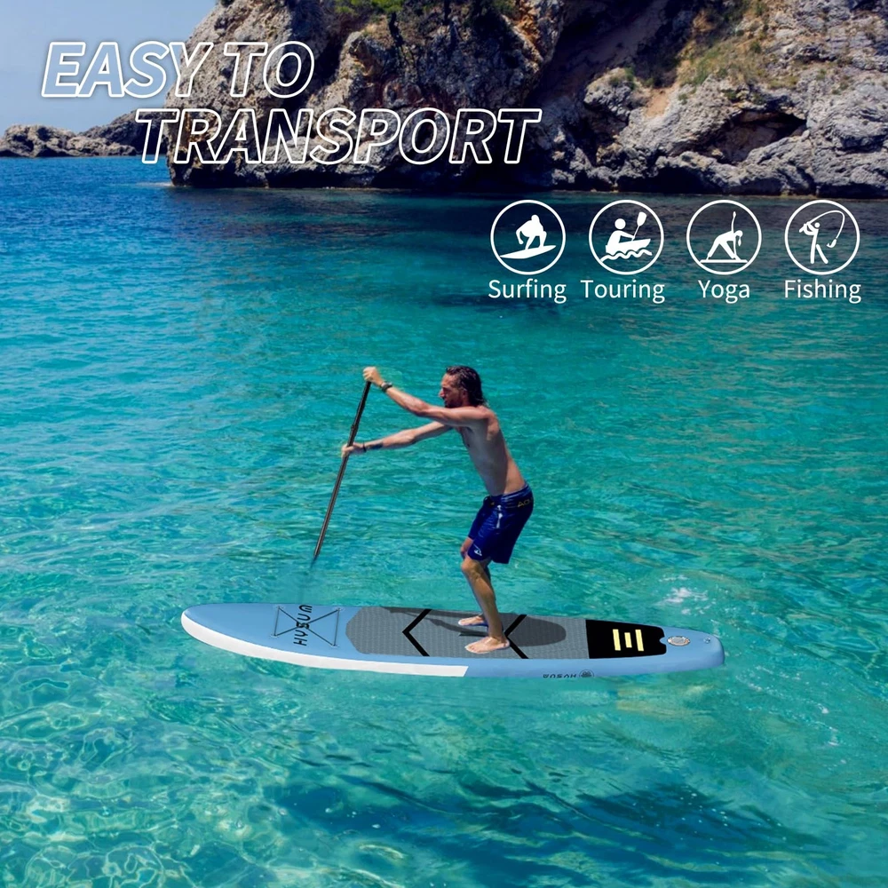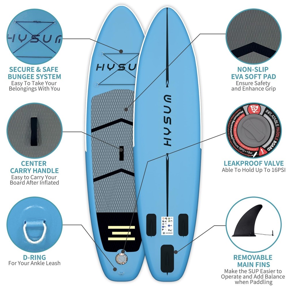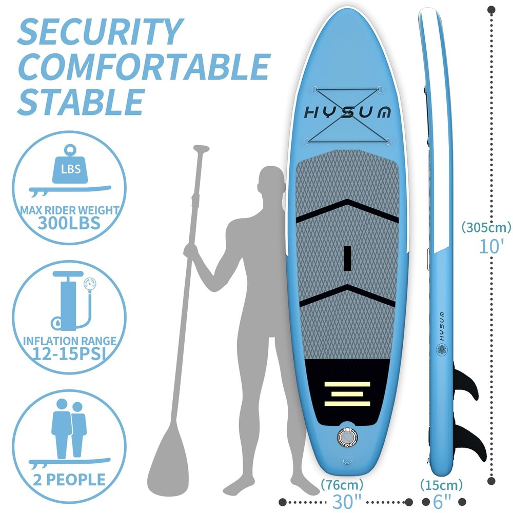 paddle board Please make sure you have a paddleboard(SUP) pump before purchase. HIGHLY DURABLE MATERIALS - 's paddle boards are made of the highest quality military grade materials. With reinforced drop stitch as the core, it can withstand a lot of pressure. The ultra light double wall PVC is 25% lighter than other products of the same size, while this lightweight fabric has excellent abrasion resistance, toughness and long lifespan. The soft, non-slip EVA deck pad keeps you comfortable while ensuring your stability and safety when you stand for a long time. Three removable fins make the board more stable and add balance. You can mount an action camera on the camera mount to record your moments at any time.