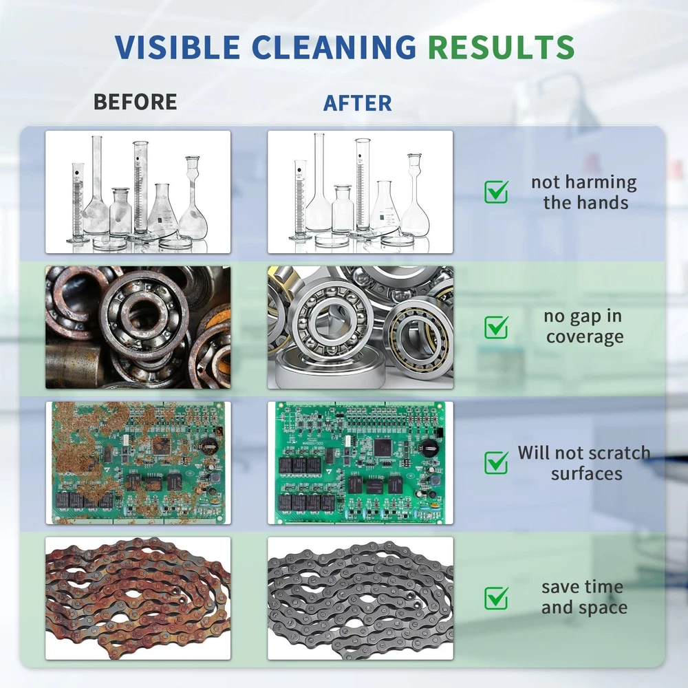 is a professional manufacturer of ultrasonic cleaners and has focused on the R&D of ultrasonic cleaners for more than 10 years. always bears in mind the "quality first, credit first" principle and tries to provide perfect products and great after-sales service. Specifications Tank Material: Stainless Steel SUS304 Heating Power: 200W Ultrasonic Power: 120W Frequency: 40kHz Power Supply: AC110V/60Hz Tank Capacity: 4L Time Setting: 1~20 Minutes or Always ON (LED Digital Display) Temperature Setting: Temp Settings within 0~80℃ Transducer Quantity: 2 sets Tank Size (L x W x H): 300*152*100 mm/11.8*6*3.9 in Product Size (L x W x H): 330*180*240 mm/13*7.09*9.45 in Package Contents 1 x Ultrasonic Cleaner 1 x Cleaning Basket 1 x Stainless Steel Cover 1 x Power Supply 1 x Instruction Manual 40KHz Ultrasonic Frequence for Intensive Rinse: 40KHz ultrasonic frequency can be used to clean stuffs with complicated surfaces, such as blind holes and deep holes etc. Die-casting SUS304 Stainless Steel Tank: The inner cleaning tank of the devices is made with SUS304 stainless steel materials, and it makes the device be resistant to weak acid and weak alkali. User-friendly Control Panel with Simple Mechanical Controllers: The devices are equiped with two simple mechanical industrial controllers which have a long service life and make the devices be operated easily. Always ON or Free time setting among 1~20 minutes: Extensive time-setting range makes the device be freely set to work for any certain time based on the characters of the stuffs to be cleaned. 20~80°C Heating Range for Degreasing and Dewaxing: Heating function is helpful for reducing the adhesion strength of oil and wax so as to improve the cleaning effect, and generally the best cleaning temperature is among 40~60°C, i.e. 104~140°F.
