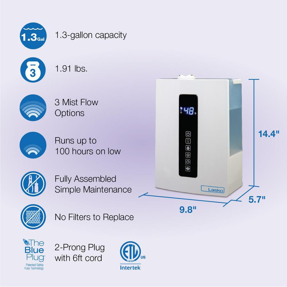 Quiet Ultrasonic Digital Warm And Cool Mist Humidifier Store New Arrivals Add to Saved Sellers View Feedback Contact Quiet Ultrasonic Digital Warm And Cool Mist Humidifier 3 mist flow options for customized room humidity Adjustable LED lighting perfect for use at night Patented safety fuse technology ensures reliable operation Humidifiers create a soothing atmosphere in your home. According to the Mayo Clinic, indoor humidity is best between 30% to 50% and can help soothe common dry air problems of the skin, throat, and sinuses. Additionally, proper humidity levels can create an atmosphere for improved sleep and reduce static electricity from dry air. Use warm mist in winter months and cool mist year-round. The Quiet Ultrasonic Digital Cool and Warm Mist Humidifier from Lasko creates soothing humidity for your room. Aim the mist nozzle where you need it most and choose from 3 mist flow options so you can customize the humidity for your room. The large, removable tank is easy to refill. Use only distilled water in this humidifier. The humidifier runs up to 100-hours on the low setting and will automatically shut off when the tank is empty. Regular maintenance is a breeze because there are no filters to replace, plus the included cleaning brush can be stored conveniently right on the unit. Easy-to-use electronic controls for setting timer mode (12-hour timer), plus adjusting LED lighting, mist options and humidistat. Features patented safety fuse technology. Comes fully assembled. Air Treatment Product Type: Tabletop Humidifier Color: White Color Family: Whites Control Type: Digital Humidifier Features: Adjustable Humidistat,Automatic Shut Off,Timer Humidifier Tank Capacity (Gallons): 1.29 Included Items: No additional items included Moisture dispersion type: Warm & Cool Mist Number of Air Filters Included: 0 Number of Fan Speeds: 3 Power Options: Plug-in Product Weight (lb.): 5 lb Room Size (sq. ft.): Medium (400-1000 sq. ft.) Run time (hours/tank): 100 Voltage (V): 120 Water Filter Replacement Model#: not applicable Certifications and Listings: ETL Listed Maximum Coverage Area (sq. ft.): 600 Product Depth (in.): 5.7 in Product Height (in.): 14.4 in Product Width (in.): 9.8 in ABOUT US Customer service is our top priority! Please be sure to read the description thoroughly to make sure that this is the item you want before making a purchasing decision. If you have any questions about this item, please contact us via eBay messages before placing your order. We make every effort possible to accurately describe and depict the items. Please be aware that slight variations in color may be due to differences in lighting and computer monitor resolutions. All items are in stock at the time of listing; however, in the unlikely and unforeseen event that we are unable to fulfill your order through any of our networked warehouses, we will notify you as quickly as possible and offer you a 100% refund on your purchase. Thank you for shopping with us. We appreciate your business! SHIPPING We provide fast, free shipping. Most items are shipped within 3-5 business days of receiving cleared payment. We ship to the lower 48 contiguous United States only. We do not ship to P.O. Boxes or APOs. For select items, we ship internationally through eBays Global Shipping Program. We do ship most of our smaller items internationally using eBays Global Shipping Program. If ordering electrical items outside of the U.S., please note that they will come equipped with a standard U.S. voltage plugs. You will need a suitable adapter to use the item in your country. Certain restrictions apply. Standard or Economy Shipping is ALWAYS FREE! You will be notified via eBay messages as soon as your items ship. Special Notice for Freight Items: If an item ships via Freight (Truck) Delivery, a valid phone number will be required so that we can contact you to schedule delivery. The item may be delivered with curbside delivery. An adult signature will be required. Please be sure to have available help on hand to assist you with moving the item to the desired location in or outside of your home. Freight items must be inspected upon delivery. In the unlikely event that damage is observed, you MUST refuse delivery and note the damage on the shipping receipt and send it back via the Freight carrier. Returns will not be accepted on Freight items after they have been delivered, inspected, and the driver has left the premises. RETURNS When returning an item, it must be in all of the original packaging and include all of the original accessories or items that came with it. The item and package should be in original and perfect condition. You will be required to cover shipping on the return of non-defective items. All returns MUST be done within 30 days of date of purchase. Please note that we cannot give refunds or replacements after the 30 day limit has expired. When sending in a return, please note that it can take up to 7 business days for the return to be processed. We do our best to process as quickly as possible. We are extremely fair, and in the rare event of something out of the ordinary happening with our products or shipping, we will gladly work with you to find a fair resolution. PAYMENT We accept all of the standard payment options offered at eBay checkout. To provide a safe experience, eBay only allow payment methods that offer strong protection for buyers and sellers. Your order will be processed pending receipt of cleared payment. Sales tax may be charged depending on your location. DISCLAIMER We are sorry, but we do not honor product exchange requests. If you need to exchange an item received, you will need to go through the normal returns process identified in our returns section and then order the correct item, if it is still available. Orders are processed immediately and dispatched to fulfillment as soon as they are received. For this reason, we are typically unable to honor cancellation requests. If you need to cancel the t
