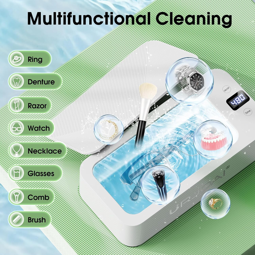 Ultrasonic Jewelry Cleaner 50Khz Jewelry Cleaner Ultrasonic Machine with 5 Timer 360° Deep Cleaning: Our ultrasonic jewelry cleaner utilizes 50kHz high-frequency sound wave technology, creating millions of cleaning bubbles that penetrate every surface to clean jewelry, glasses, dentures, and more. It delivers 360° thorough cleaning, effectively removing stubborn stains while protecting delicate items from damage, leaving them as good as new. 5 Timer Settings with Waterproof Design: This jewelry cleaner ultrasonic machine features a waterproof touch control design, ensuring ease of use in any environment. It offers five timer settings (90 seconds, 180 seconds, 280 seconds, 380 seconds, 480 seconds) to match the level of dirt on your items. Simply touch the button, and the device will start automatically and stop at the preset time to prevent over-cleaning. For enhanced results, use with ultrasonic cleaning solutions and warm water. Low Noise & Portable Design: With a noise level below 45 decibels during operation, this ultrasonic jewelry cleaner machine ensures a quiet and comfortable user experience. Its compact and lightweight design makes it perfect for home use or travel, allowing you to efficiently clean your jewelry, glasses, and other accessories wherever you are. Large Capacity: The 500ml stainless steel tank, made from premium 304 stainless steel, offers ample space to clean multiple items simultaneously, including rings, necklaces, watches, dentures, makeup brushes, and more. The spacious design ensures that every item gets a comprehensive and thorough cleaning, adding convenience to your daily routine. After-Sales : Crafted with high-quality 304 stainless steel, this ultrasonic cleaner is durable and safe to use. We provide a 1-year and have a dedicated customer service team ready to assist with any questions, ensuring a worry-free cleaning experience. Product Description Country of Origin China Package Dimensions 9.92 x 5.43 x 3.5 inches; 1.57 Pounds Complimentary Shipping and Easy Returns Need to return something? Enjoy our 30-day hassle-free return policy! Take advantage of free shipping across all 48 contiguous states! Your order will be dispatched within 1-2 business days once payment is confirmed. Your Opinion Matters! Your happiness is our main goal! We welcome your feedback! If you encounter any problems, reach out to us right away, and we’ll be here to help. Explore the Extraordinary! Our collection showcases fascinating products that are sure to capture your attention. What surprises await you? Delve in and discover unique items that enrich your daily life. Don't miss the amazing things we have in store for you!