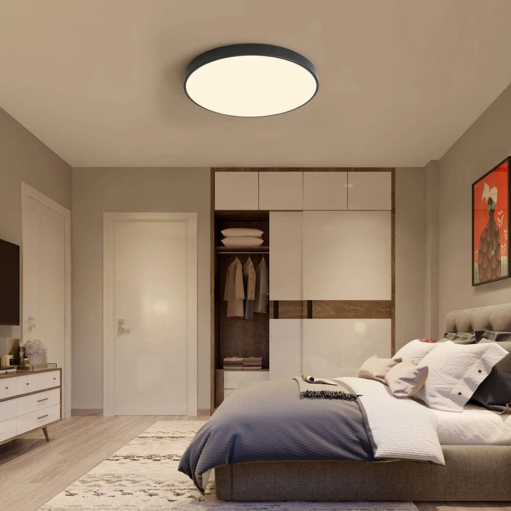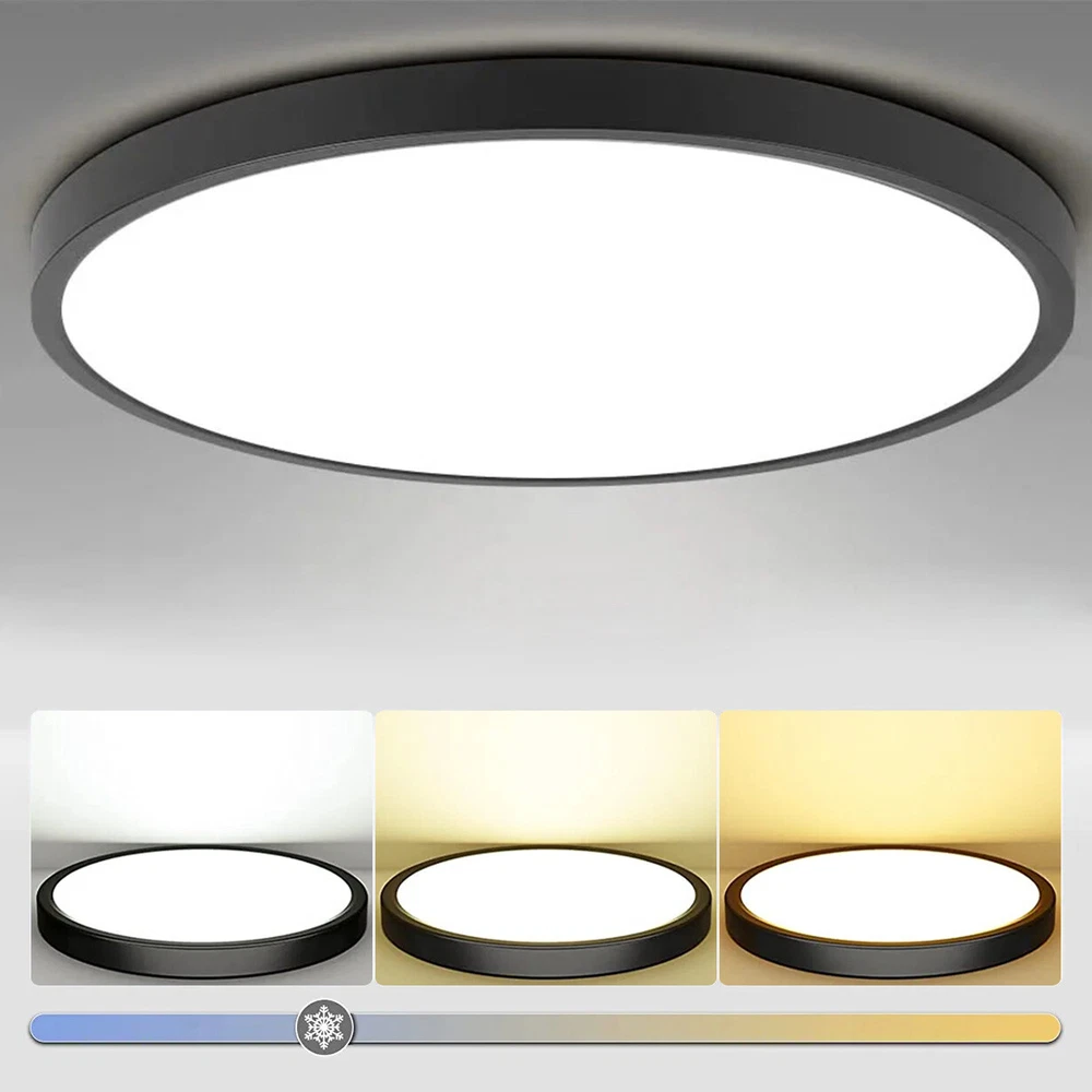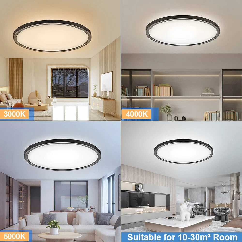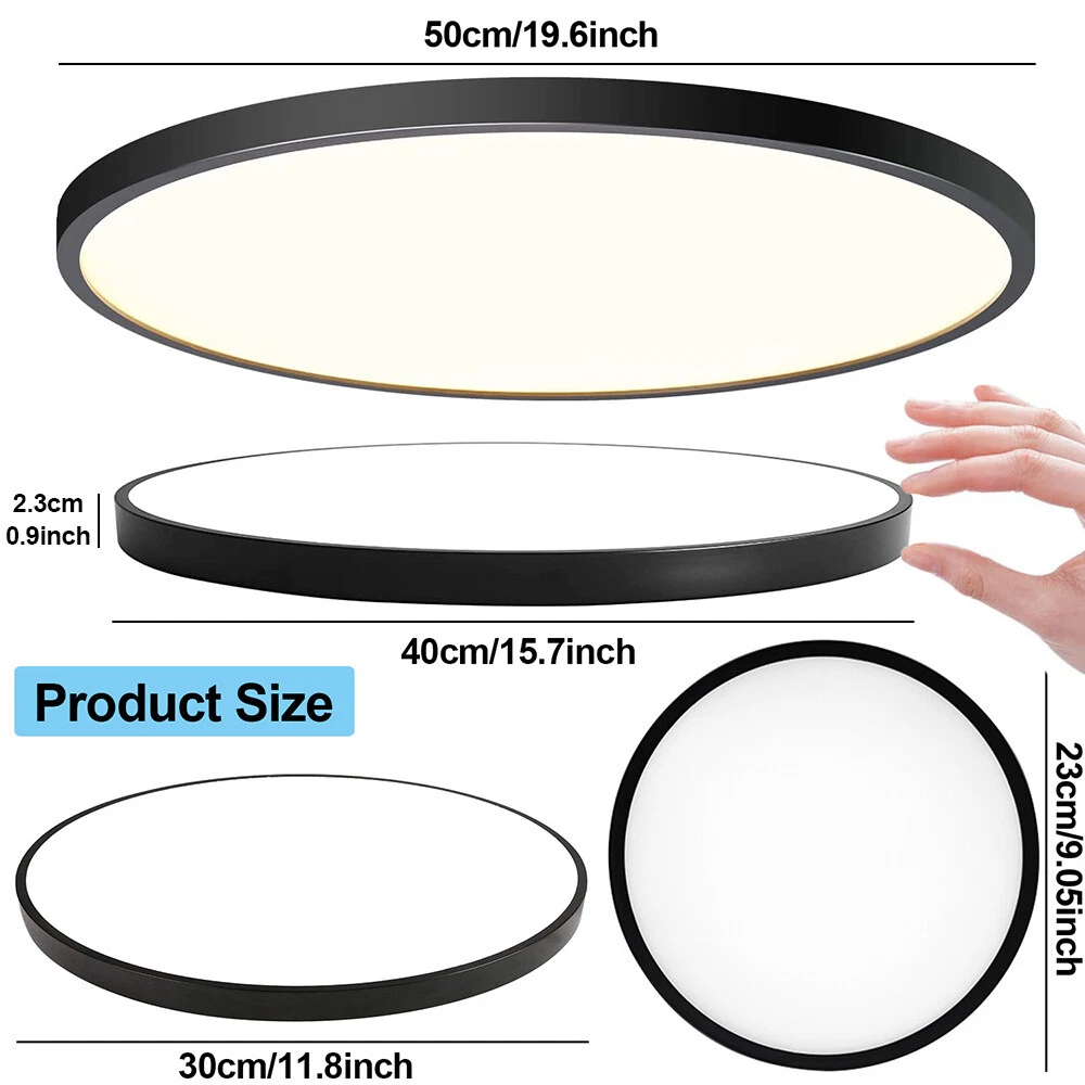 You may also like Retro Ceiling Lamp Fixture Industrial Mental Cage Pendant Lights Cafe Bar Decor 35.19 USD Free shipping Boho Rattan Ceiling Light Chandelier Woven E27 Base 3Bulb Vintage Fixture Wicker 165.59 USD Free shipping Product Description LED Flush Mount Ceiling Light Super Slim 23/30/40/50cm 24W/28W/38W/48W LED Ceiling Light 3 Color Temperature in One 3000K/4000K/6000K Adjustable Ceiling Light fixture for Bedroom Kitchen Dining Room Description: Features: *【High Performance】Our ceiling lamps are integrated LEDs, no bulbs are needed. Four sizes to choose, 9.05inch, 11.8inch, 15.7inch, and 19.6inch, suitable for all size needs. Features AC85-265V 2500lm/3200lm/4200lm/5200 lumens brightness by using only 24W/28W/38W/48W. Energy Savings of up to 90%, for example, the 28W lamp is equivalent to six 40W traditional bulbs(240W). Saving a lot of money on your electricity bills and reducing re-lamp frequency. *【3 Color Temperatures】This flat ceiling flush light has 3 color temperatures, 3000k, 4000k, and 5000k, it is controlled directly by a wall switch, 3 presses for a cycle, no need remote control or app, and is simple to work and operate. Much more durable and Longer lifespan of about 30,000hrs. *【Memory function】Powerful memory function automatically retains the last color temperature. First, turn on the color you want, then turn it off for more than 10 seconds. Turn on the light again you will get back the last setting light color. *【Soft&Bright Lighting】The flush mount LED ceiling light is equipped with high-efficiency LED beads, saving your electricity bills more than traditional LED light bulbs, and protecting your eyes from the glare of traditional lighting. 28W bright and even Lighting easily illuminates a 6-18 square room. Bring you a warm and comfortable feeling for your bedroom, bathroom, and living room. *【Stylish&Thin Design]】 These LED ceiling lights are only 0.9inch thick, well-sealed, and avoid the little bugs, perfect size, and flat ceiling lights well match the ceiling. Modern simple design meets most decoration styles, modern and elegant. *【Easy to install】Very easy to install, only need 3 steps to install. First, connect the AWG, and then fix the base on the ceiling with 3 screws, finally screw the ceiling lamp in the base, and make sure the metal plate inside the lamp is well rotated and stuck at the rightmost of the base, or the ceiling led light may not light up. *【Wide Application】Simple Design of the LED ceiling light can well suit different decoration styles, like living room, bedroom, kitchen, hallway, bathroom(waterproof IP44, no problem for daily use), etc. Energy-saving LED ceiling lights help you to save your electricity bill, a great choice for your home. Specifications: Color: Black Material: PC Working Voltage: AC85V-265V Color Temperature: 3000K Warm White/4500K Natural White/5000K White Power: 24W, 28W, 38W, 48W Diameter: 9.05inch, 11.8inch, 15.7inch, and 19.6inch Thickness: 0.9inch Brightness: 24W: 2500lm, 28W: 3200lm, 38W: 4200lm, 48W: 5200lm Working Temperature: -20℃-60℃ Package includes: 1X LED Flush Mount Ceiling Light Payment Shipping Returns Contact Us Paypal. We only ship to confirmed paypal address. Items are generally dispatched within 1~3 business days after payment is cleared. Please make sure your address in Paypal is matched with your shipping address before you pay. We offer a 30 days return guarantee. If you are not satisfied with the item, you can return it within 30 days after item received. If items have any problem due to quality, please contact us for refund, exchange or a replacement. Please contact us first before item returned. Customer Service from 9:00 am - 6:00 pm on Business Days. Payment Paypal. We only ship to confirmed paypal address. Shipping Items are generally dispatched within 1~3 business days after payment is cleared. Please make sure your address in Paypal is matched with your shipping address before you pay. Returns We offer a 30 days return guarantee. If you are not satisfied with the item, you can return it within 30 days after item received. If items have any problem due to quality, please contact us for refund, exchange or a replacement. Please contact us first before item returned. Contact Us Customer Service from 9:00 am - 6:00 pm on Business Days. powered by