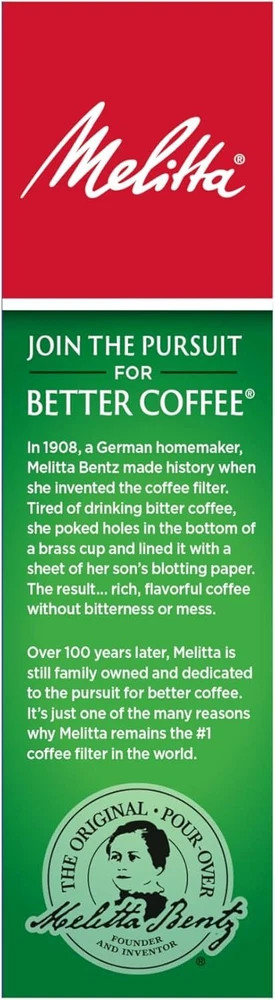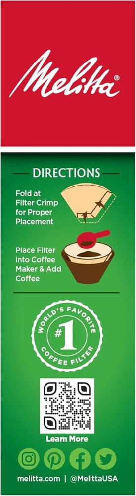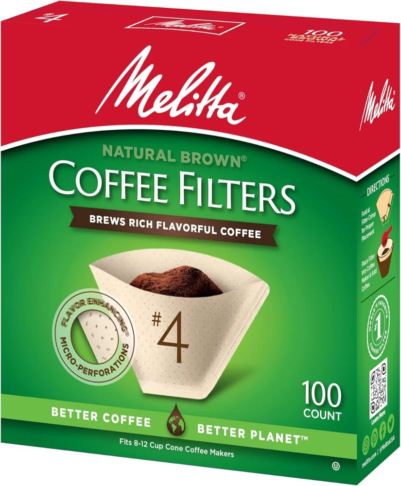 Menu Other Items Feedbacks About Us Contact Us Add To Favorites #4 Cone Coffee Filters, Unbleached Natural Brown, 100 Count (Pack of 6) 600 Total Filters Count - Packaging May Vary Cone Coffee Filters: Premium cone coffee filters will fit all 8 to 12 cup drip coffee makers with a conical shaped filter; Also fits most pour-over coffeemakers that need #4 coffee filters; Traps more bitter oils for a better cup of coffee Advanced Design: Our coffee filters feature Microfine Flavor Enhancing perforations that allow the full coffee flavor to filter through and a double crimped filter design to help protect against bursting Number One Coffee Filter Brand in the World: Our cone, basket and single serve filters are all designed to brew rich, flavorful coffee; They are all compostable and made of high quality paper that won't tear for mess-free brewing Optimal Brewing: Our products are designed to provide optimal extraction resulting in a rich and flavoful cup of coffee which is never bitter Join the Pursuit for Better Coffee: Melitta is dedicated to providing the ultimate coffee experience with our premium coffee filters, coffee pods, pour-over brewers, coffee makers and premium coffees Always store your coffee in an airtight container away from direct light, heat and exposure to moisture. Ground coffee will begin staling soon after the package is opened, so storing it in an airtight container is crucial. An airtight container keeps out odors and protects the internal moisture of the coffee bean, in the case of whole bean. Direct light and heat will begin to degrade the coffee oils, and will affect the flavor and aroma properties. A single pack features 100 Filters (One 100ct Box) and a case pack features 1,200 Filters (Twelve 100ct Boxes) Item Specification Item model number #4 Unit Count 600 Count Material Paper Country of Origin USA Global Trade Identification Number 00055437632171 Item Weight 3 pounds Shape Cone Is Discontinued By Manufacturer No Product Dimensions 13.3 x 10.7 x 8.5 inches Number of Pieces 6 Dimensions Shipping Returns Additional Info Product Dimensions: 10.7 inches x 13.3 inches x 8.5 inches. Weight: 3.0 lb Fast shipping is very important for us. Our standard shipping service is FREE. Your order will be shipped within 1-3 business days upon full payment received. Most items are delivered within 3-5 business days, however, please allow 3-10 business days. We are shipping only to USA. We only ship to the confirmed Paypal address. We reserve the right to cancel any order for any reason at any time. We are not responsible for undeliverable addresses. We offer a 30 day return policy from checkout winning date. Your satisfaction is guaranteed! If for any reason you are unhappy with your item, just return it within 30 days for a full refund, minus shipping cost. Please contact us prior to initiating a return so that we can issue you a refund authorization. Items defective upon receipt must be packaged in their retail packaging as if new and returned with a detailed description of the problem. Return shipping fees are not refundable. We reserve the right to decline any returns if the above guidelines are not followed. All of our items, unless otherwise stated, will only run on 120 volts. Please check to make sure your country complies with these specifications. If you have a problem or question regarding your transaction please contact us before leaving any type of feedback. We will work with you to resolve any problem you may have.