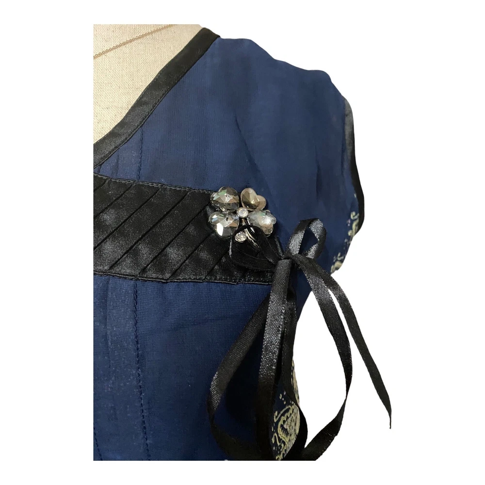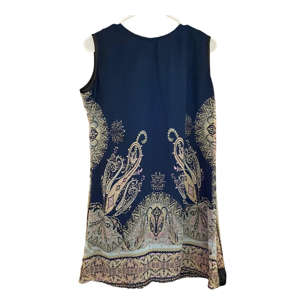 Unbranded Shift Dress Women Size XXL Blue Black Paisley Ribbon Accents Bow Good pre-owned condition, no tag except size tag. ***Minimal wear, is missing one of the four crystals in the broach accent (see all photos - should be easy to find a similar crystal replacement at JoAnn or Michaels to hot glue). Features: - perfect dress for casual summer gatherings, church or family dinners - vibrant shades of blue and black; colorful paisley patterned dress - crystal & bow accents; short sleeves - ribbon detailing at bust and hemline; pleating at mid-section - fully lined; 100% polyester shell and lining - made in China Size: XXL Measurements laying flat: pit-to-pit: 19.5" length: 32.5 waist: 18" Ships FAST & AFFORDABLE next business day. Offers welcome.