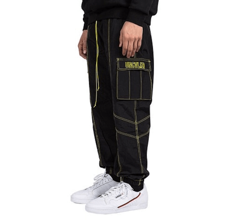 Uncvlizd Men’s Cargo Pants Size Large New in plastic Color Black with lime green stitching Embroidery logo on pockets Side seam pockets, welt pockets, and cargo pockets