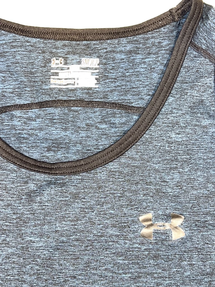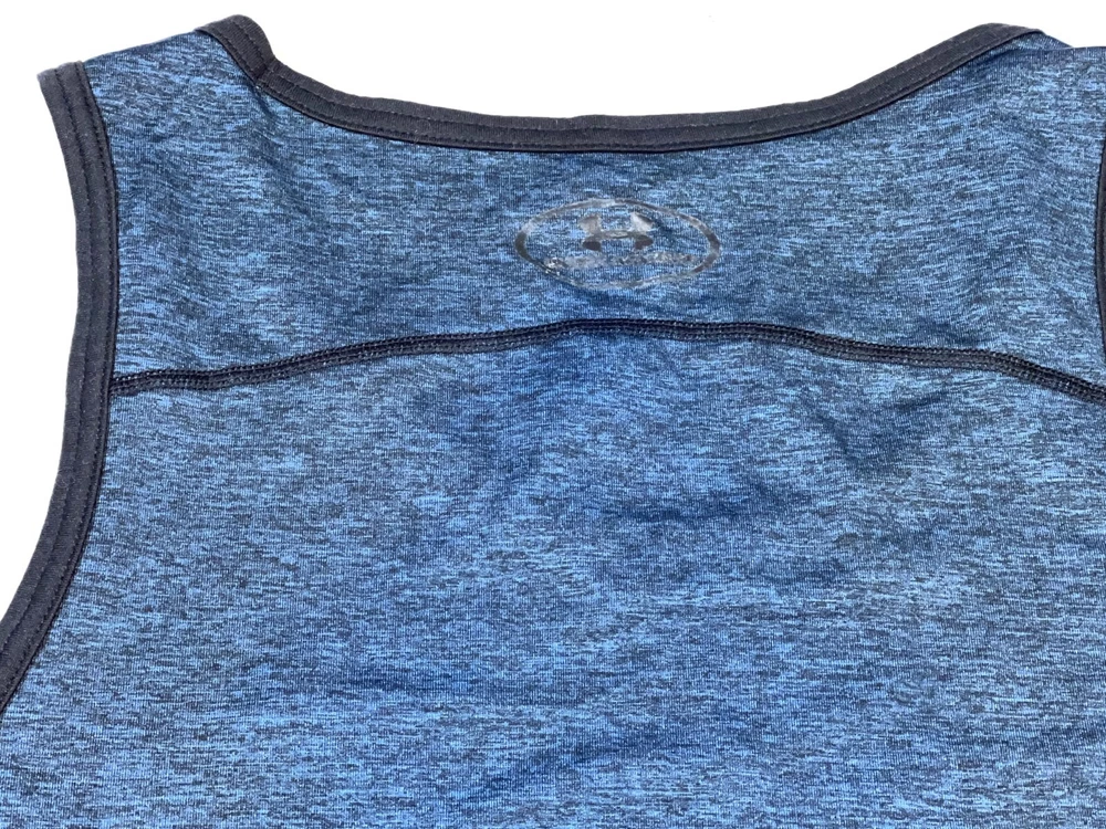 Under Armour Heat Gear Blue Black Marbled Sleeveless Loose Fit Tank Top Shirt ~ Men's Size S - SM Small. Measures: 18" flat across the front from underarm to underarm unstretched and 28" from shoulder to bottom hem.