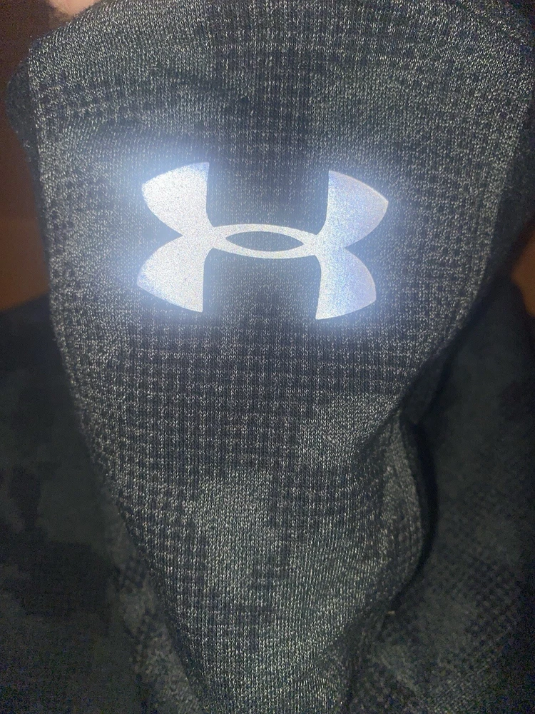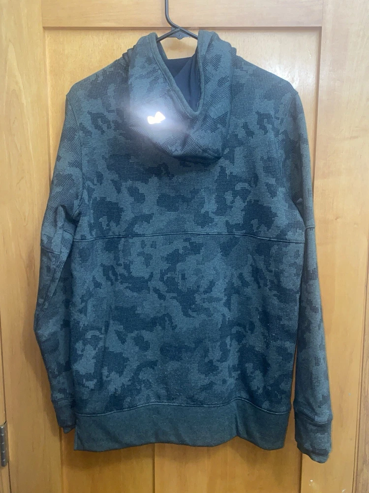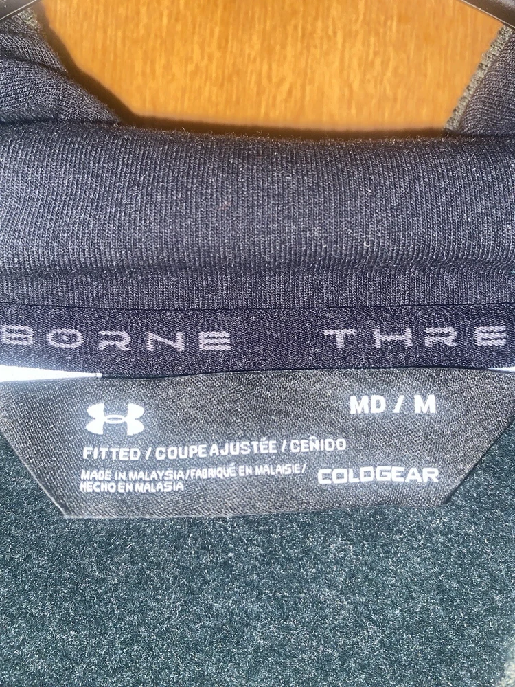 Elevate your activewear game with this Under Armour Men's fitted Thread Borne hoodie in charcoal gray. This hoodie is perfect for any outdoor or sports activity, with its Storm character design and logo accents. The pullover style with a hood and pockets make it convenient for gym and training or running and jogging. Great condition Stain on hoodie shown in the photo Pit to pit: 23 inches Length without hood: 29 inches Sleeves: 27 inches Side zip pockets Body: 53% cotton, 24% polyester, and 23% elastane Hood lining: 57% cotton, 38% polyester, and 5% elastane Pullover hoodie Smoke-free home Made with a blend of polyester, cotton, and elastane, this fleece fabric hoodie is solid patterned and comes in size medium. It is a regular fit and is suitable for all seasons. This Under Armour Rival product line hoodie is manufactured in Malaysia and is sure to be a favorite among active men.