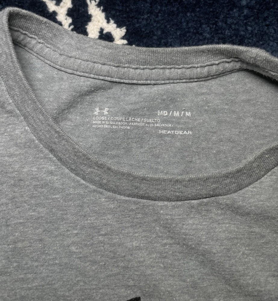 This is a gray Under Armour Project Rock T-Shirt in size Medium with a loose fit. It features a crew neck, short sleeves, and a solid pattern with a graphic print of a Brahma Bull logo. Made of a polyester blend jersey fabric, it is easy to care for and suitable for activewear and casual occasions. The T-shirt is part of the Project Rock product line and is designed for various physical activities like weightlifting, running, and basketball.