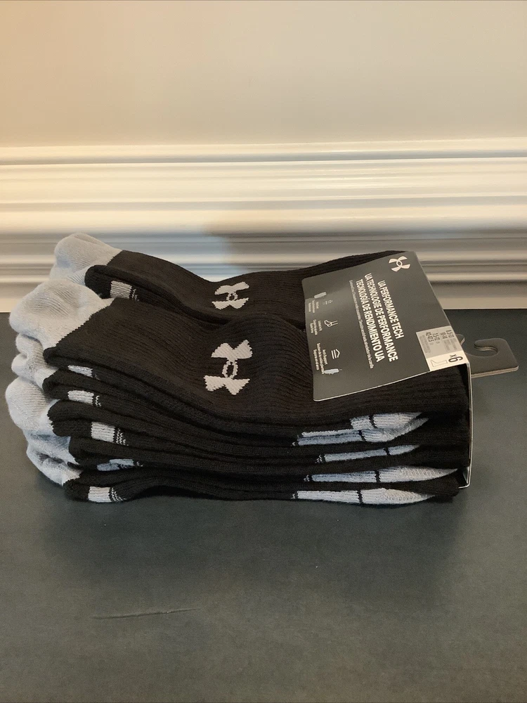 Elevate your workout game with these Under Armour UA Performance Tech Crew Unisex Socks. The socks are made of a blend of polyester, spandex, and cotton, making them durable and comfortable to wear. They come in a pack of six pairs, with a full toe style and over the calf length. These athletic socks are perfect for gym and training activities, and are machine washable for easy care. The black and graphite color combination is stylish and versatile, while the size range of 8.5-13 ensures a comfortable fit for most men. Get your hands on these high-quality socks from Under Armour, a trusted brand in the athletic wear industry.