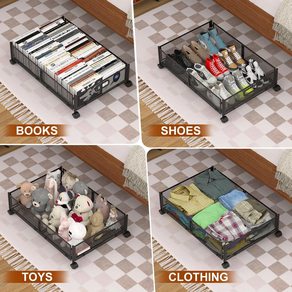 Under-Bed Storage 【High-quality Metal Containers】It has 4 Silent Plastic Wheels. The load-bearing capacity of this carbon steel cart is up to 22 pounds, way beyond the traditional plastics carts or non-woven materials carts 【Tool-Assembly】The installation is so easy that you can install it in less than minute. Just put the four wheels on the frame and then put the shelf onto it. 【Wide Application】It's great for seasonal under bed clothes and shoe storage, bedding storage and more. because of the rolling design, it can also be used as under bed drawers on wheels.It can to make your tiny space a new look! 【Foldable Design 】 Folded Size: 15.9×11.4×2.4 inches. Unfolded size 23.6×15.9×6.2 inches,No waste of space in use or placement. 【360 DEGREE ROTATING WHEELS】With 4×360-degree swivel wheels, this under-bed storage container moves around the home easily,2 of the wheels have a locking function, when you need it to stay still, you just press the locking mechanism .