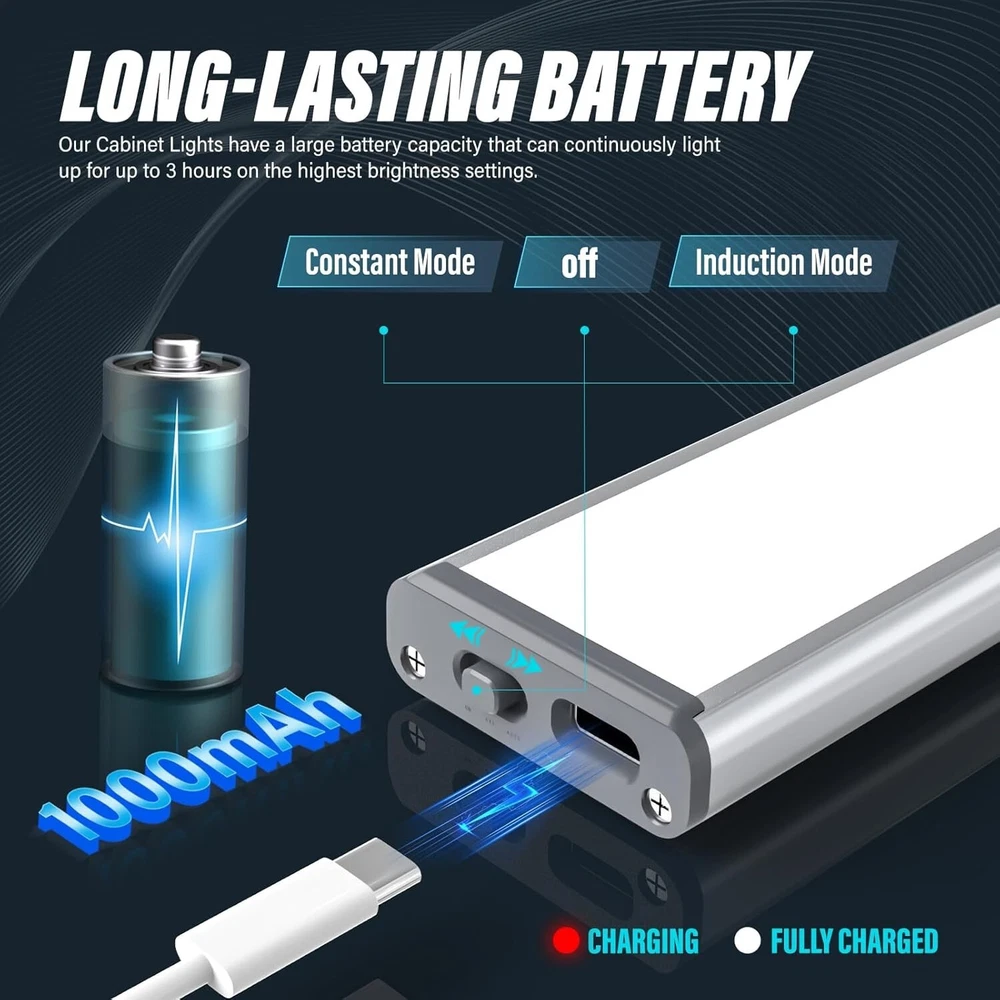 BRAND NEW Soft and Bright Light: With LED lamp beads and a diffuse light design, our 12 inch Cabinet Lights produce softer, brighter, and more uniform light Wide Sensing Range: Our Cabinet Lights feature a high-sensitivity motion sensor that can detect all objects within 10 feet and 120° from the center of the sensor. Any minor movement will immediately turn on the lights, making them convenient and energy-efficient Multiple Sensing Modes: To suit different scenarios, we offer two sensing modes: auto mode, lighting mode Please read the instructions carefully before use to ensure optimal performance. At the same time, we equipped the cabinet lights with the latest type-C charging interface Long-Lasting Battery: Our Cabinet Lights have a large battery capacity that can continuously light up for up to 6 hours on the highest brightness settings. They can also be used for over two months in induction mode, making them ideal for long-term use Non-destructive installation: Our Cabinet Lights can be attached to any steel metal surface. You can also install them anywhere you want using the included metal sheet, without damaging your cabinets or walls