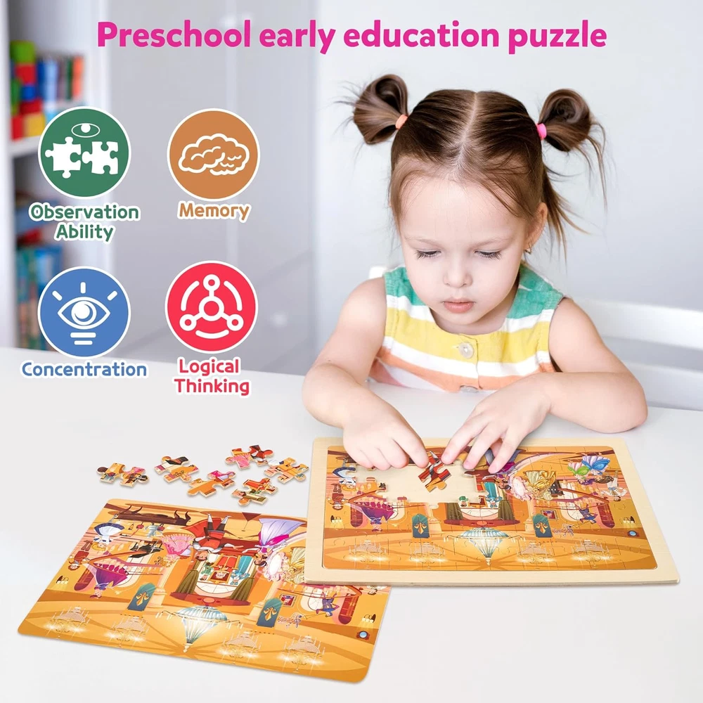 FUN WOOD PUZZLES FOR KIDS: The Wooden Puzzle set contains 6 packs of 60 durable and bright wooden jigsaw pieces that fit smoothly together when assembled to show 6 appealing themes of Ice Castle, Unicorn Princess, Royal Ball, Tea Party, Mermaid, and Fairy. All in a colorful box. SAFE AND DURABLE: Product made with FSC-certified. The wood puzzle is made for toddlers using fine cutting techniques, made of high-quality wood material, and the edges of each piece are carefully polished so that the child can grasp it safely. These puzzles are durable enough to be used repeatedly by children aged 3-5 4-8. LARGER AND STURDIER WOODEN PUZZLE: Finished size 11.8 * 8.8 in. Our puzzles are thicker. We also have removable paper illustrations underneath the wooden puzzle pictures, which are interesting and colorful. The children can serve as a reference. Each puzzle has a wooden frame to help keep the pieces in place. EDUCATIONAL PUZZLE TOYS: This matching puzzle was constructed to help kids train their imagination develop eye-hand coordination, and practice problem-solving as well as spatial reasoning skills as they work to complete the puzzle. Keep kids busy and save parents' time. Your child will have endless hours of fun constructing Unicorn, Princess, Mermaid and Flower Fairy themes. GREAT GIFT IDEA FOR KIDS: The kid puzzle set are great gift choice for birthdays, Thanksgiving, Christmas, Xmas, Easter, Halloween, and other holidays. 60 pieces of wooden puzzles are suitable for boys and girls ages 3 4 5 6 7 8. Enjoy family time while everybody interacts together and build a colorful childhood for your children. Product Description SYNARRY 6-IN-1 Wooden Puzzles Set for Kids Age 3 4 5 6 7 8 Colorful Preschool Educational Learning Puzzles for Kids Boys Girls Solving jigsaw puzzles is a good way to pass time and can engage children for hours. When you provide your little one with an opportunity to engage with a jigsaw puzzle, you are giving them the right tools to improve their memory and make connections between objects. 6 different appealing themes of Ice Castle, Unicorn Princess, Royal Ball, Tea Party, Mermaid, and Fairy with bright colors, rich illustrations make learning more fun while developing their sensitivity to color and shapes. Your child will have endless hours of fun constructing their fairy tale world. Specifications: 6 x Puzzles (60pcs) 1 x Colored Package Box(12.2*9.4 in) Welcome to the Unicorn Princess, Royal Ball, Fairy World, Mermaid, Tea Party and Ice Castle, Different Scenes to Provide More Fun Time for Girls! More Details About SYNARRY Puzzle Pieces Large & Sturdy & Safe Compared to smaller and thinner puzzles, our puzzles are 11.8 × 8.8 in size and are made of strong pieces of wood that are not easy to break and bend. After fine grinding, the surface is smooth and the corners are rounded so that kids can play at ease. Cute & Bright The cute illustration is helpful for kids with a little difficulty. The fun Fantasy theme and vibrant colors arouse your child’s interest in the different objects displayed on the completed puzzles. Great Gift Idea With beautiful packaging, the educational jigsaw puzzles for kids are great gift choices for Birthday, Children's Day, Christmas, Easter, and any other holidays. In addition to CE and TR certificates, all of our products have FSC certification, which shows that our raw materials come from well-managed forests and are environmentally and sustainable. We are a brand store specializing in puzzles, strictly abide by every process, develop and produce excellent educational puzzles, and provide the highest standard of service for every customer. Let the children grow up in the happy puzzle time! KIDS LOVE PUZZLES: Features: Six wooden trays make this easy to store. Provide the right level of challenge to keep your kiddo motivated. Good for 3-5 4-8 years old. Keep your kids busy for hours & Saving parents' time. Good for their memory, observation ability, concentration, logical thinking, and fine motor skills. Why choose us? 100% Safe And Friendly(CE/TR/FSC Certificates). Super Cute And Entertaining! Have Fun Anywhere, Anytime! Note: It's easy to store and doesn't bend. If anything goes wrong with this jigsaw puzzles, or you decide it is just not for you, we will always be there with you.