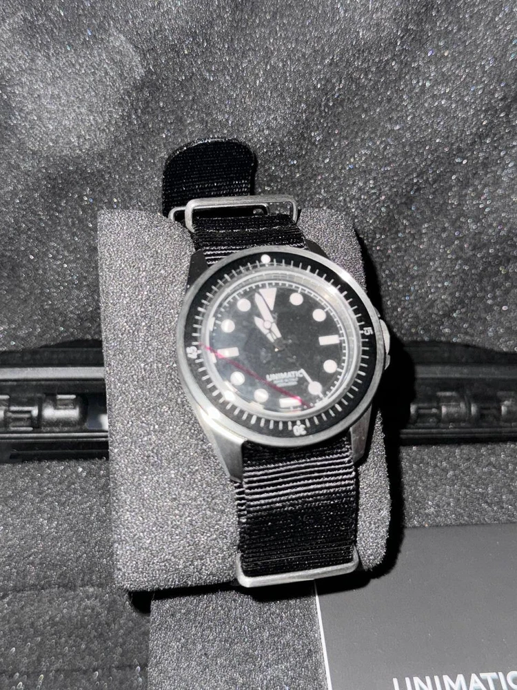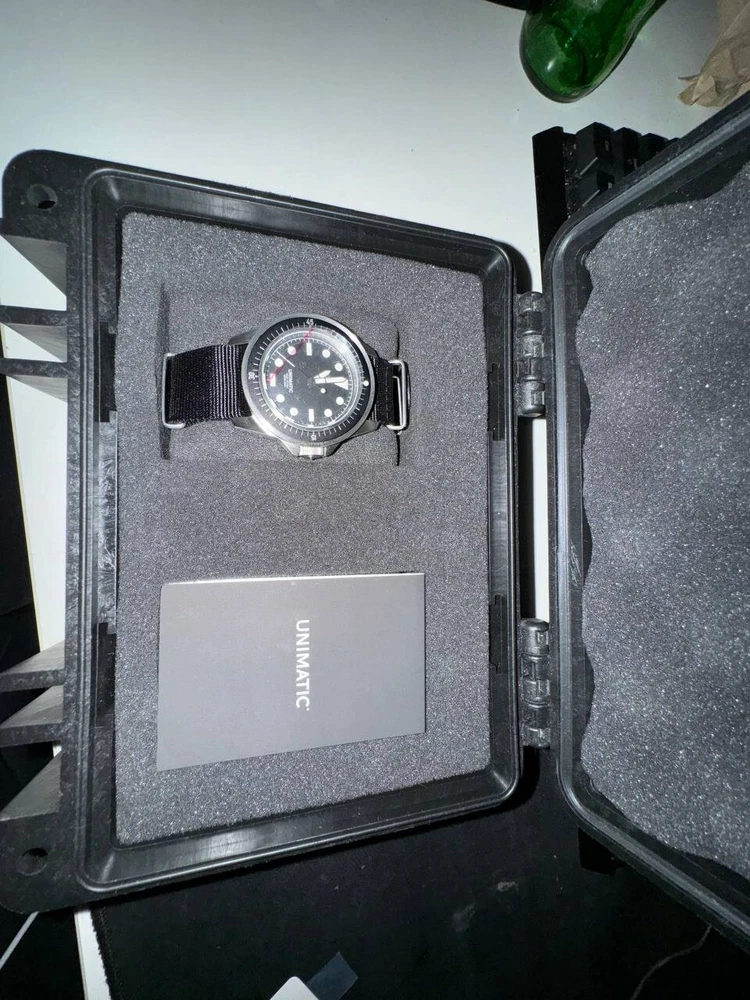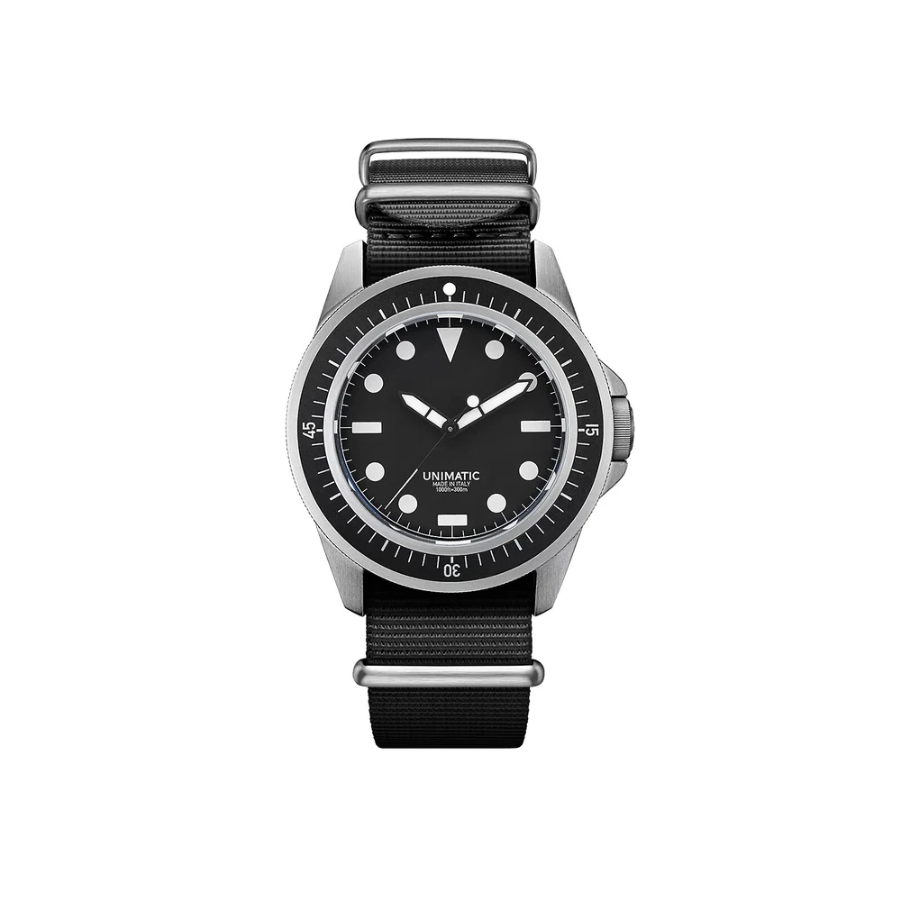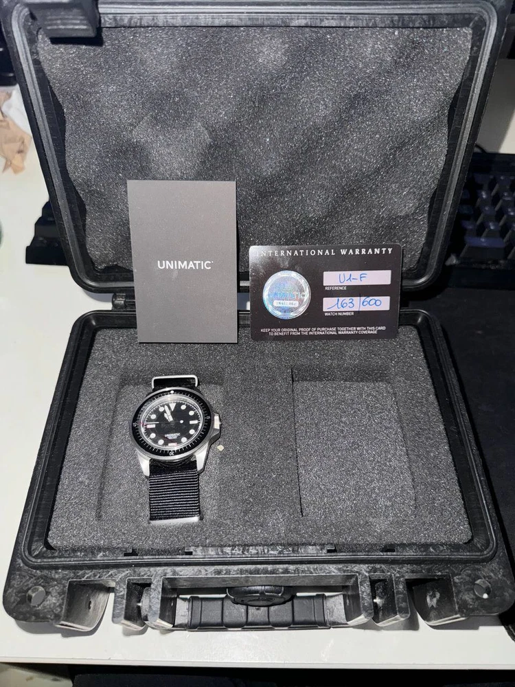 UNIMATIC U1-F Diving Watch - Model Uno - Limited Edition of 600 - NEW WITH Tags Brand new, unworn condition Unimatic U1-F professional diving watch. Part of the exclusive 600-piece limited edition run. Complete set includes: Original box All tags still attached Authentication card from Unimatic in Pictures Protective film still on watch face Black heavy-duty NATO strap with brushed steel hardware Features: Black aluminum professional diver insert Raised lume dot markers Super-LumiNova C1 white markers Black matte diver dial Two-slot shockproof Tough Case construction This is a rare opportunity to own a brand new, completely untouched example of this limited Italian-made professional diving watch. Ships securely packaged with all original materials and documentation.