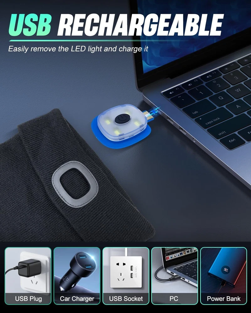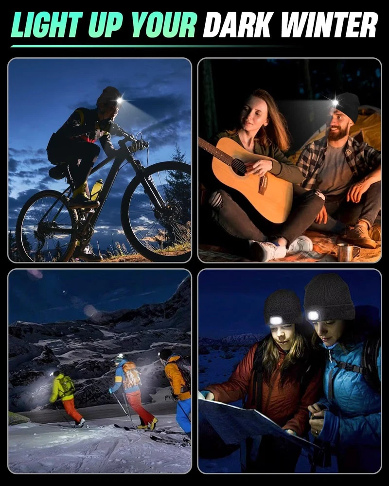 [Ideal Gifts] - This versatile led beanie is suitable for both men and women, making it a unique gift option for occasions like birthdays, Thanksgiving, Christmas, and more. The led hat is a great winter gift for anyone, including parents, grandparents, partners, friends, and siblings. [Universal Fit]-Crafted from stretchable materials, this hat light offers a comfortable fit for heads of all sizes, from small to large, and even those with unique shapes. The headlamp beanie design allows for easy wearing and removal, providing flexibility and adaptability. This led beanie light is a unisex style that suits both men and women. [USB Rechargeable]-Equipped with a built-in light, this beanie light features a standard USB port for convenient battery charging. You can effortlessly charge it using a car charger, computer, or portable power bank. Once fully charged, the headlamp hat provides up to 6 hours of continuous lighting, with a charging time of approximately 2 hours. [Adjustable Brightness]-Enjoy the convenience of three adjustable lighting modes with this beanie headlamp. A simple touch of a button in led beanie hat with light allows you to switch between low, medium, and strong light settings in the led beanie hat with light , giving you the flexibility to customize the intensity based on your needs. [Widely Used]-This hands-free hat with light is an ideal companion for various winter outdoor activities. Whether you're camping, fishing, hiking, climbing mountains, hunting, or clearing snow, this knit hat with light for men will keep you cozy while providing practical illumination.