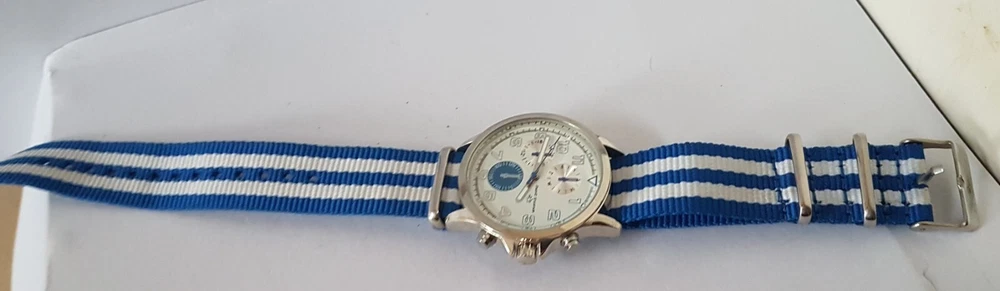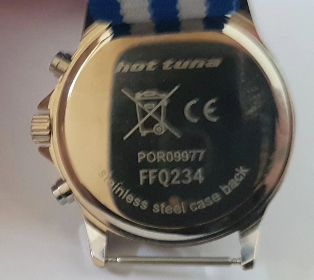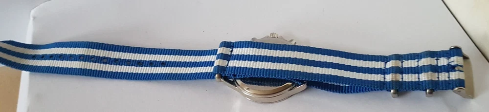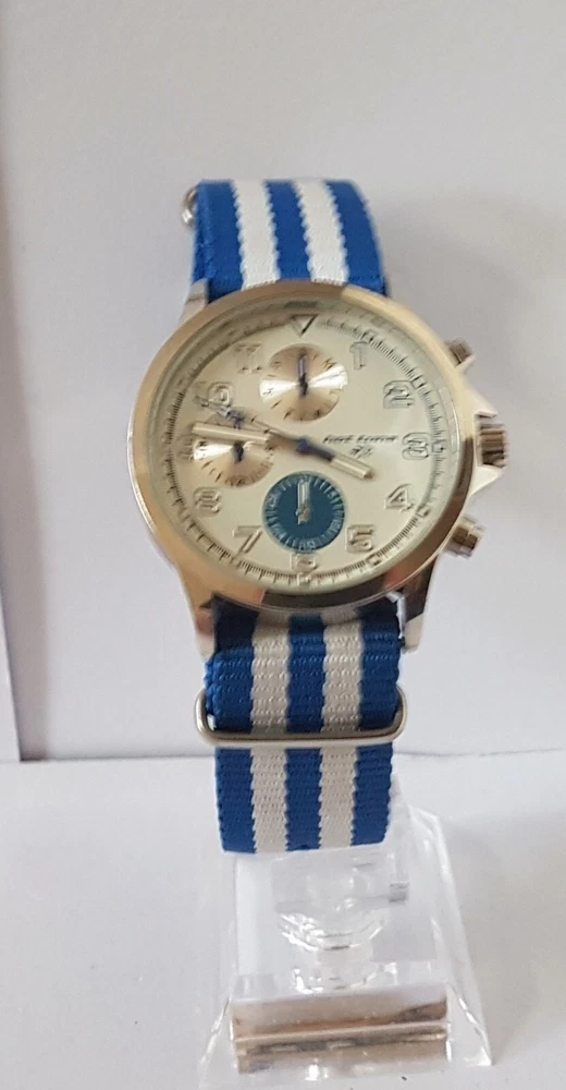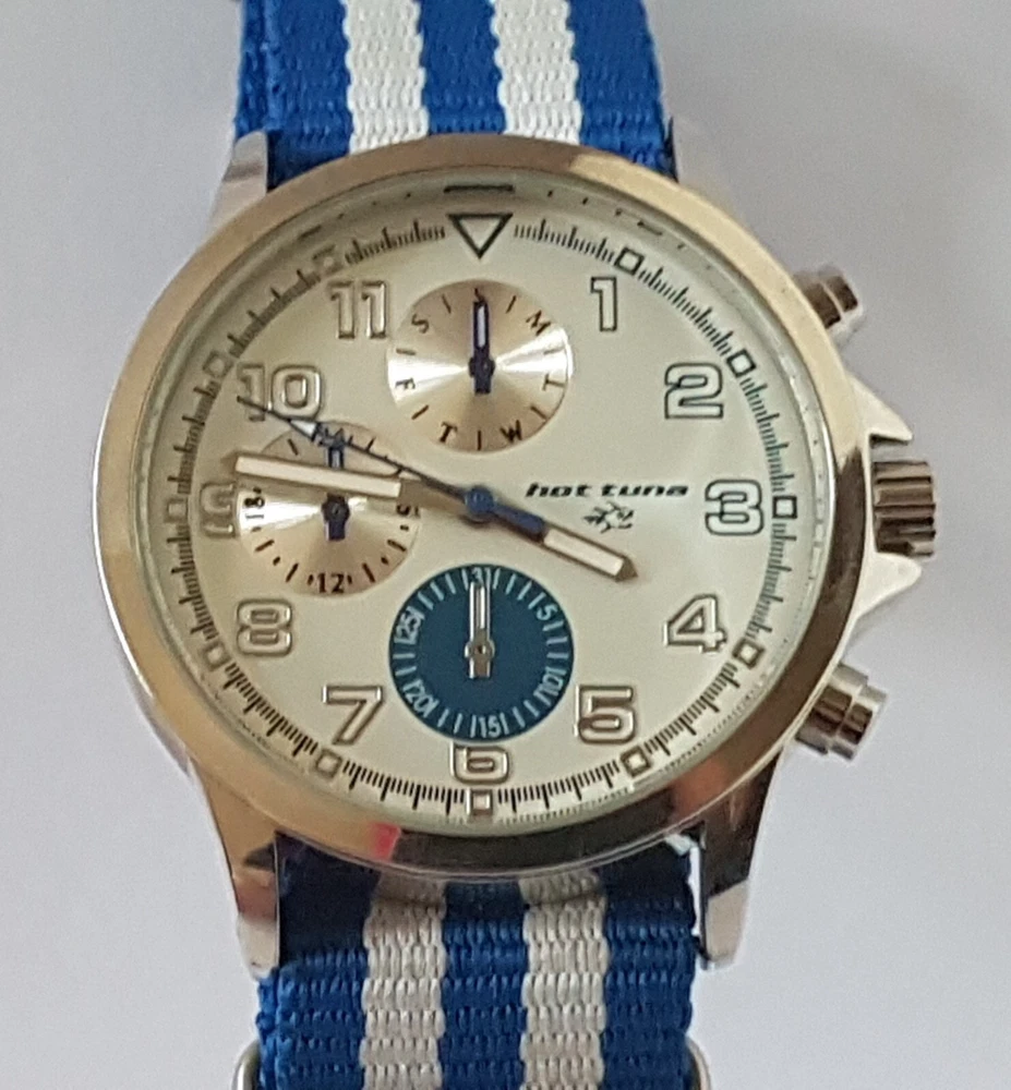 Unisex Hot Tuna Watch With Blue And White Striped Strap. Great watch with adjustable strap,unsure if it's ever been used as in perfect condition. Please note the chronograph features are just for show. In full working order with a new battery inserted