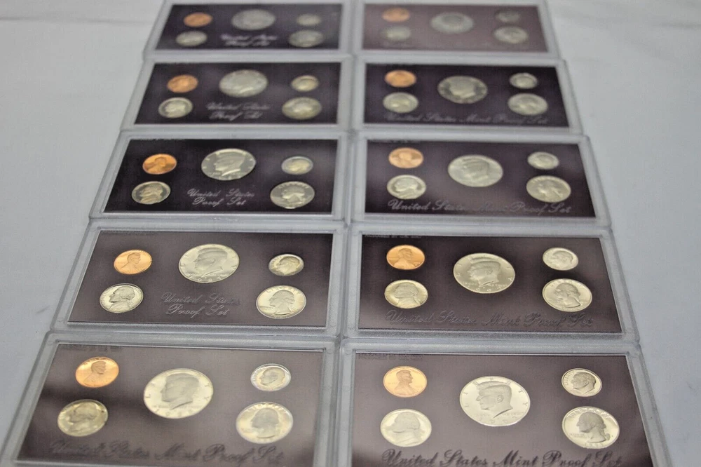 United States Mint Proof Set - ITEM #32 Includes: Lot of 10 Sets - 1984-1993 Very Good for ages. Some staining on cards and there are some with small tarnishing and clouding inside and on the coins and a few of the boxes have some damage. See all pictures for details. CONDITION: AS-SEEN IN PICTURES We are not coin dealers. We have inherited a very large coin collection (1,000+) of various Amercian coins. We have no need for any of them and will be listing them on ebay as time permits. If you have questions, I can try my best to answer but I have no real knowedge of coins, the condition or value other than what's on the coin's packaging and a little research to find a resonable price for each one. Please understand, we are trying to move these and do not want them back. So, if you are interested in purchasing one or more be sure to look at all the photos, read the description and ask questions when in doubt. These are as-seen sales with a NO RETURN - NO EXCHANGE POLICY. Thank you.