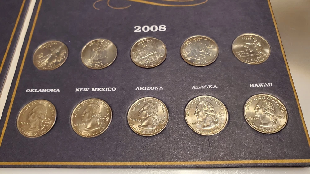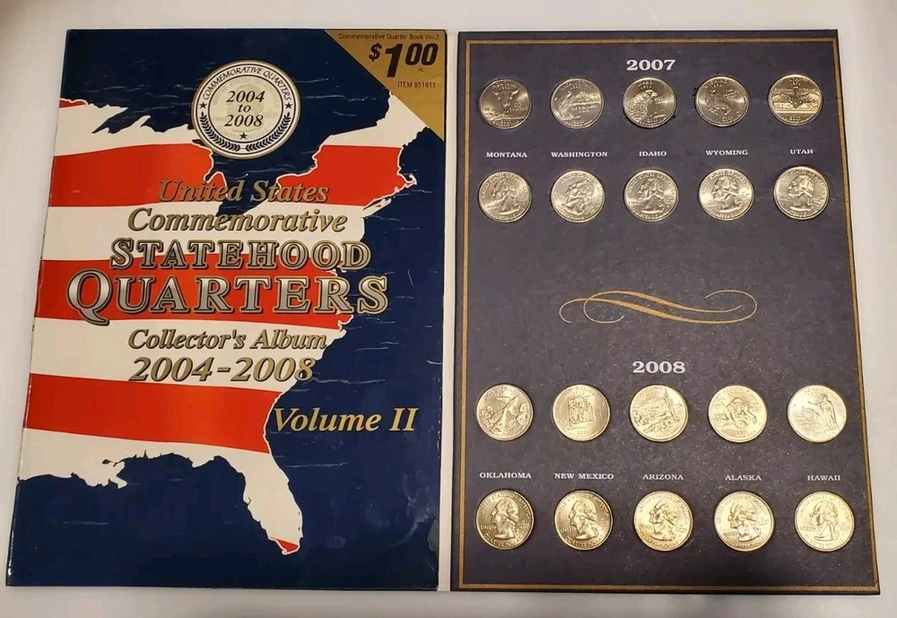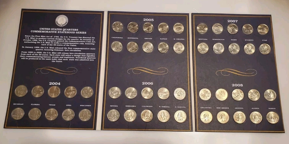 United States commemorative statehood quarters 2004 -2008. Every quarter from 2004 - 2008 as collection states in a folder. Sold asis. Enjoy............International Shipping figured based on location after sale. Ships day of sale.