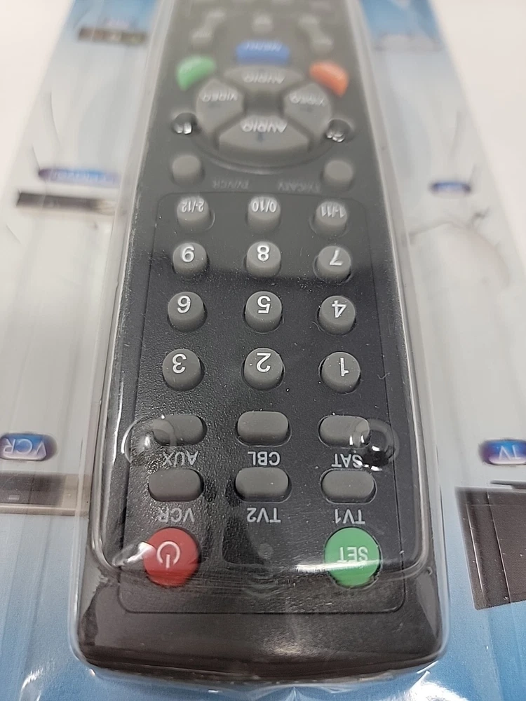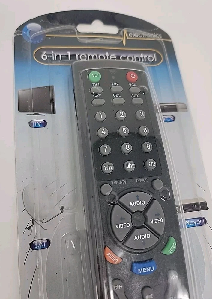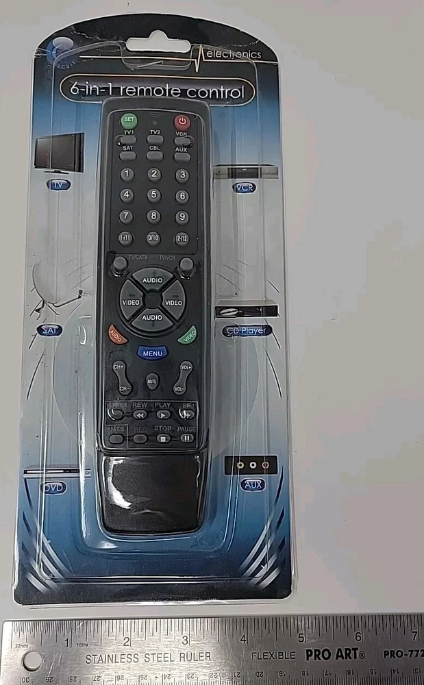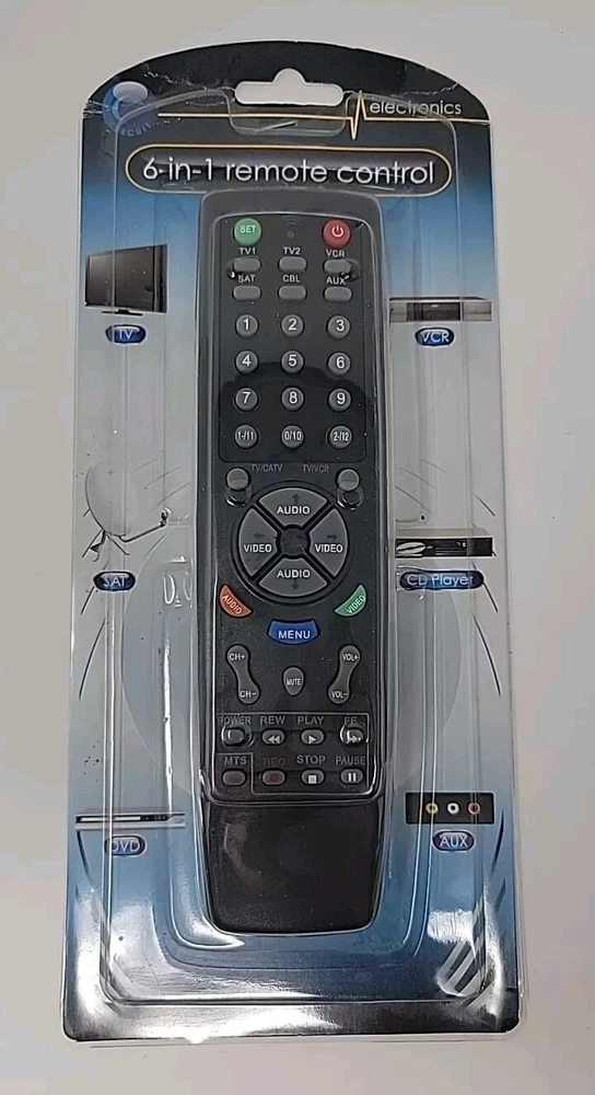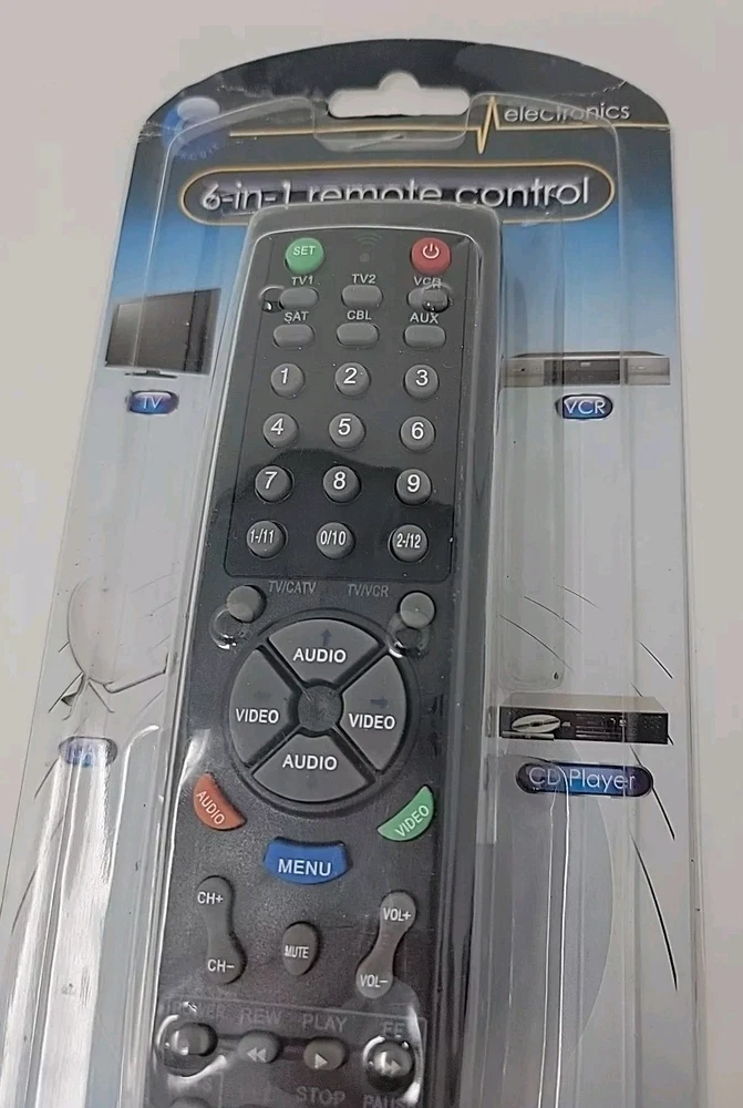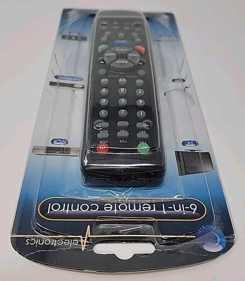 This is a Universal 6 in 1 Remote Control in Black, model number 110064. It is a wireless device compatible with various brands and models, making it a versatile option for controlling different electronic devices. The unit is made in China and comes as a single unit in its original packaging (NIB).